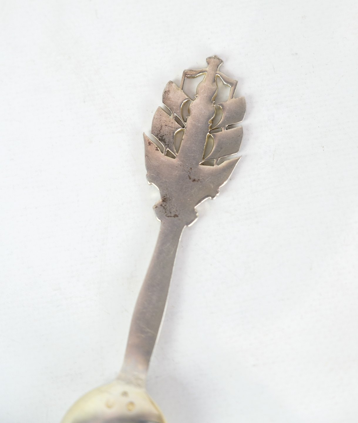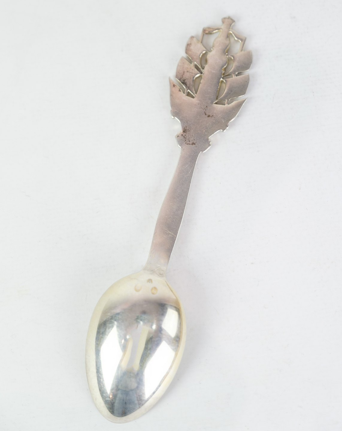 Jubilæumsske i tretårnet sølv med danske flag af meget god kvalitet. I fin brugt stand.