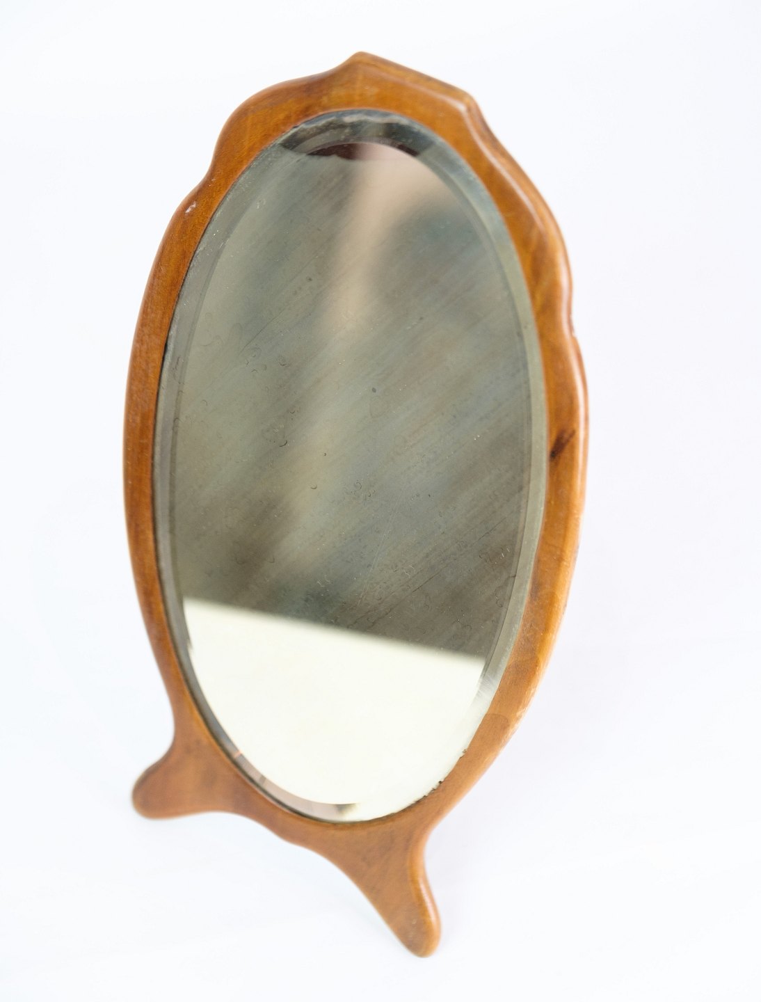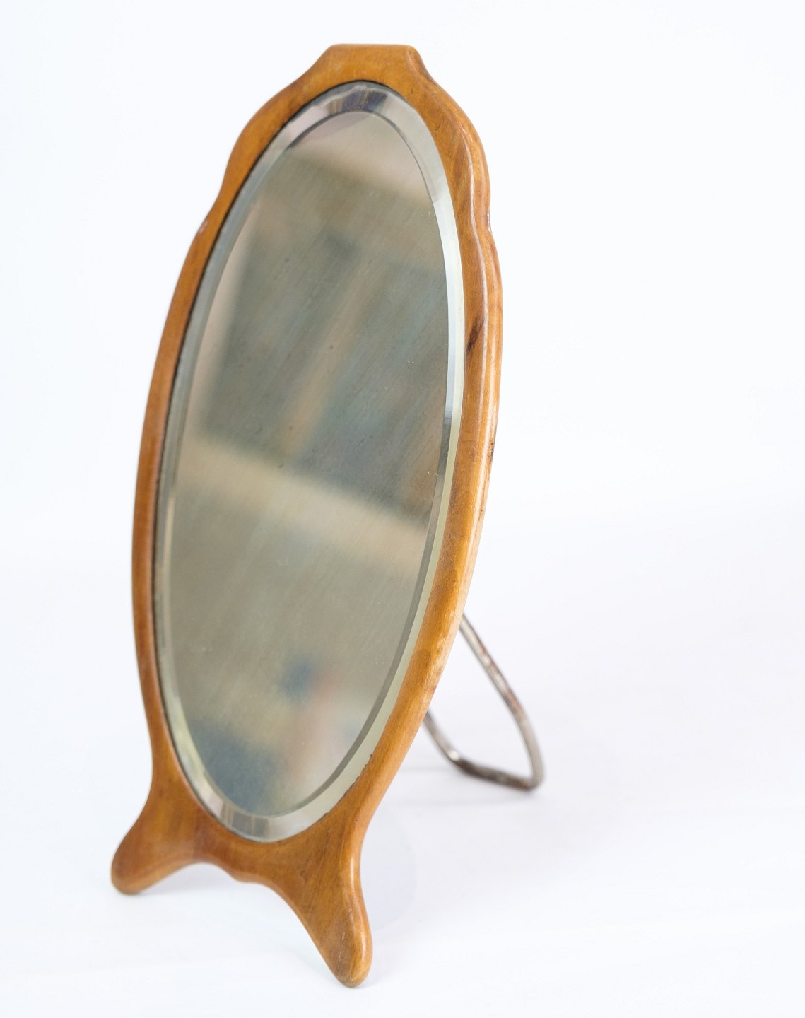 Small table mirror in walnut wood with small metal foot from around the 1880s.