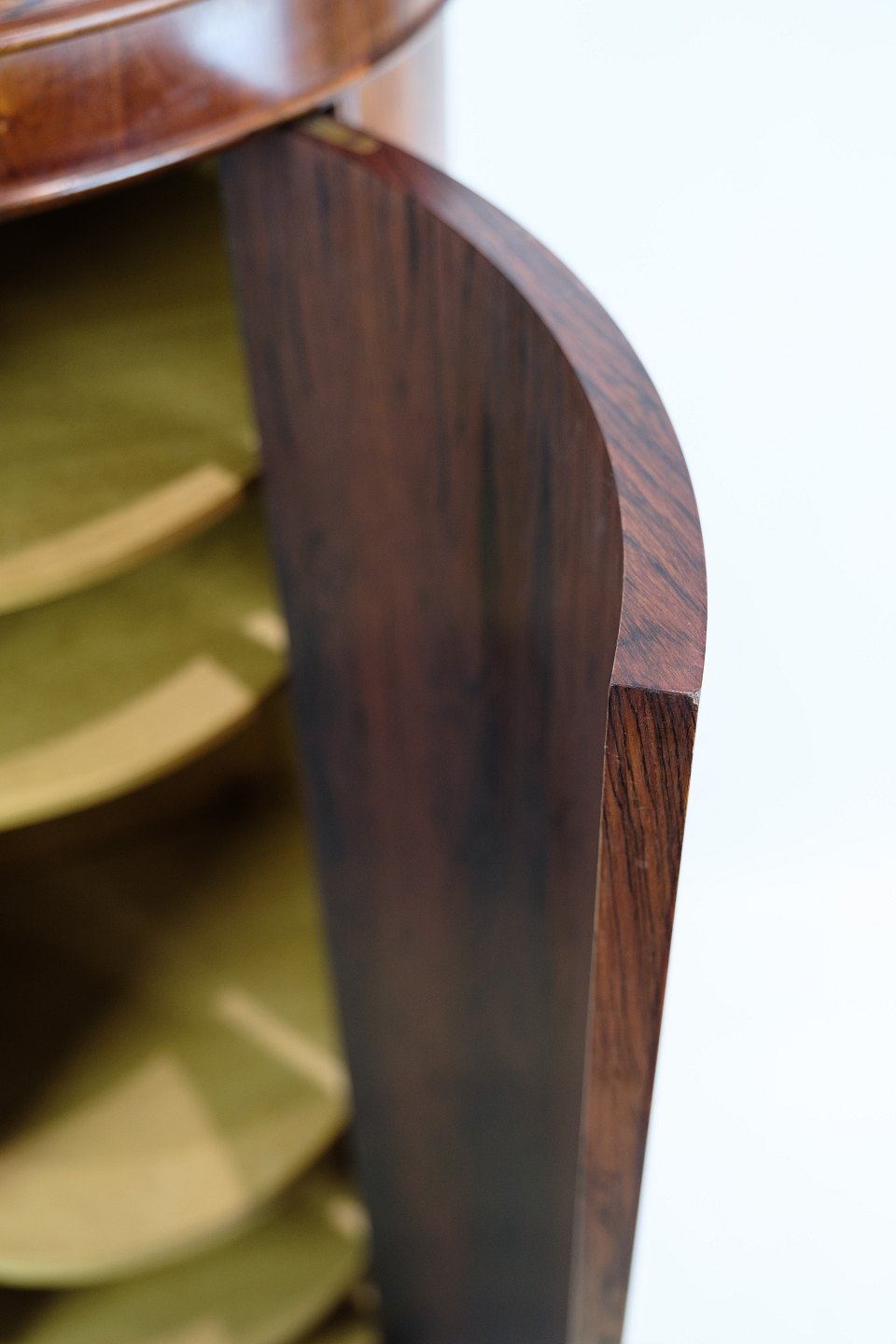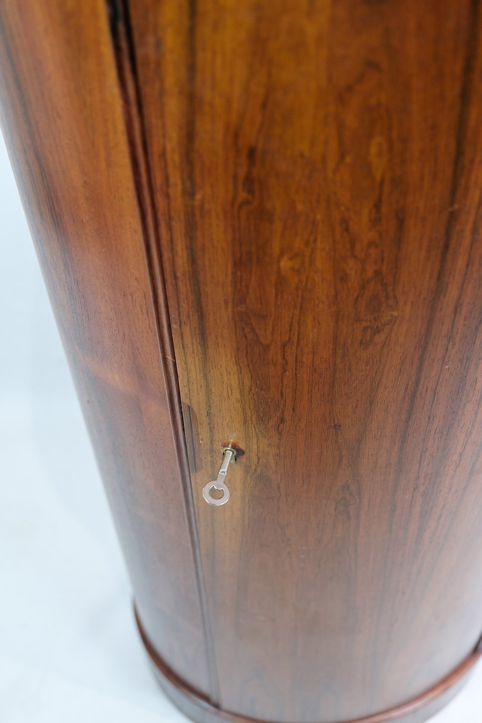 Dette smukke ovalt piedestalskab af palisander er designet af den anerkendte danske møbeldesigner Johannes Sorth, der var en del af Bornholms Møbelfabrik i Nexø i perioden fra 1955 til 1968.