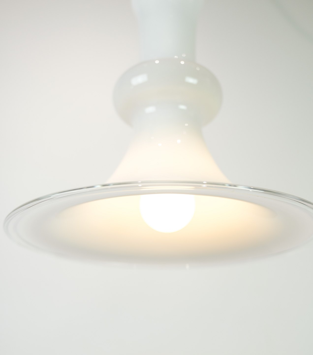 Pendel model Etude 1 er et smukt eksempel på Michael Bangs design fra 1978. Pendlen er udført i klart og hvidt opalglas og er fremstillet af Holmegaard, en af Danmarks mest anerkendte glasproducenter.