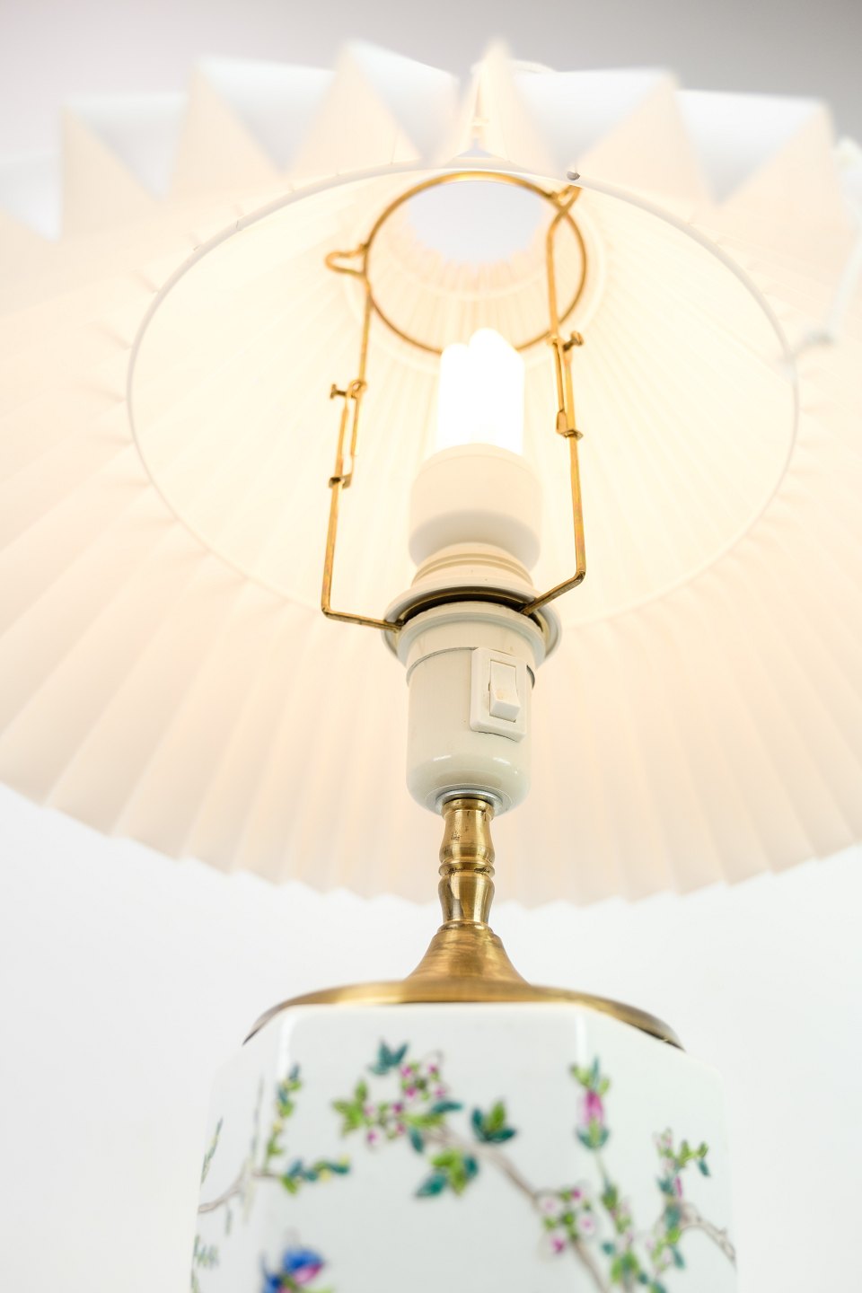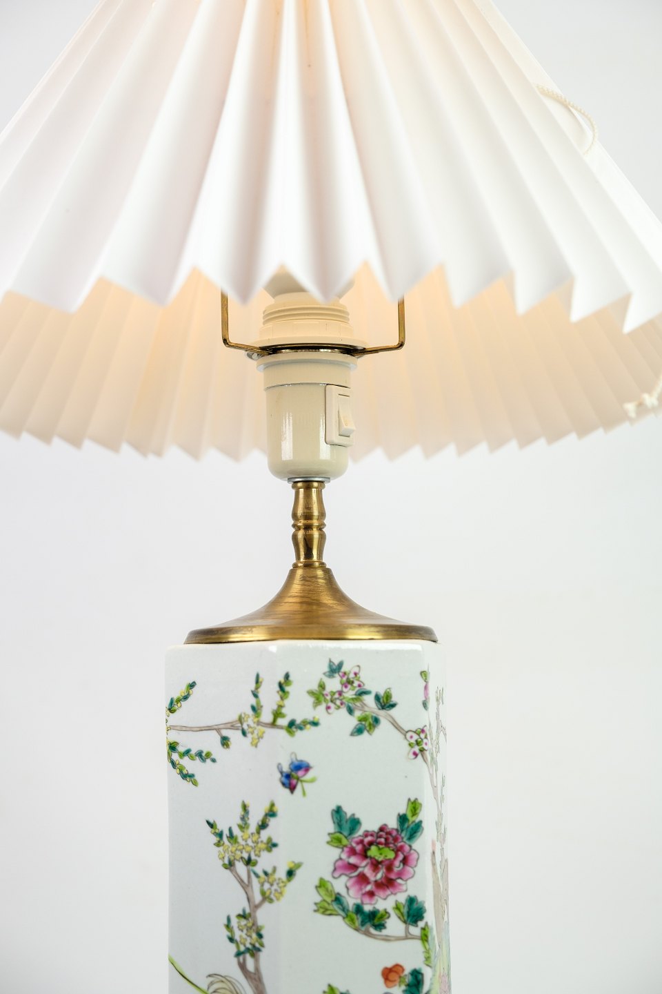 SoldA few of Chinese table lamps in porcelain with motifs of nature from the 1920s. Stands in fine used condition with a similar white screen.