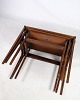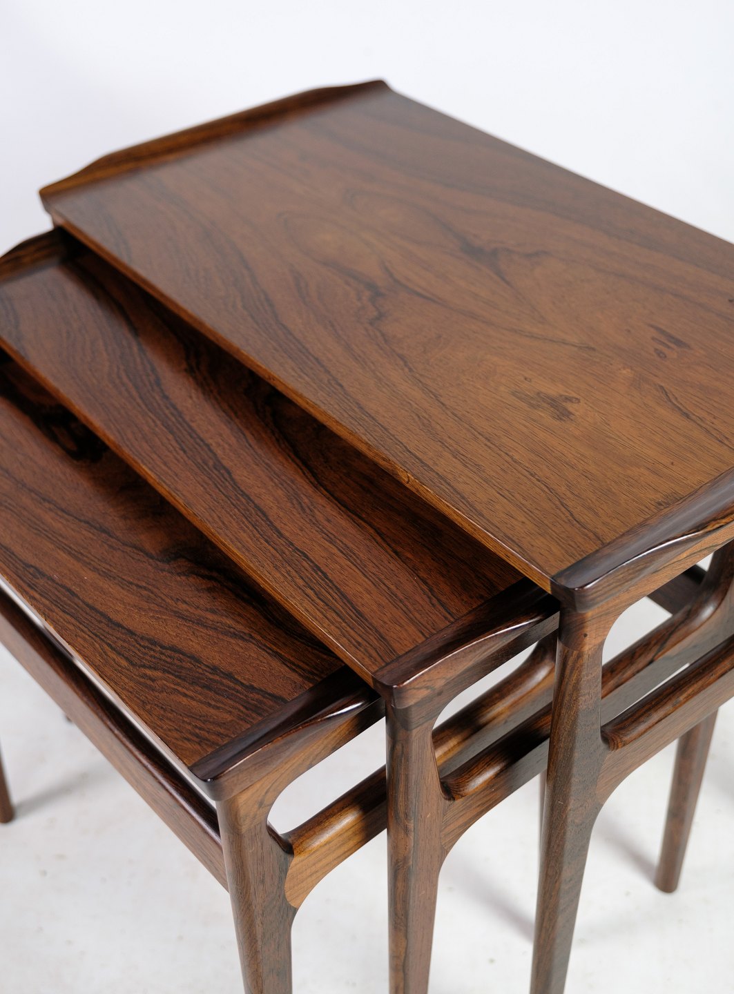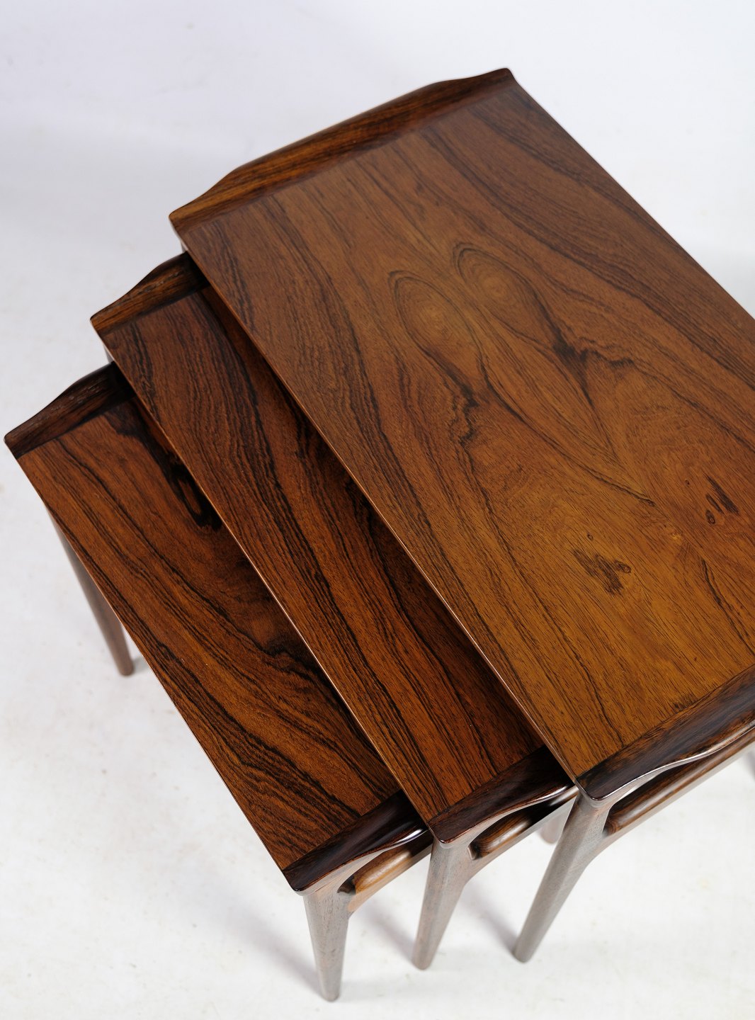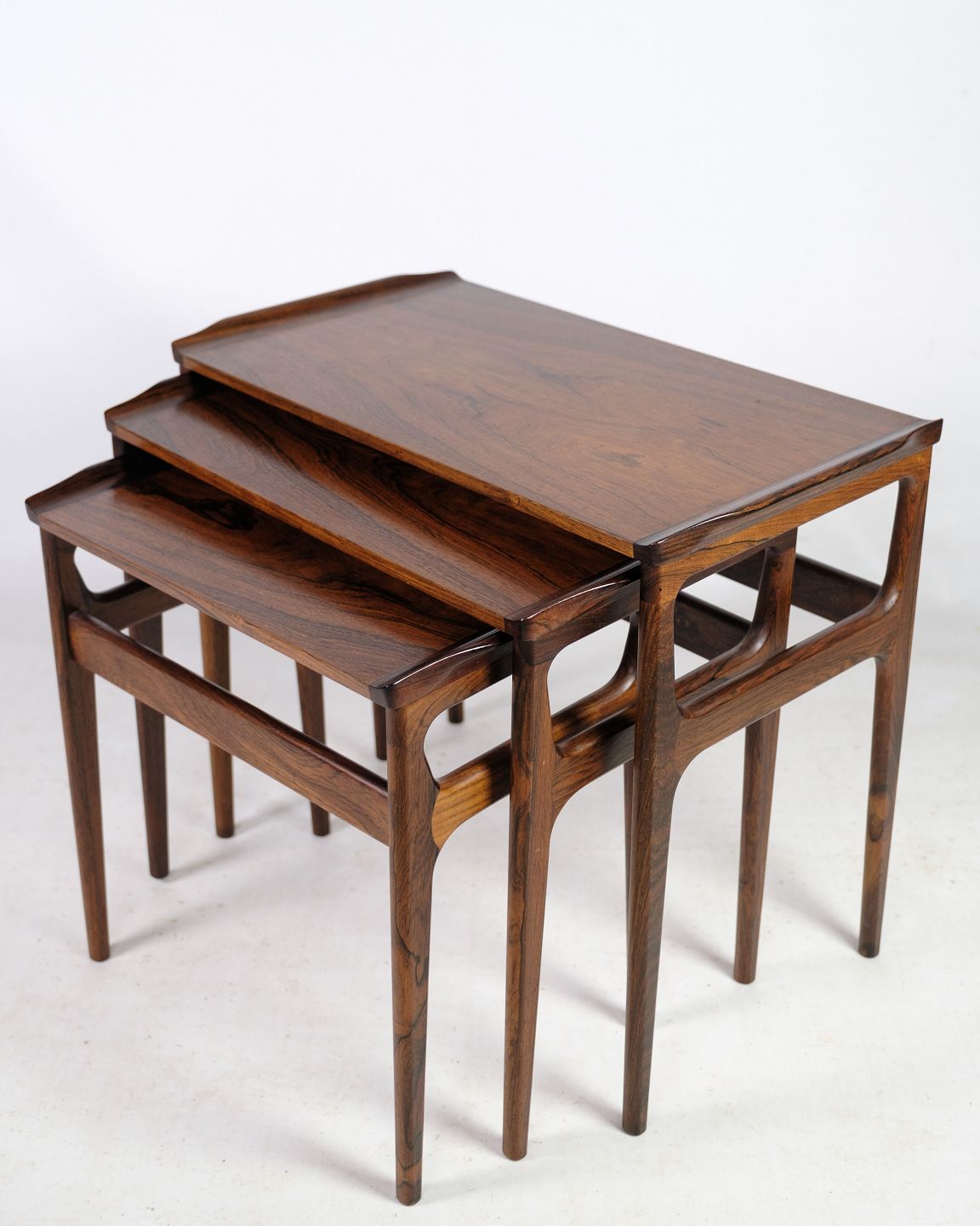 Dette sæt indskudsborde af palisander er et smukt eksempel på dansk møbeldesign fra 1960'erne. Bordene er fremstillet af Heltborg Møbler, en af Danmarks mest anerkendte møbelfabrikker fra perioden.