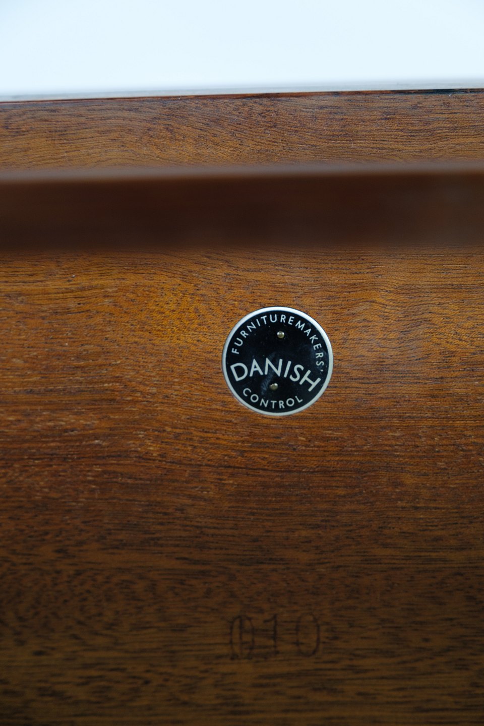 Bordene har fine finerede bordplader med massive kanter, som er en karakteristisk detalje for 1960'ernes designstil.