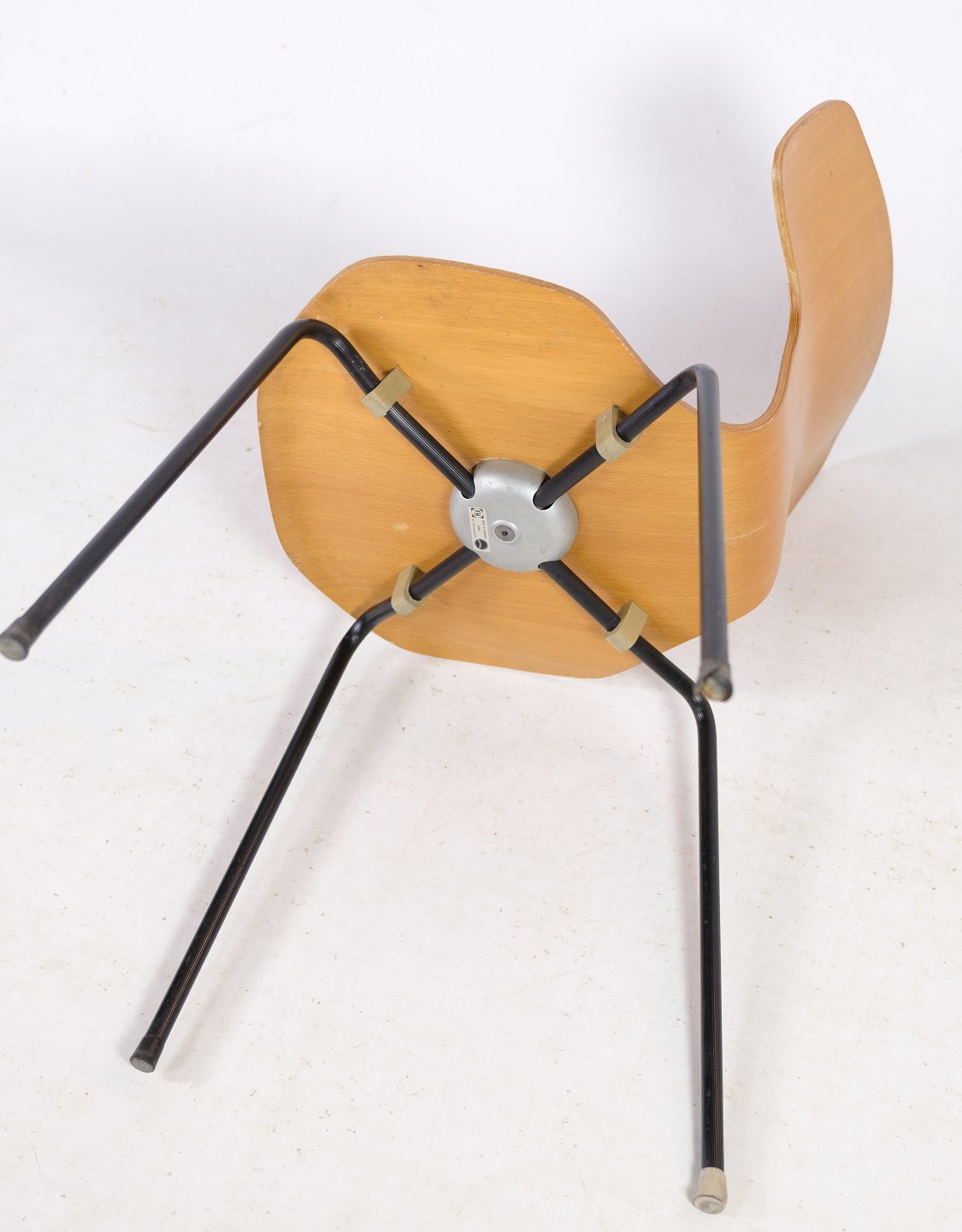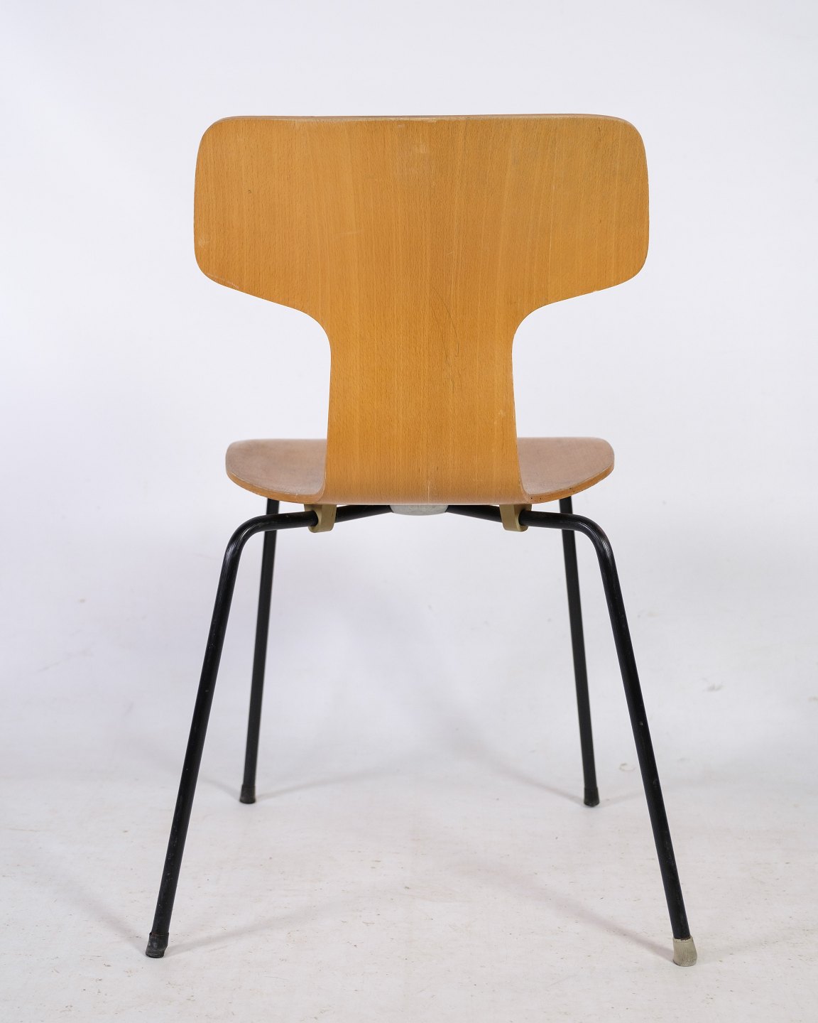 Set of four, model 3103, 'T-chair', by Arne Jacobsen 1902-1971 with bent veneered oak shell, black grooved rubber-wrapped steel tube frame. Manufactured at Fritz Hansen, 1960s. early model. Has traces of use, marks, edge wear. Can be made in a workshop before purchase. Send us a message. More sets in stock