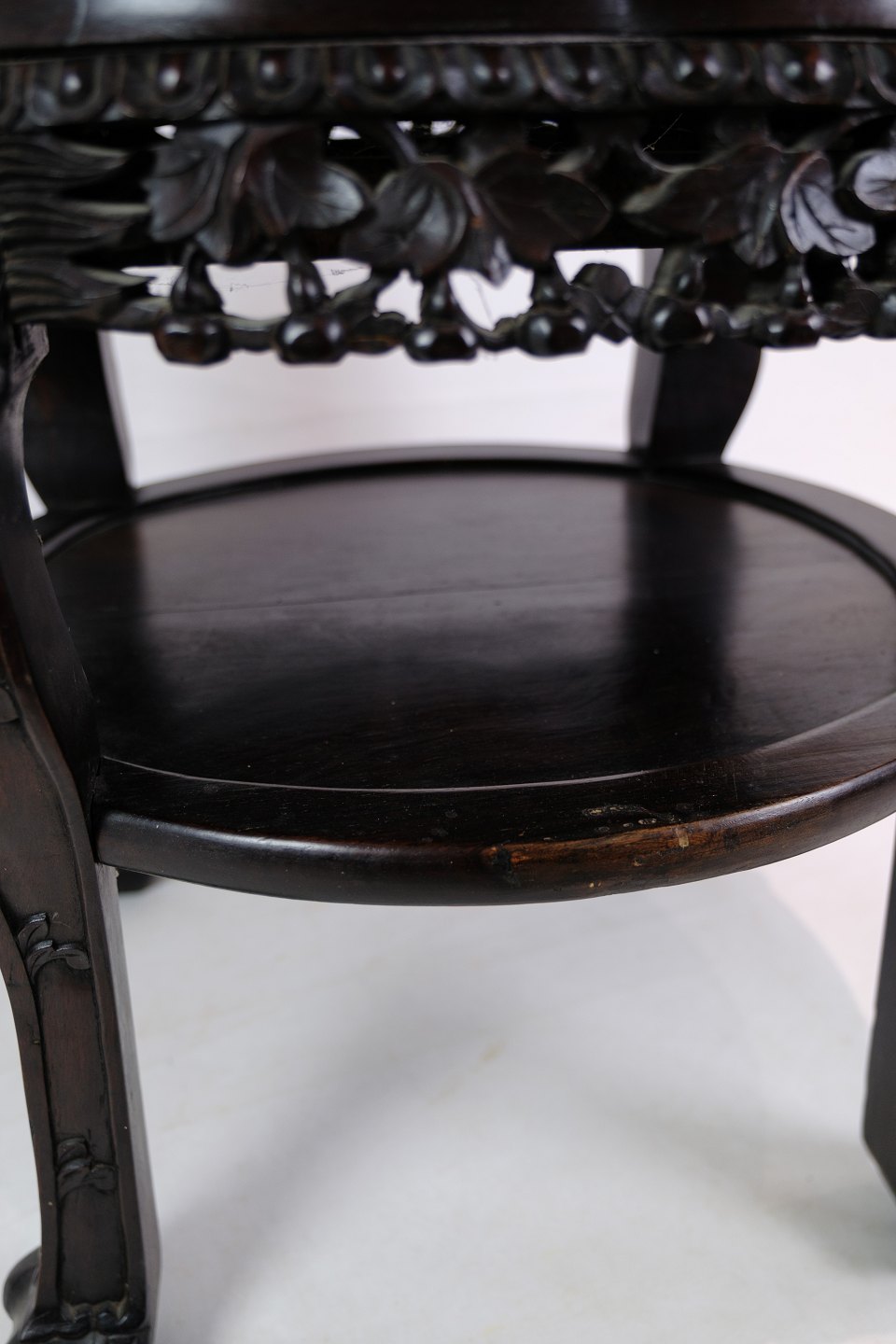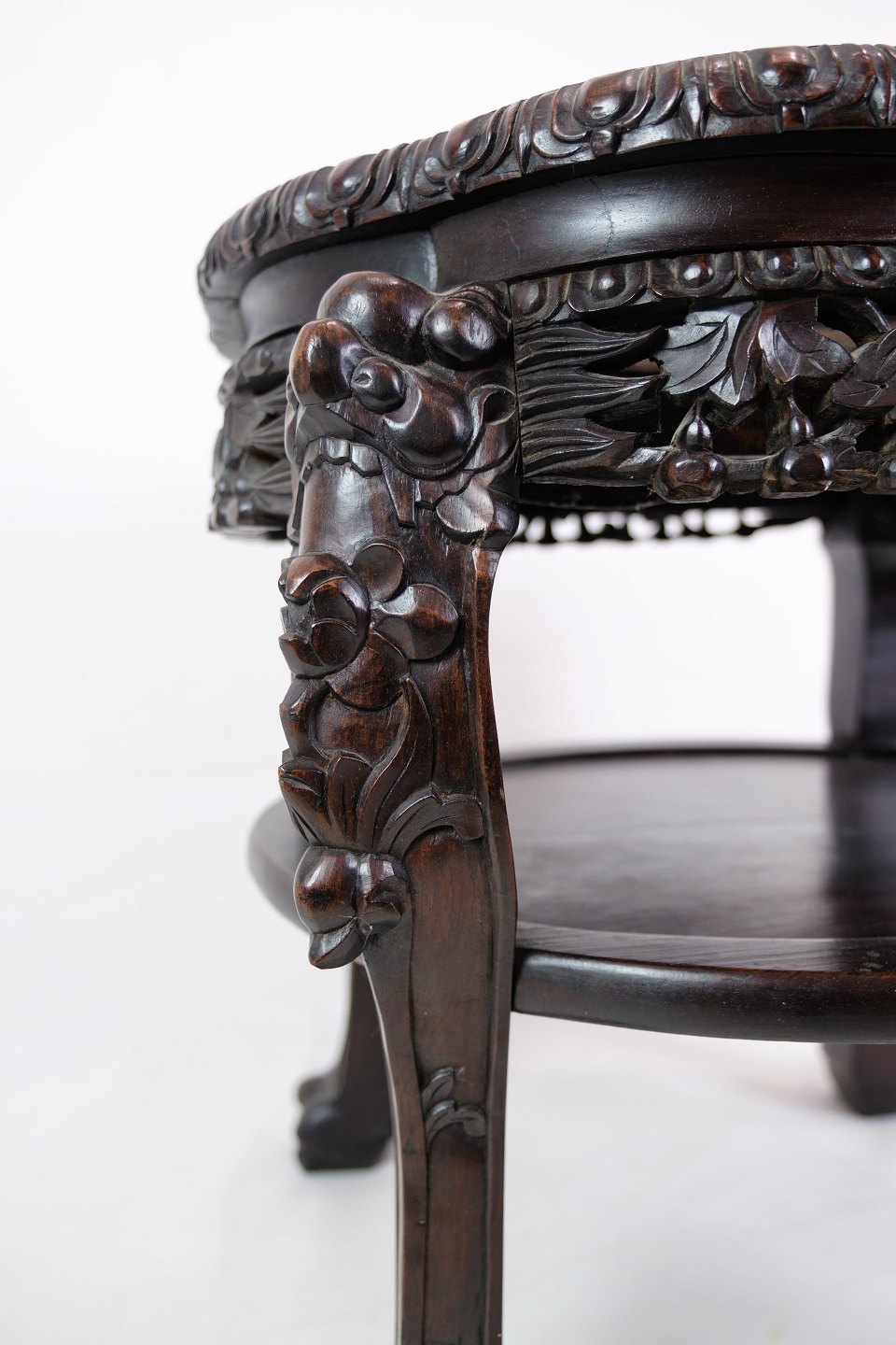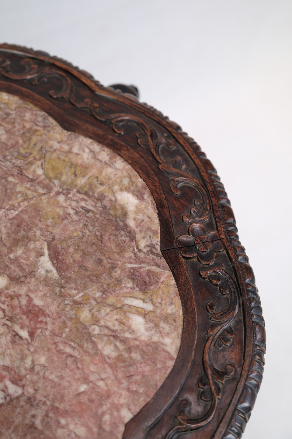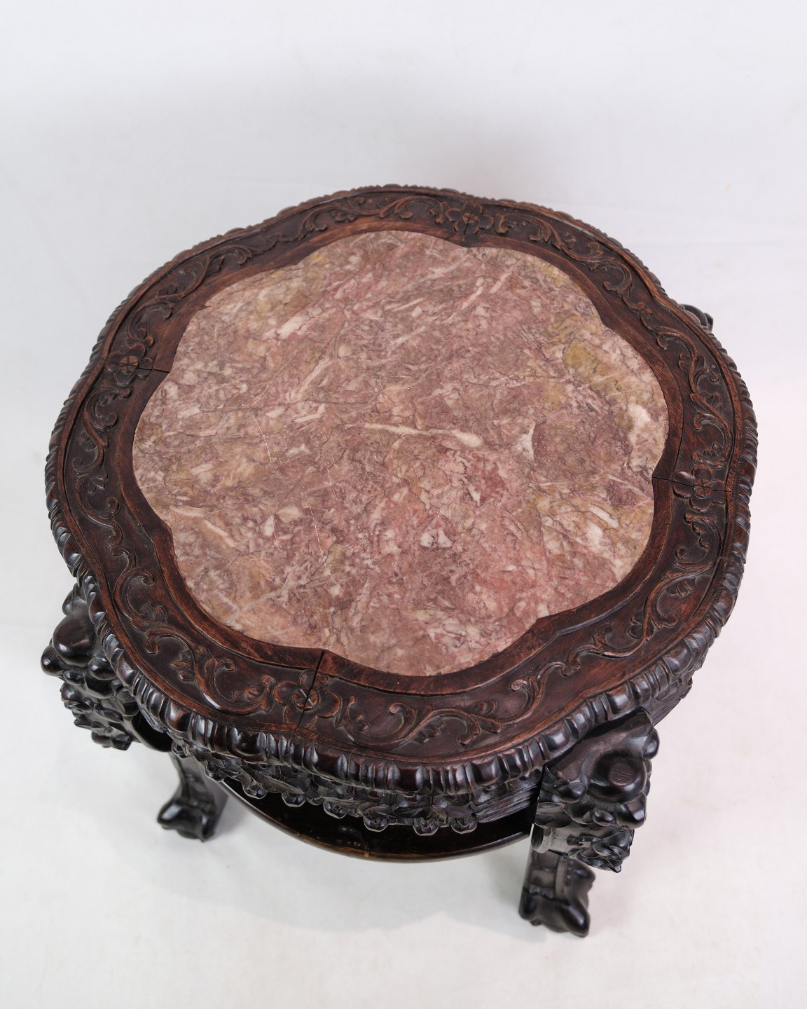 SoldSmall Chinese lamp / side table with fine detailed carvings of high quality with reddish marble top from around 1920s.