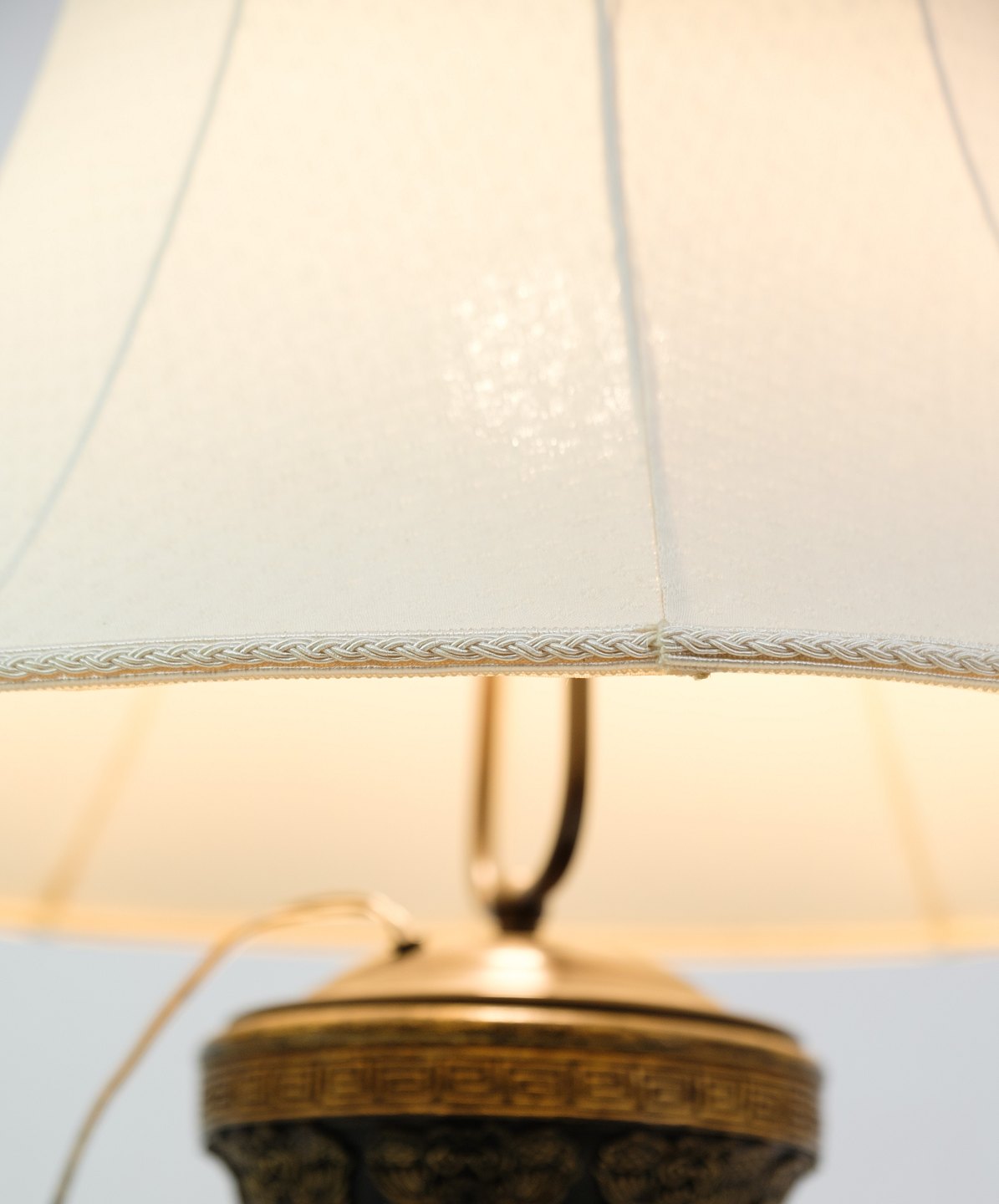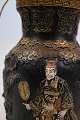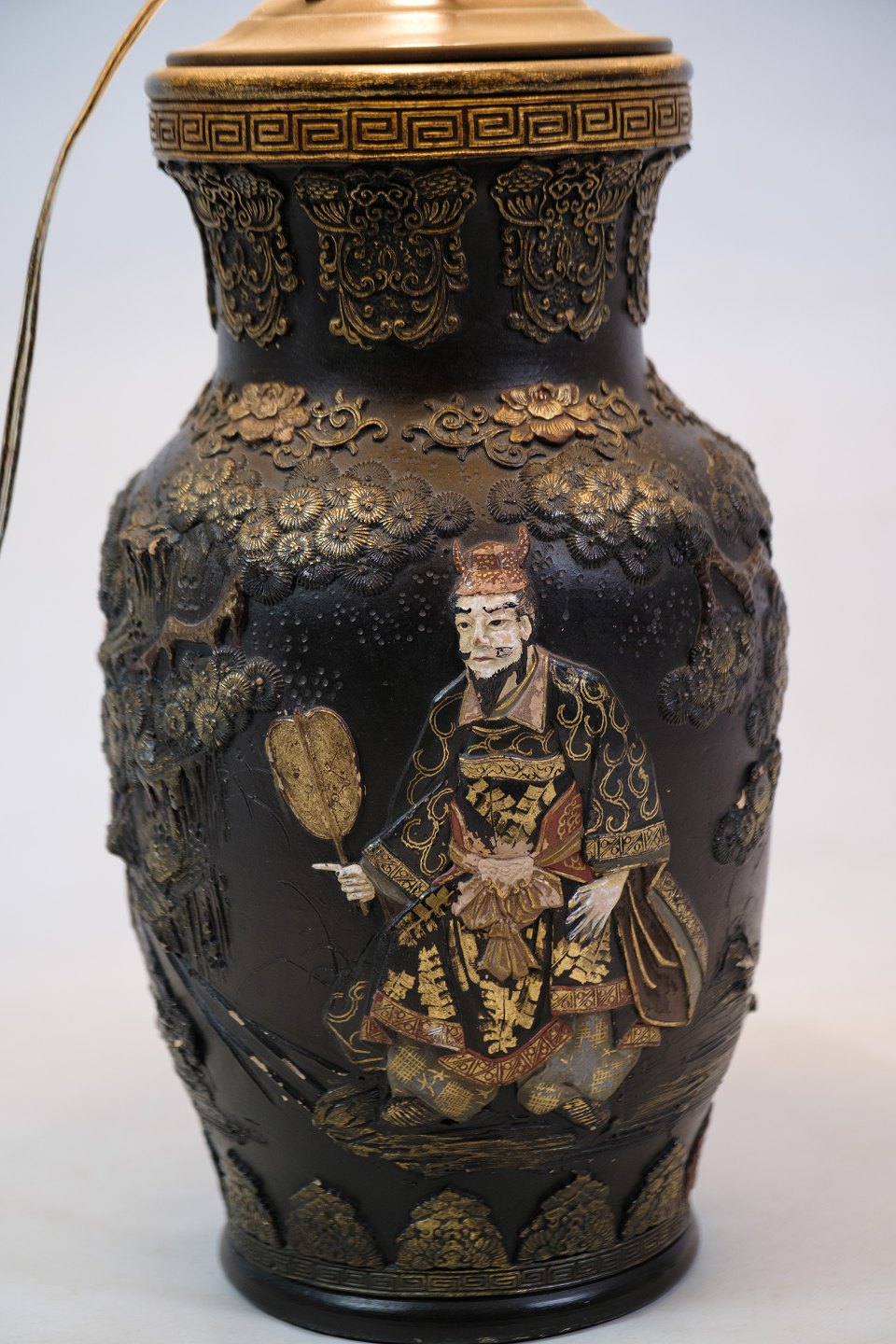 Chinese lamp with fine detailed carvings and motif from around the 1920s. Lamp shade included.