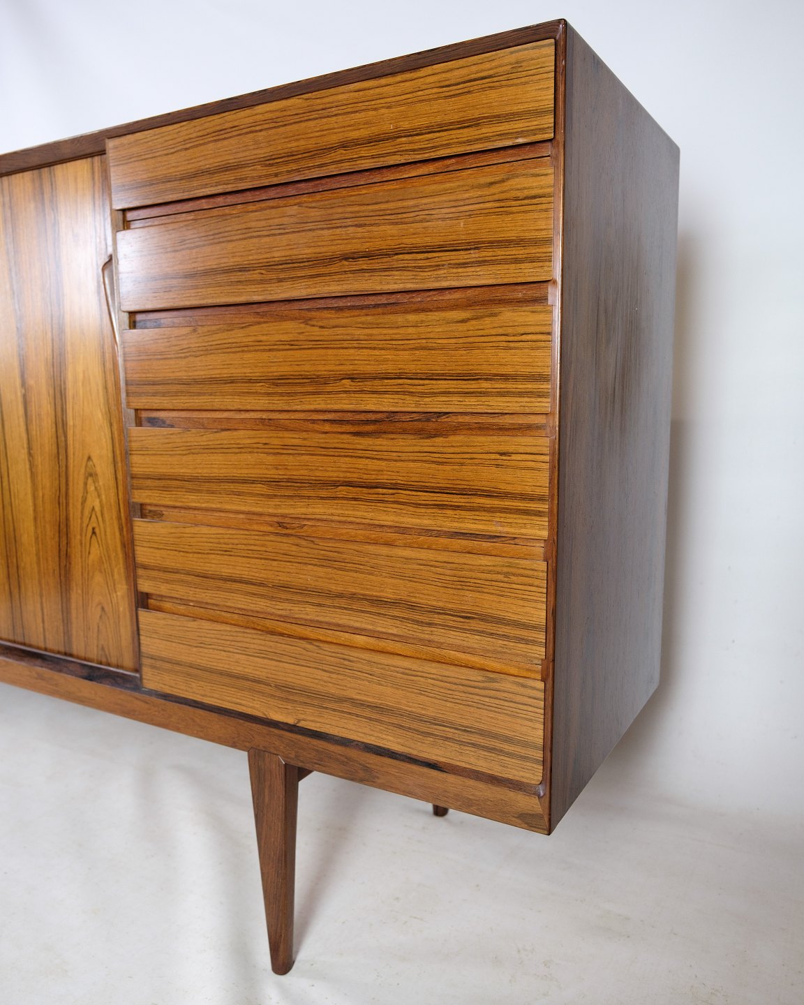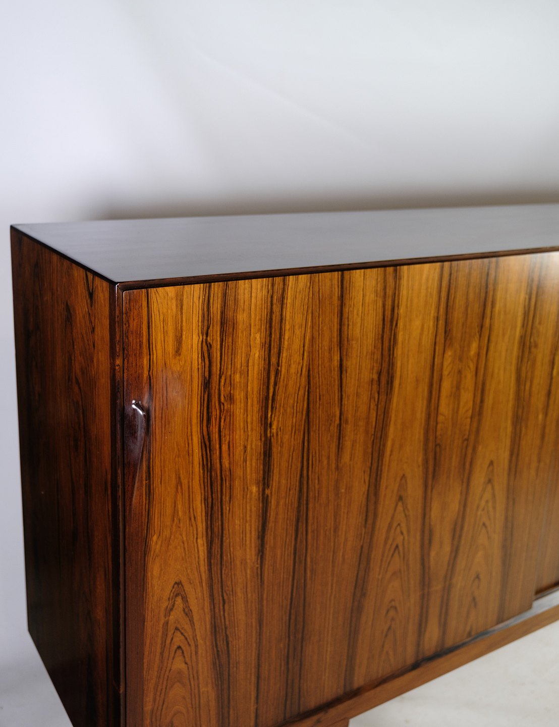 The sideboard in rosewood, designed by Henry Rosengren Hansen and produced by Brande Møbelindustri in 1960, is a splendid example of Danish furniture art from the middle of the 20th century. This sideboard exudes a timeless elegance with its beautiful rosewood, giving a warm and luxurious atmosphere to any room.