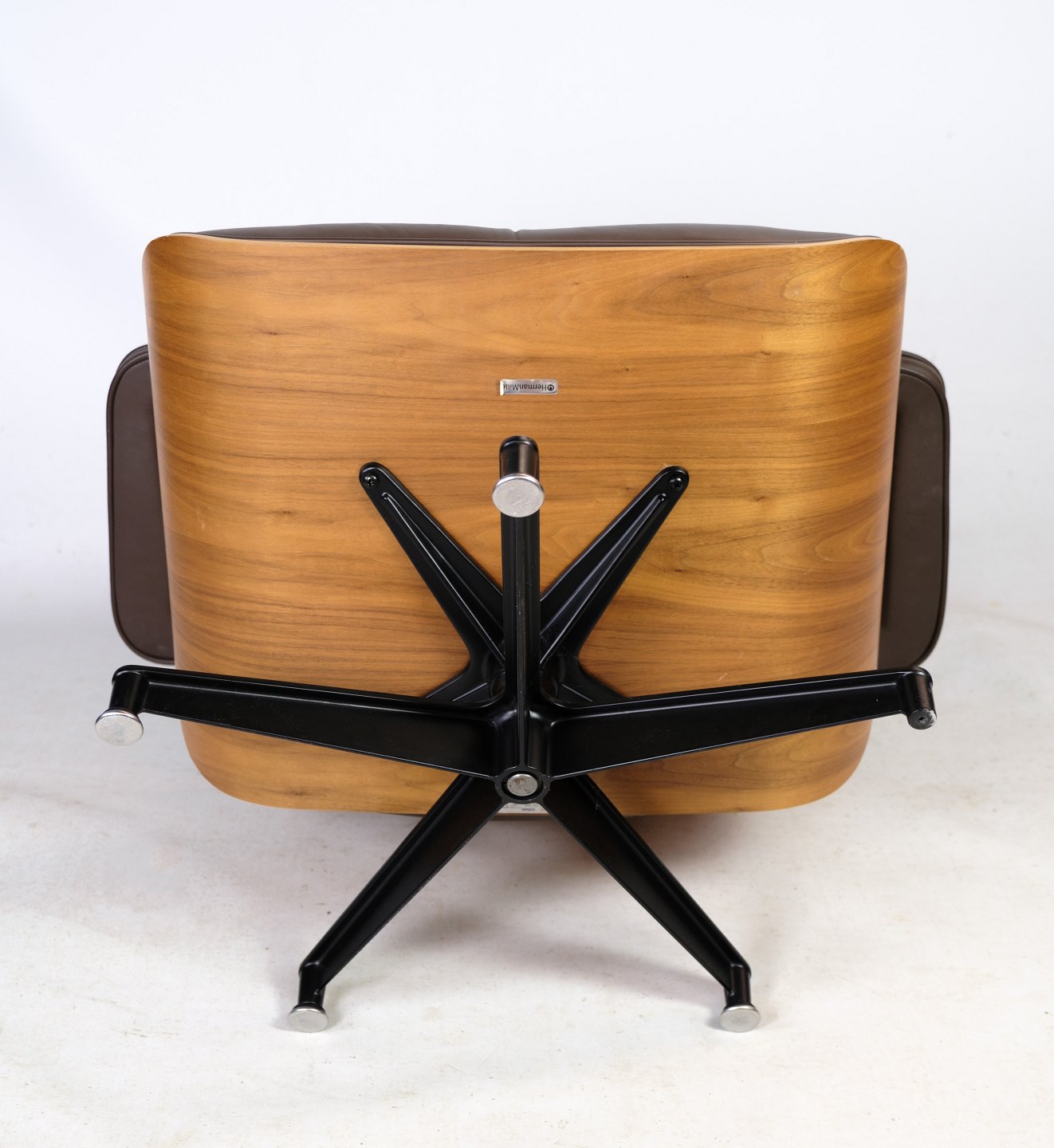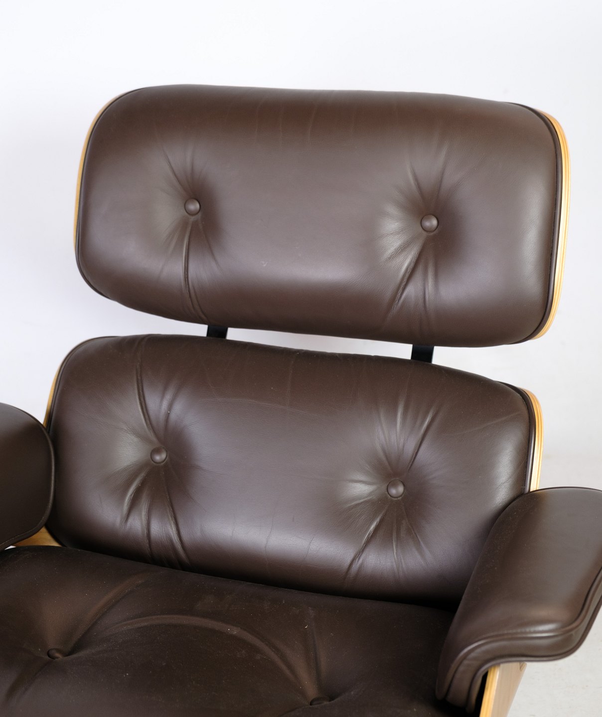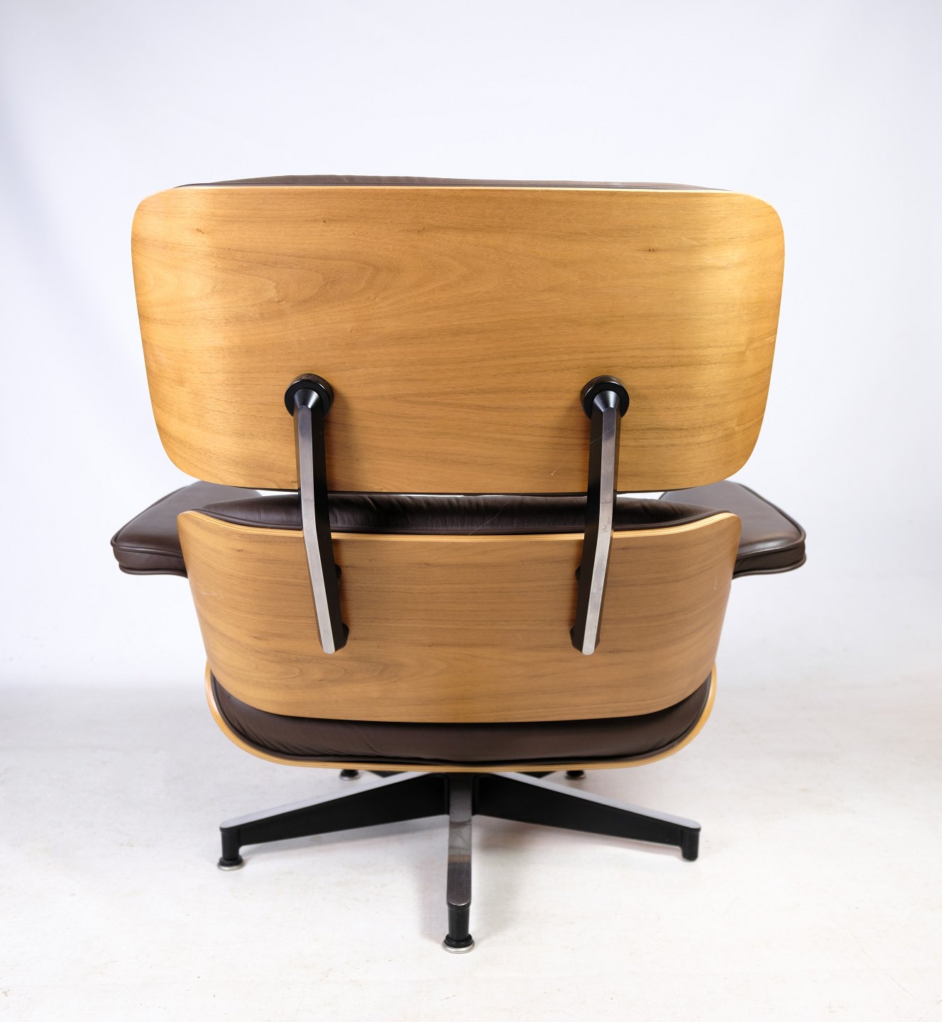 Charles Eames Lounge chair i brunt læder og lys valnød produceret af Herman Miller formgivet i 1958 og produceret i 2007.