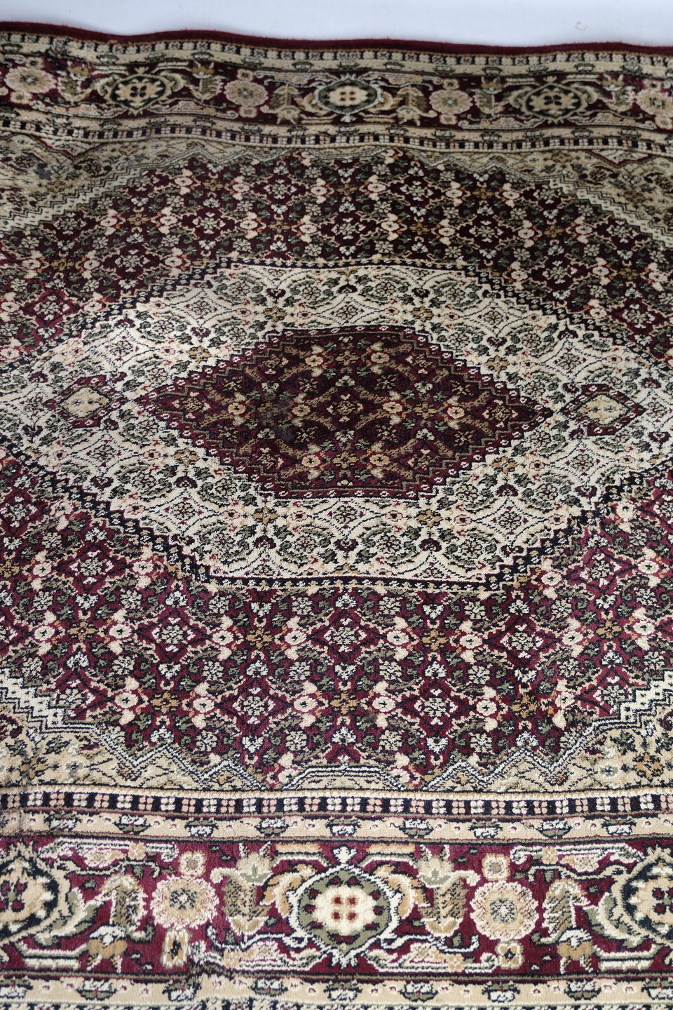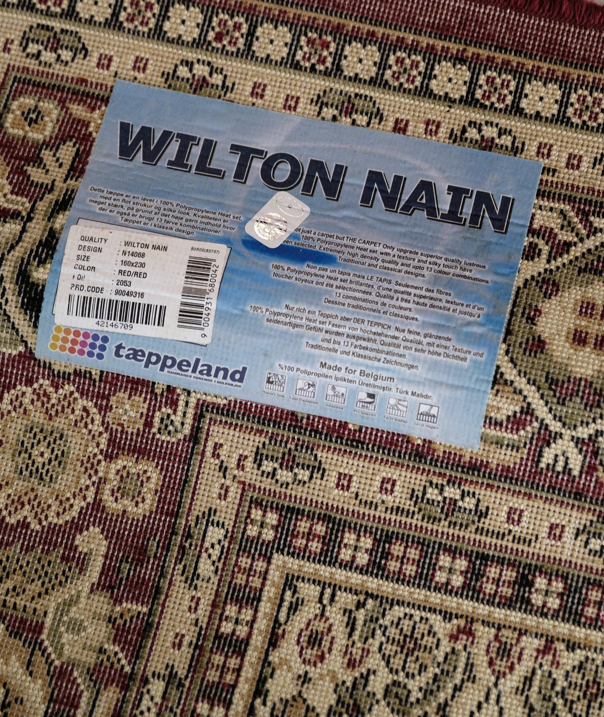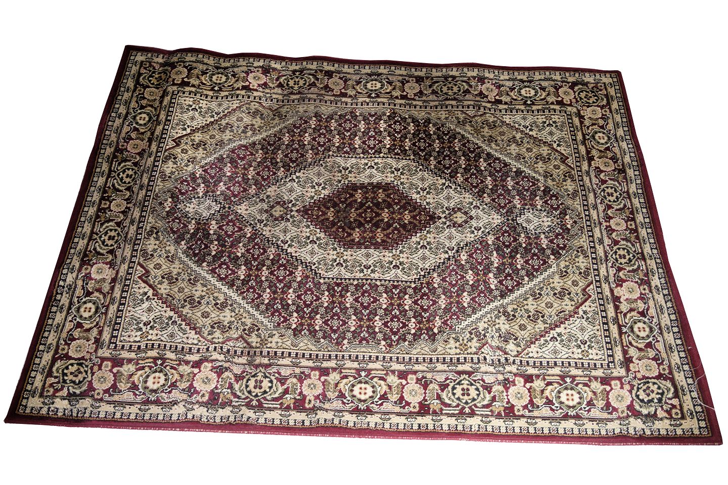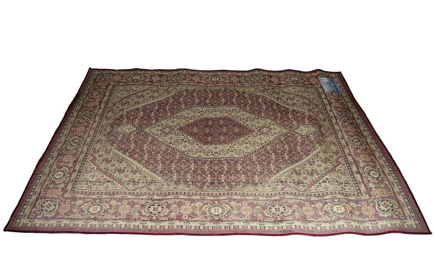 Et ægte persisk tæppe fremstillet i hånden mønstret og indfarvet med rødlige farver i midten.