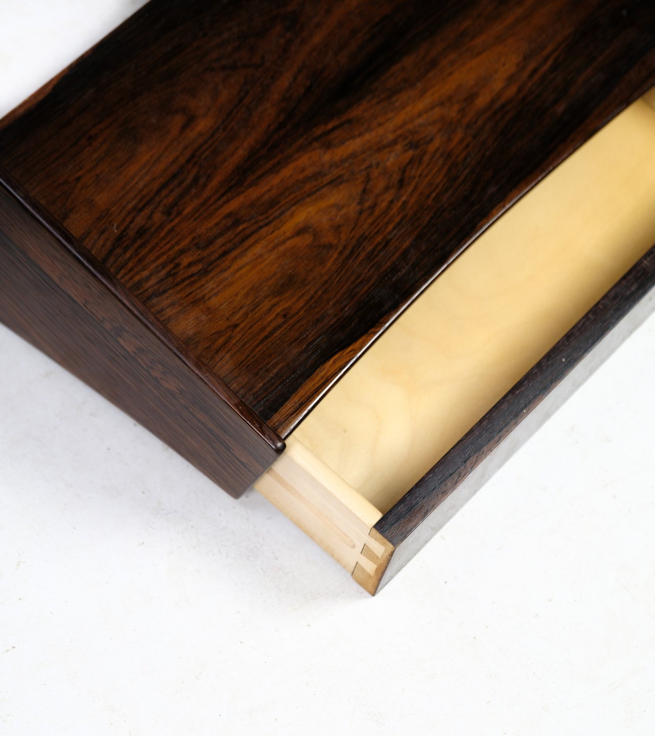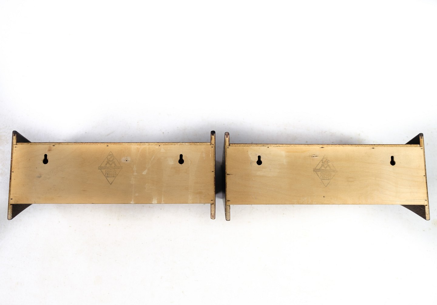 A set of wall-hung bedside tables in rosewood with drawers appears with stamps of Ølholm Møbelfabrik, Horsens from around the 1960s.
