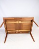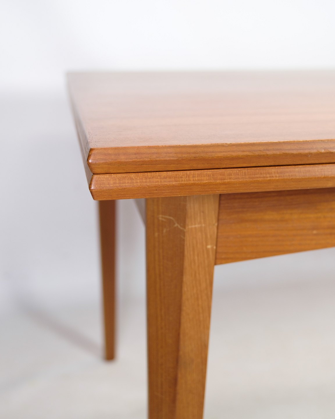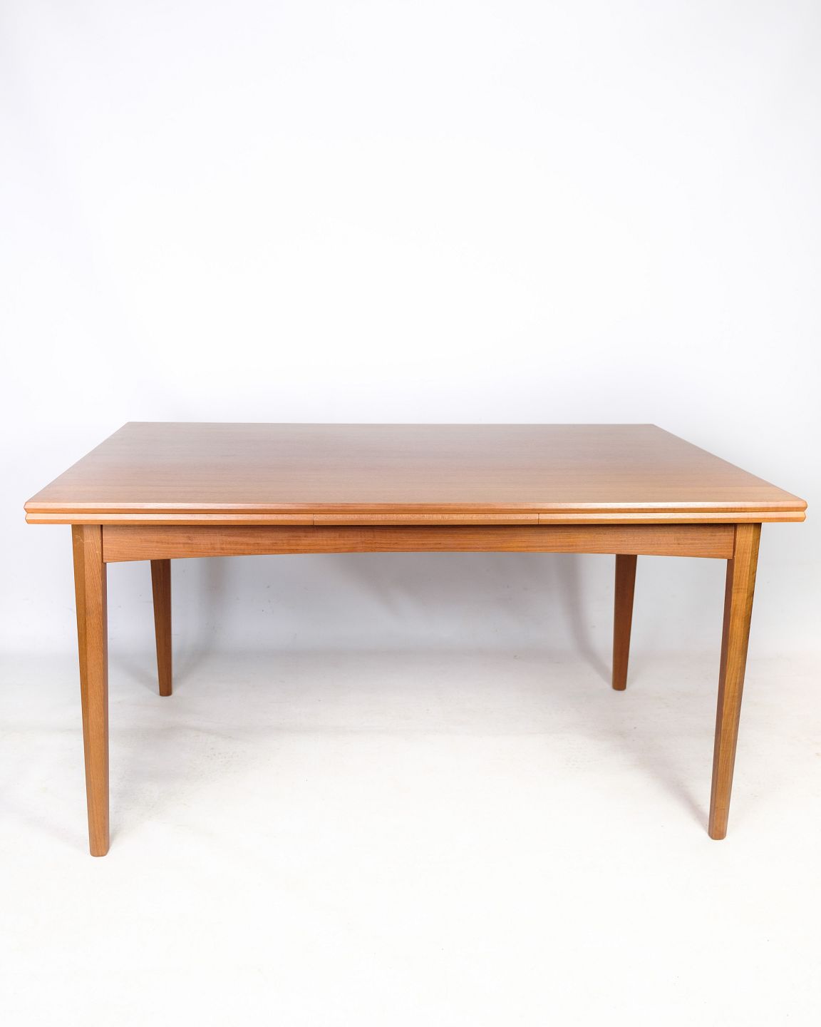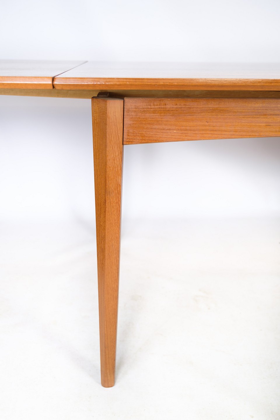 Dette spisebord i teak er et smukt og funktionelt møbel i dansk design fra 1960'erne. Bordet er lavet af højkvalitets teaktræ, som er kendt for sin holdbarhed og naturlige skønhed. Designet omfatter et hollandsk udtræk, som giver mulighed for at forlænge bordet, når der er brug for mere plads til at sidde.