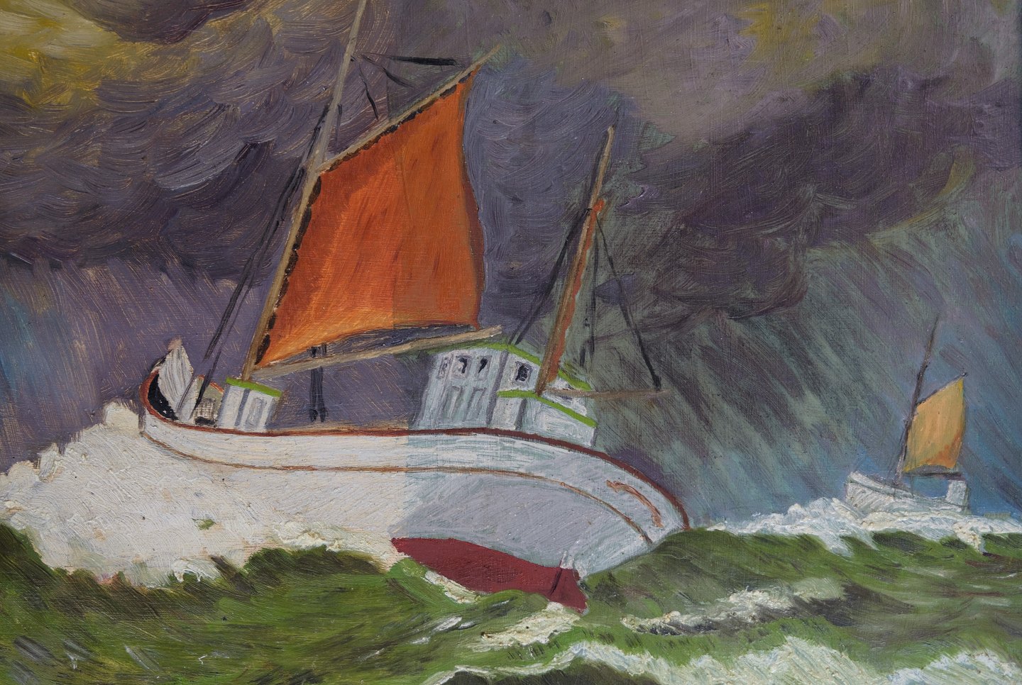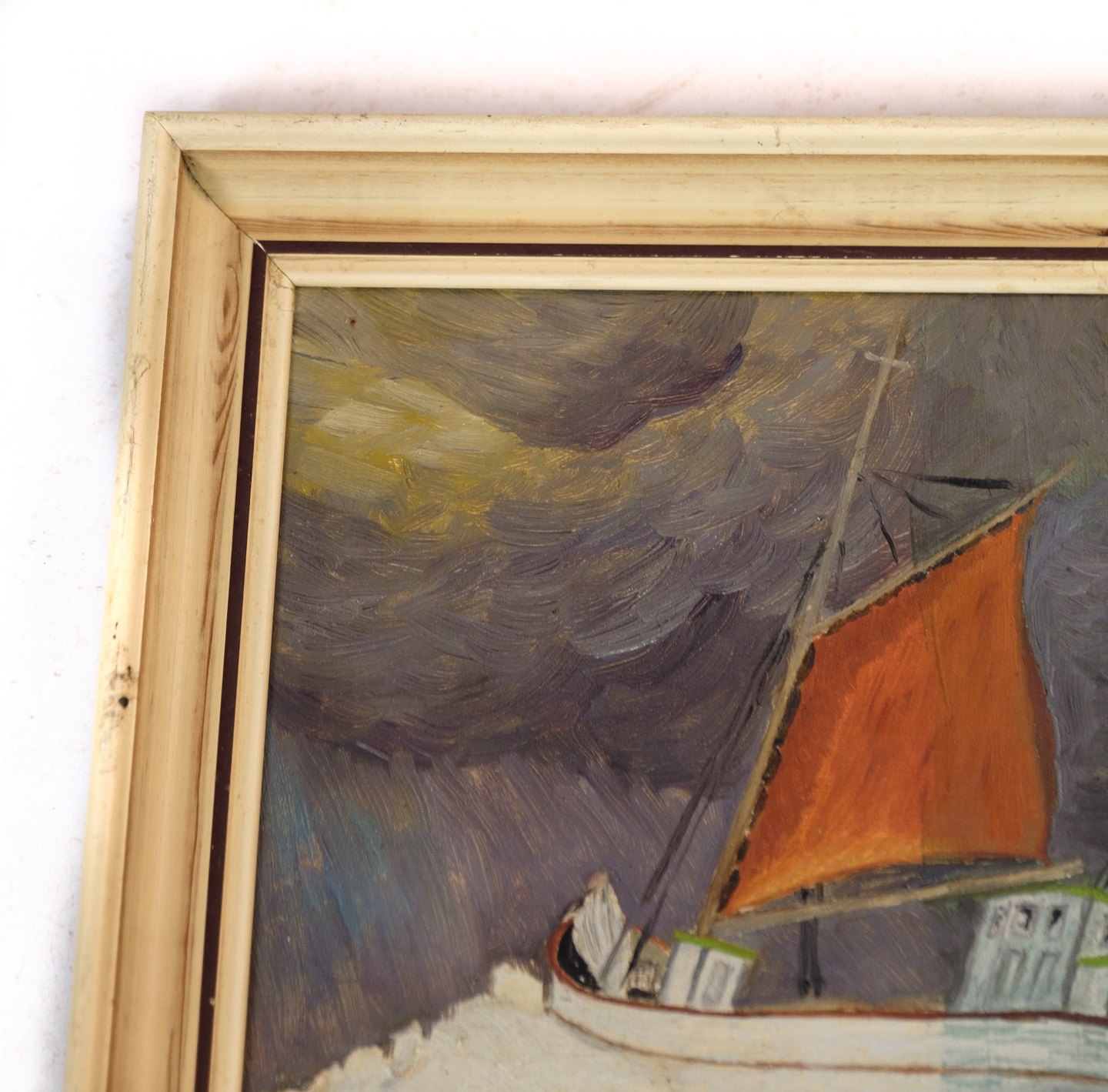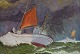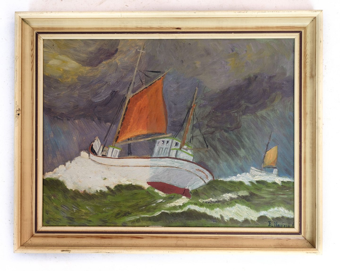 Maleri på lærredet i guldramme med marine motiv i røde og blå farver, signeret E. Hansen fra omkring 1930'erne