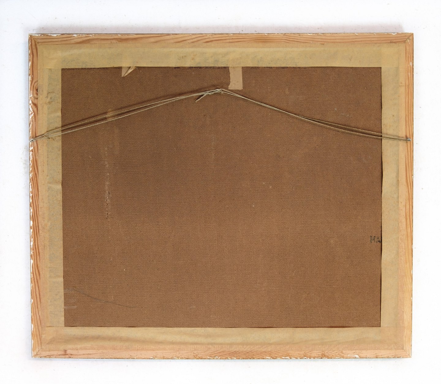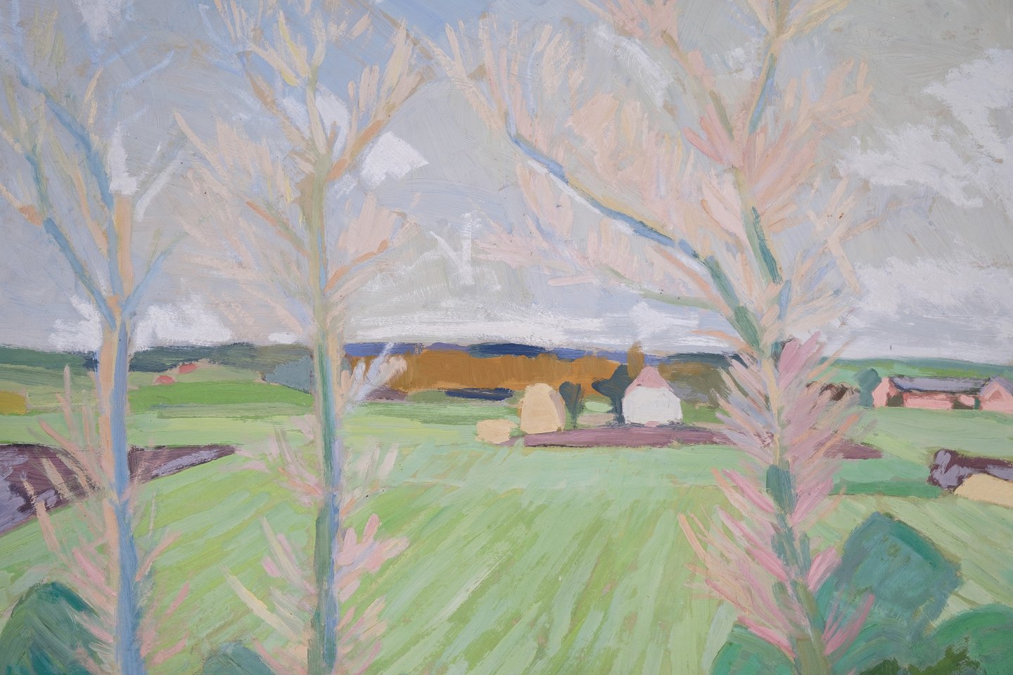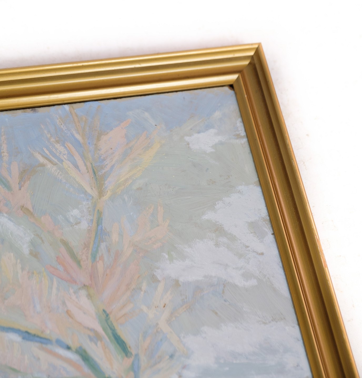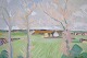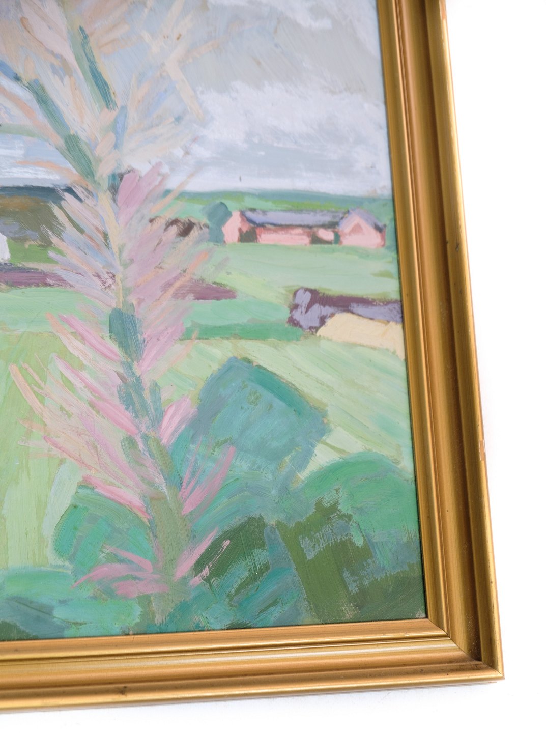Maleri på træplade i guldramme af landbrug i grønne farver fra omkring 1930'erne.