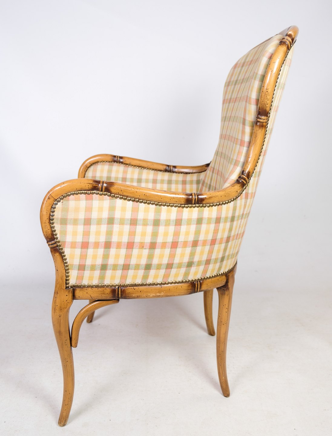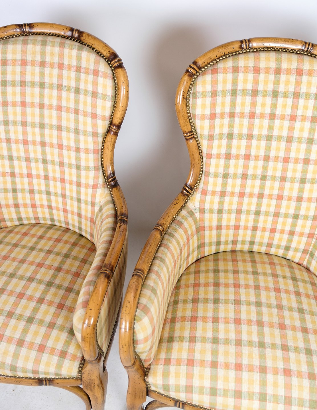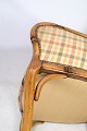 Et par af to lænestole i ternet stof med stel af træ fra omkring 1920'erne.