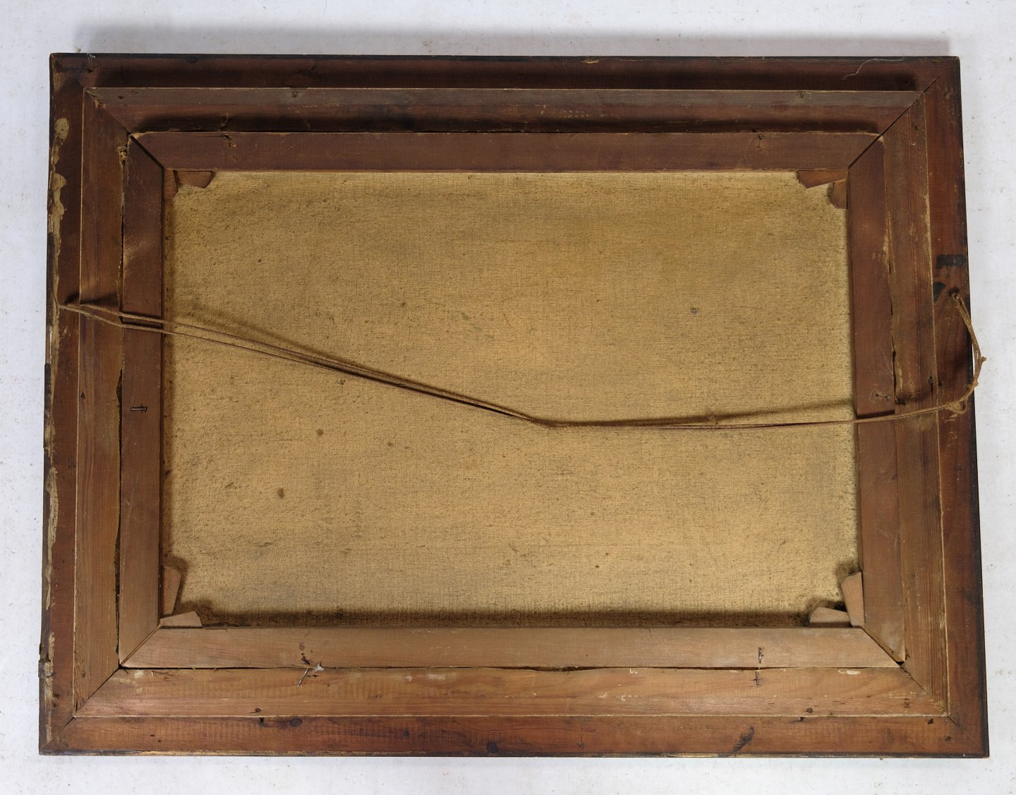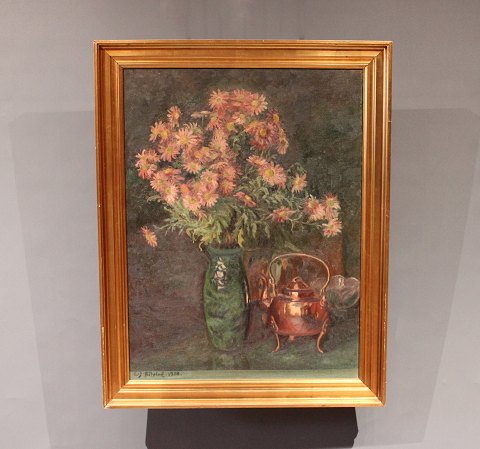 Maleri på lærredet i guldramme af landskabs motiv med bondehus fra omkring 1930'erne. Signerede V. Pedersen