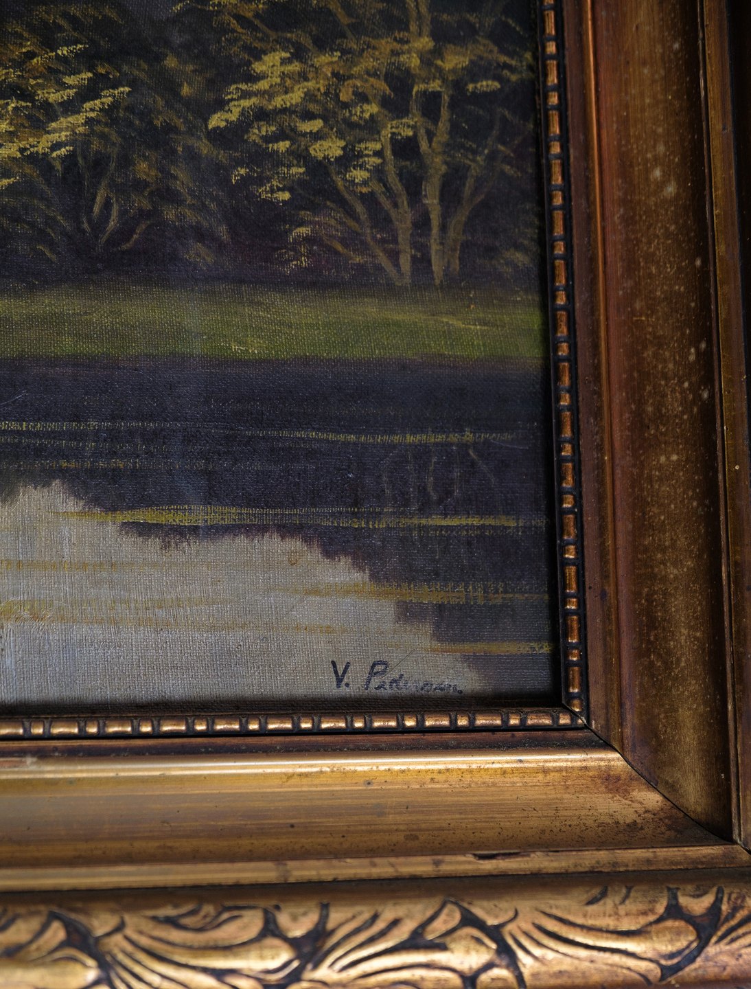 Maleri, lærredet, guldramme, Signerede V. Pedersen, landskabsmotiv, 1930, 62x82