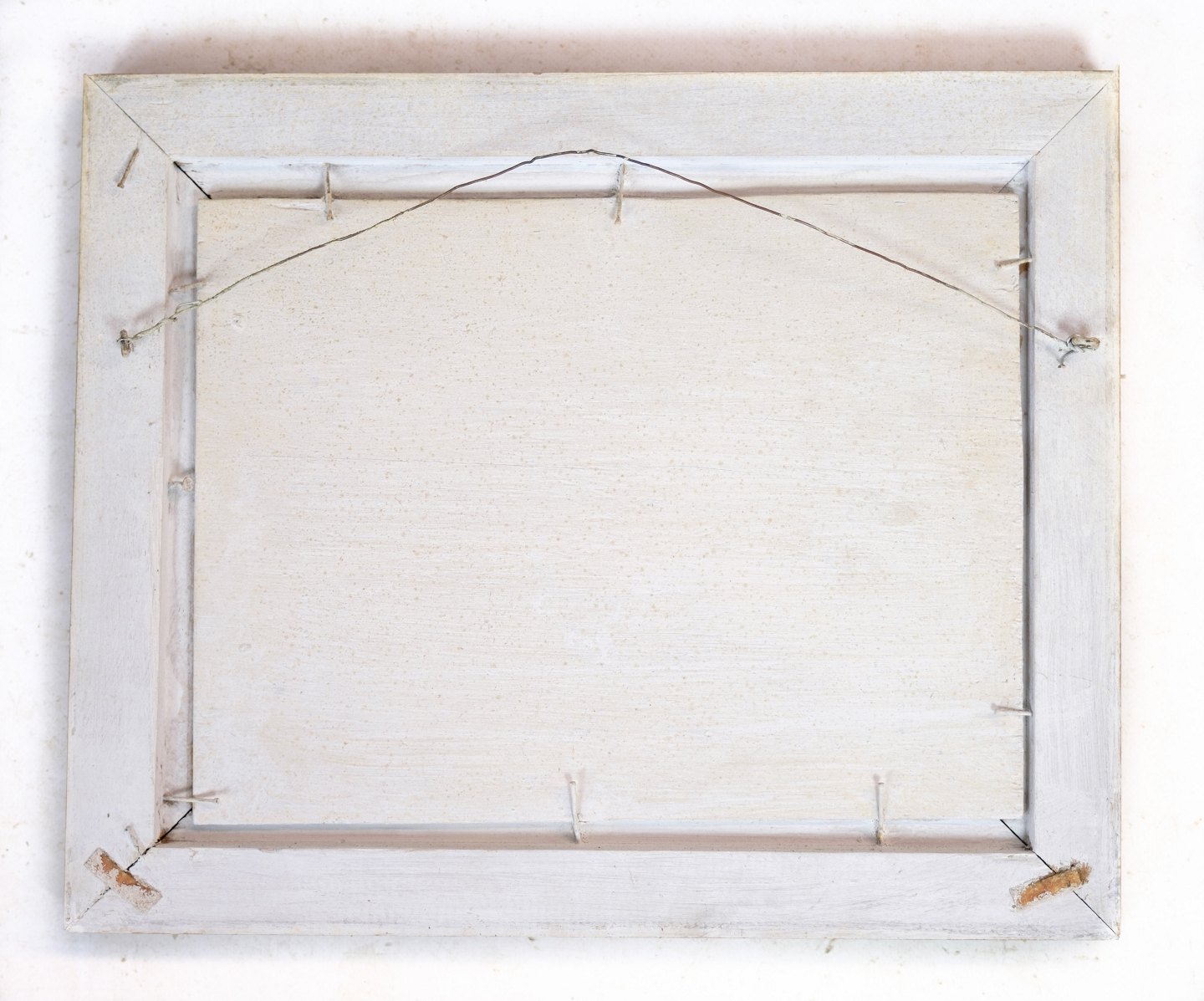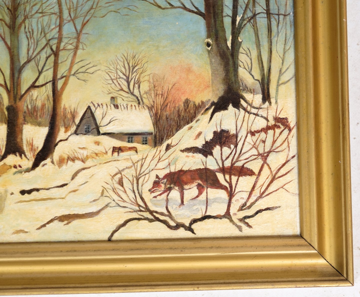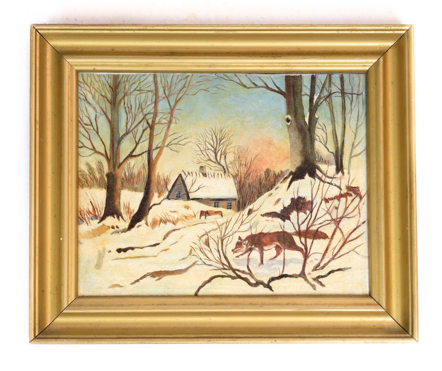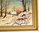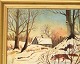 Painting on canvas in gold frame of small houses and landscape with snow from around the 1930s