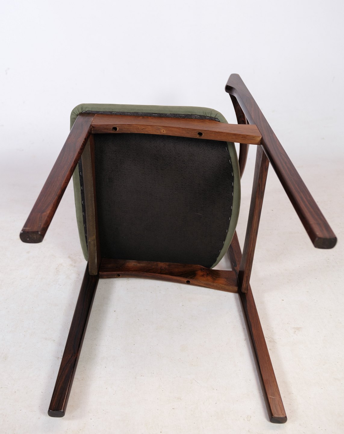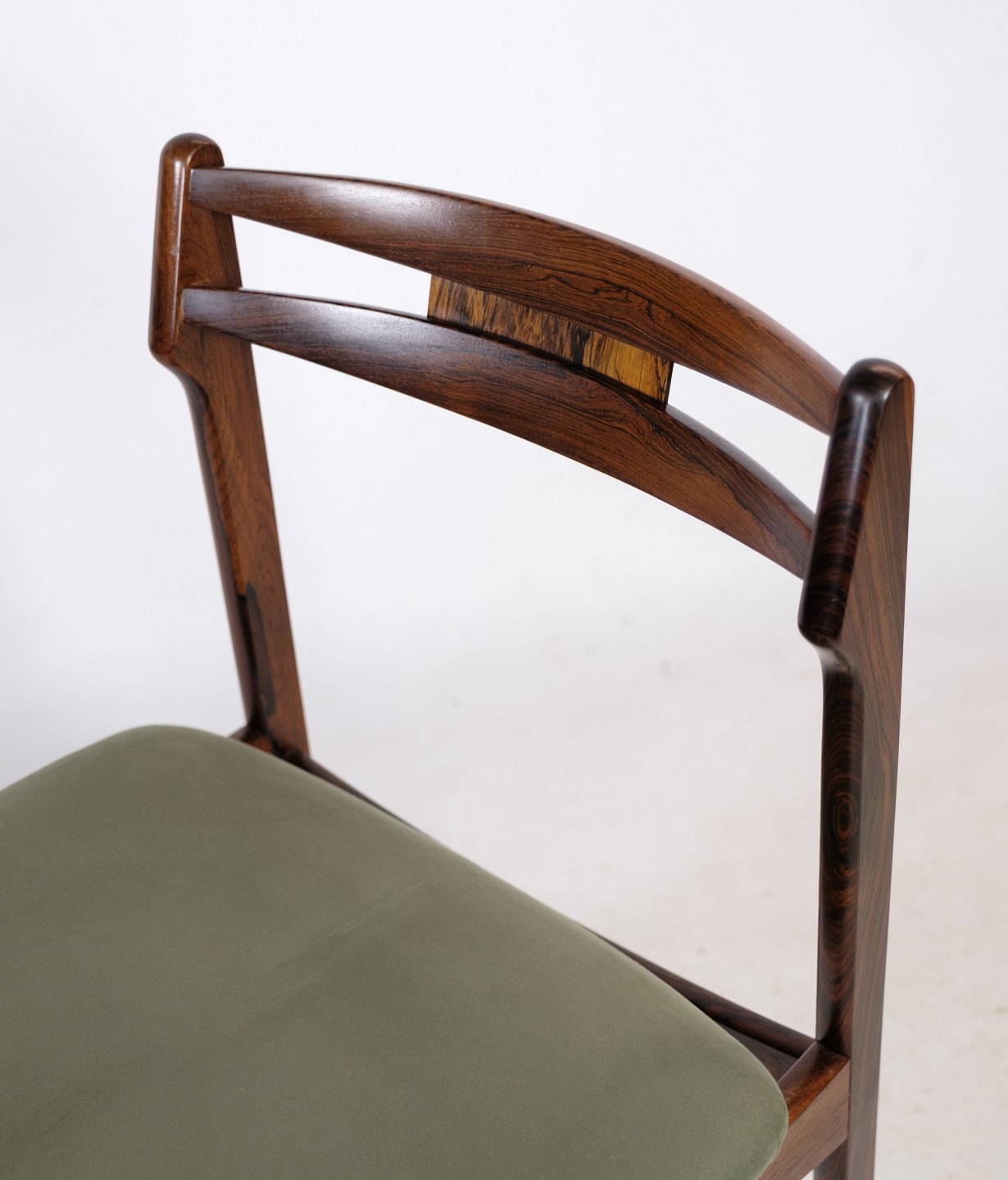 Sæt af 12 spisestuestole af palisander med grønt stof fra omkring 1960'erne. Et sæt stole af høj kvalitet og håndværksmæssig arbejde. De står alle i meget fin stand i både stof og træ. Sjældent udbudt.