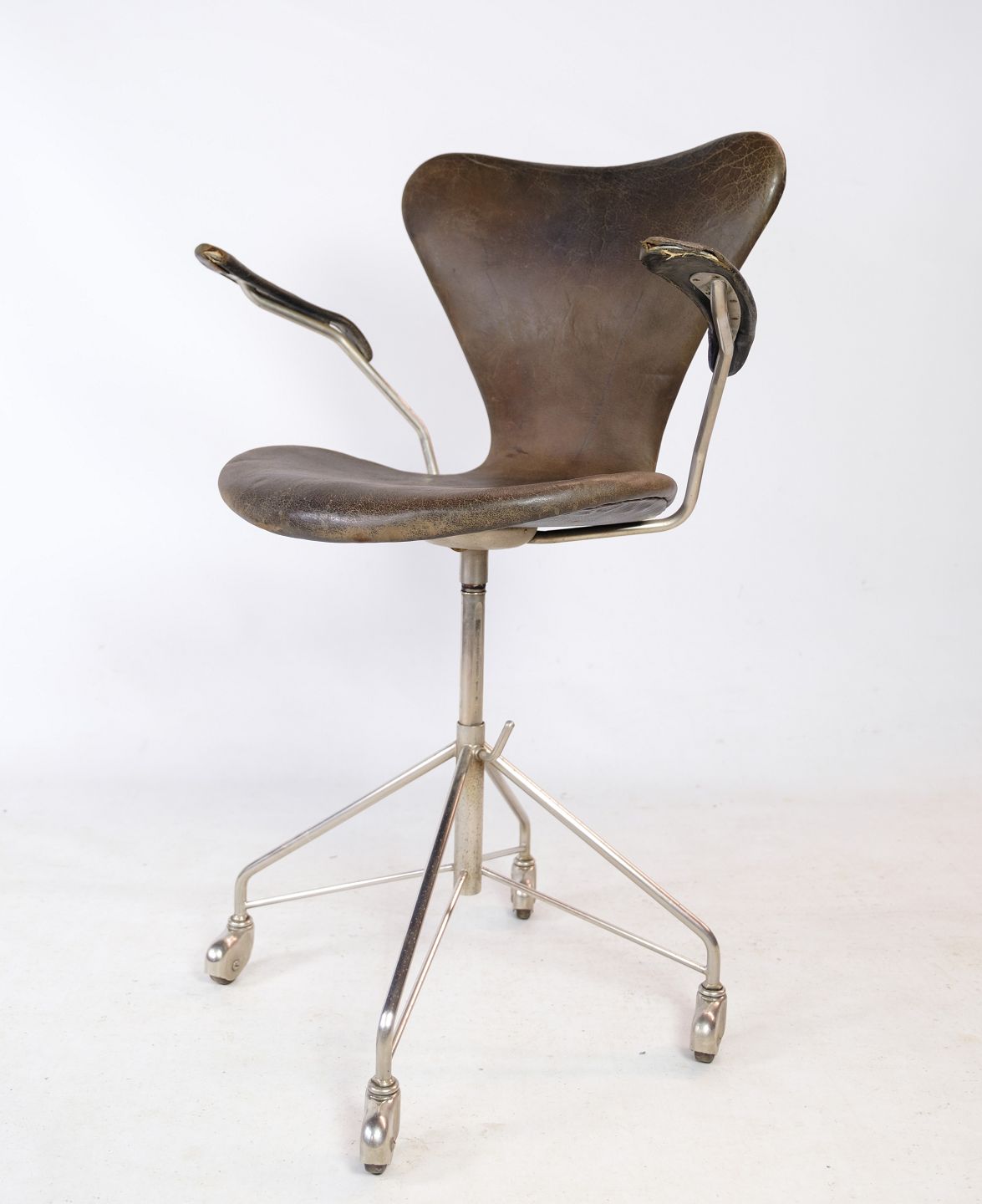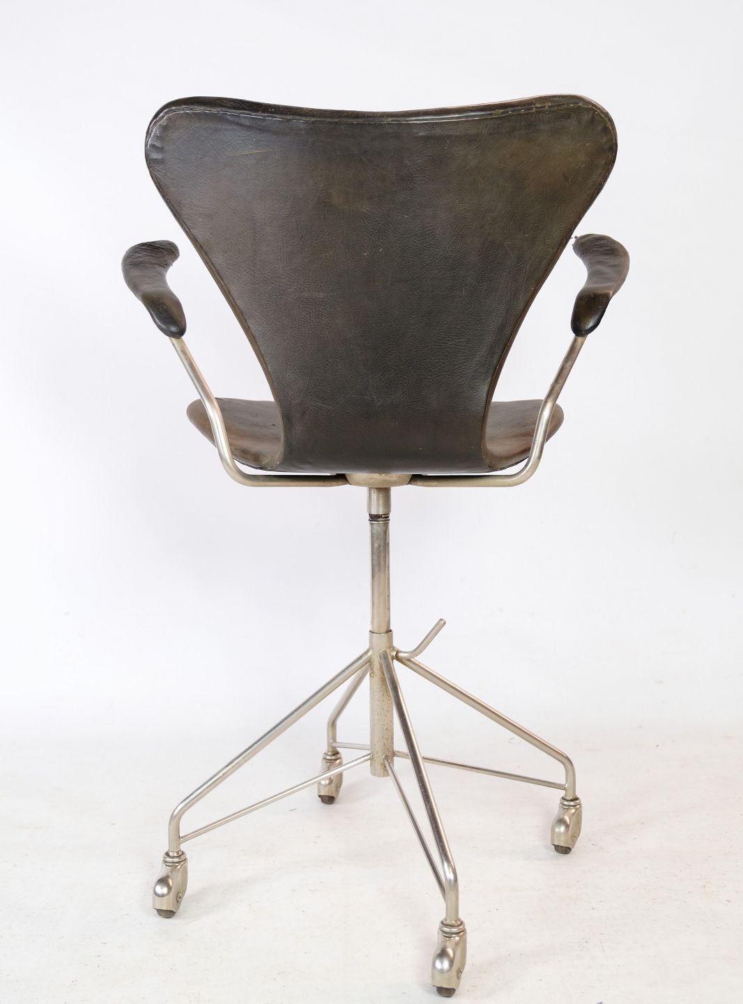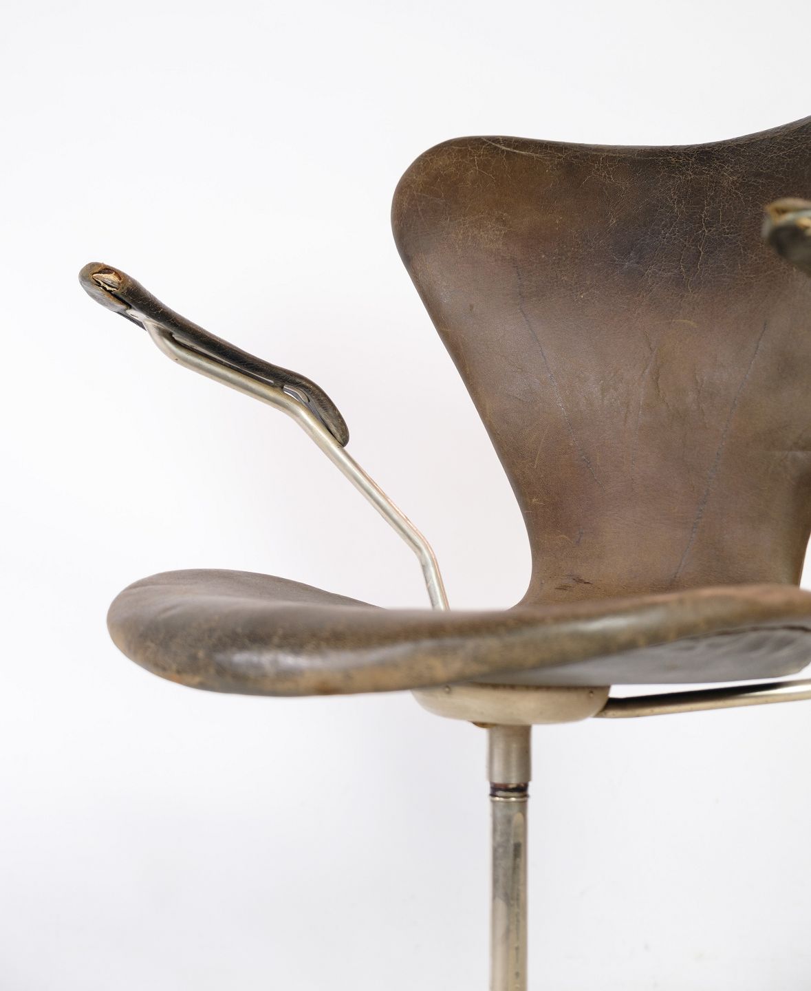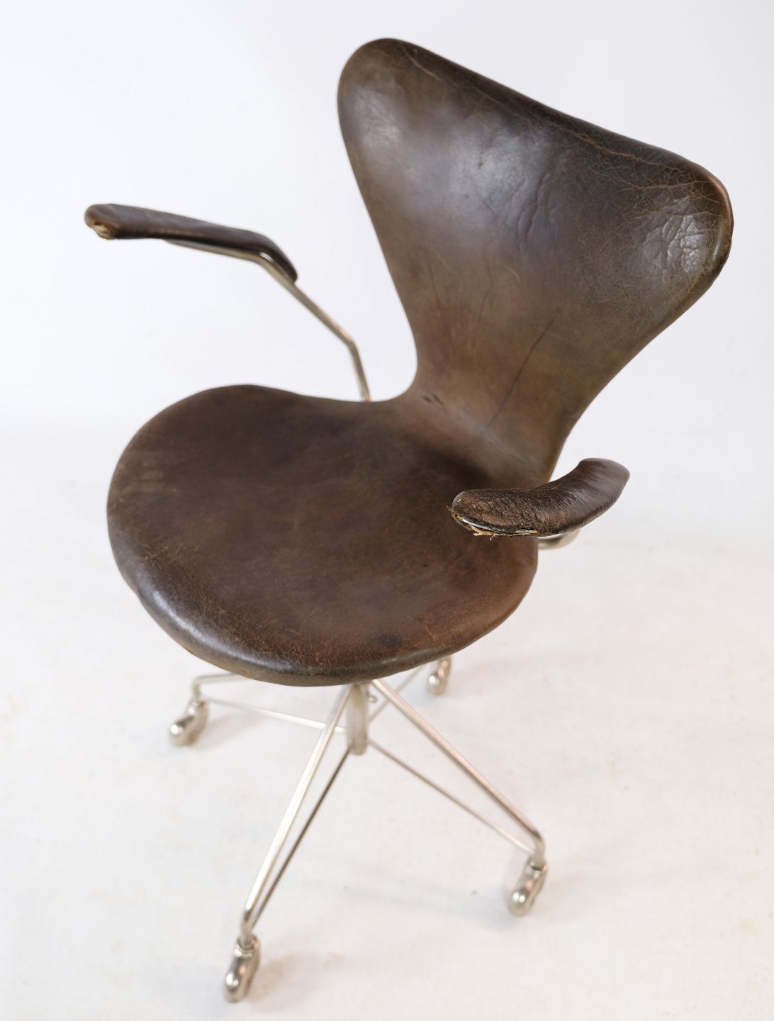 Seven office chair, model 3217, with armrests and swivel function in original dark brown leather designed by Arne Jacobsen in the 1950s and manufactured by Fritz Hansen. The chair is in used condition with patina and wear. Comes with original leather, which is rarely seen from this period.