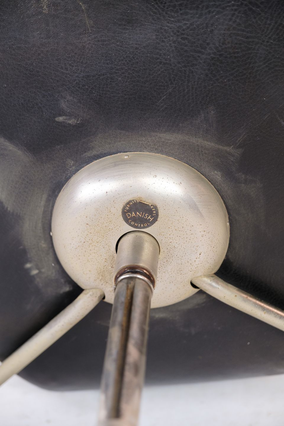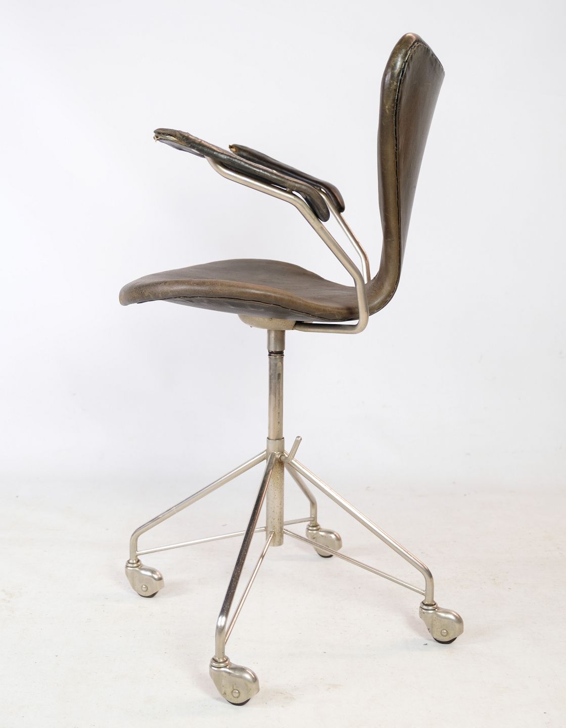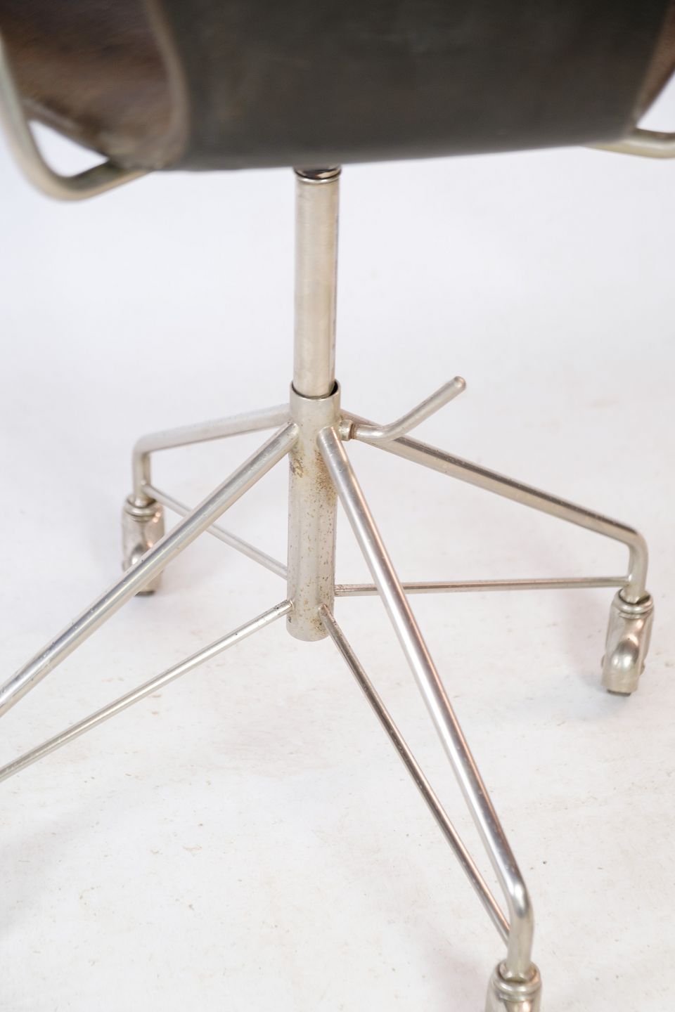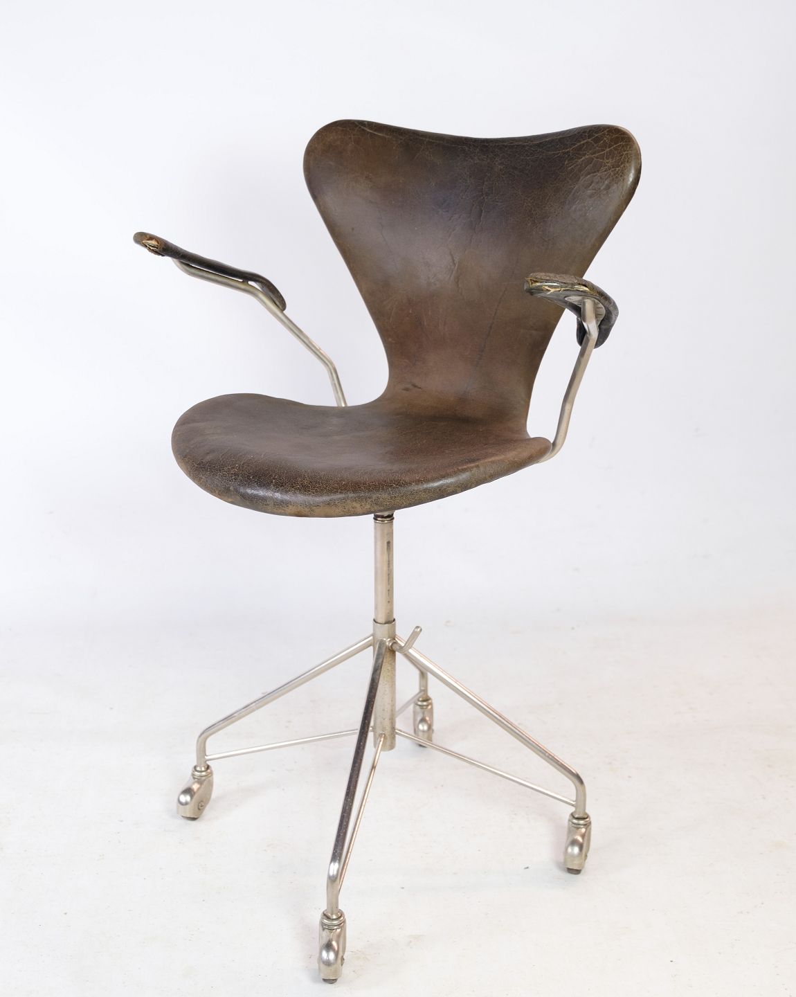 Seven office chair, model 3217, with armrests and swivel function in original dark brown leather designed by Arne Jacobsen in the 1950s and manufactured by Fritz Hansen. The chair is in used condition with patina and wear. Comes with original leather, which is rarely seen from this period.