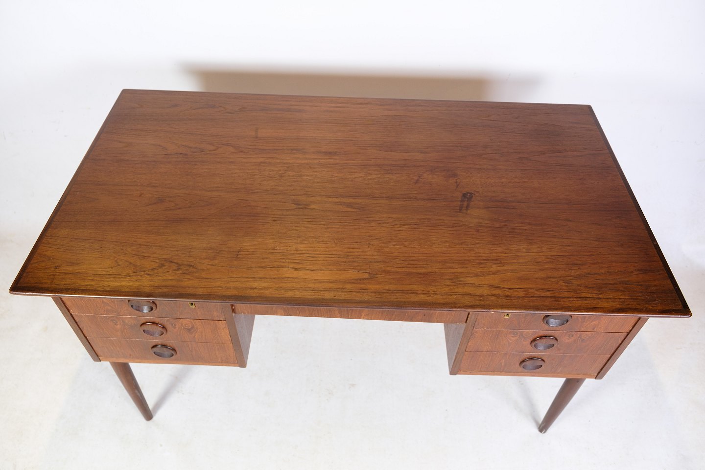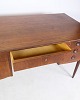 Skrivebordet har tre rummelige skuffer på hver side og en ekstra skuffe i midten, hvilket giver rigelig opbevaringsplads til dine kontorartikler og dokumenter. Den varme tone af teaktræet tilføjer en naturlig skønhed til rummet, mens det danske design bringer en tidløs elegance.