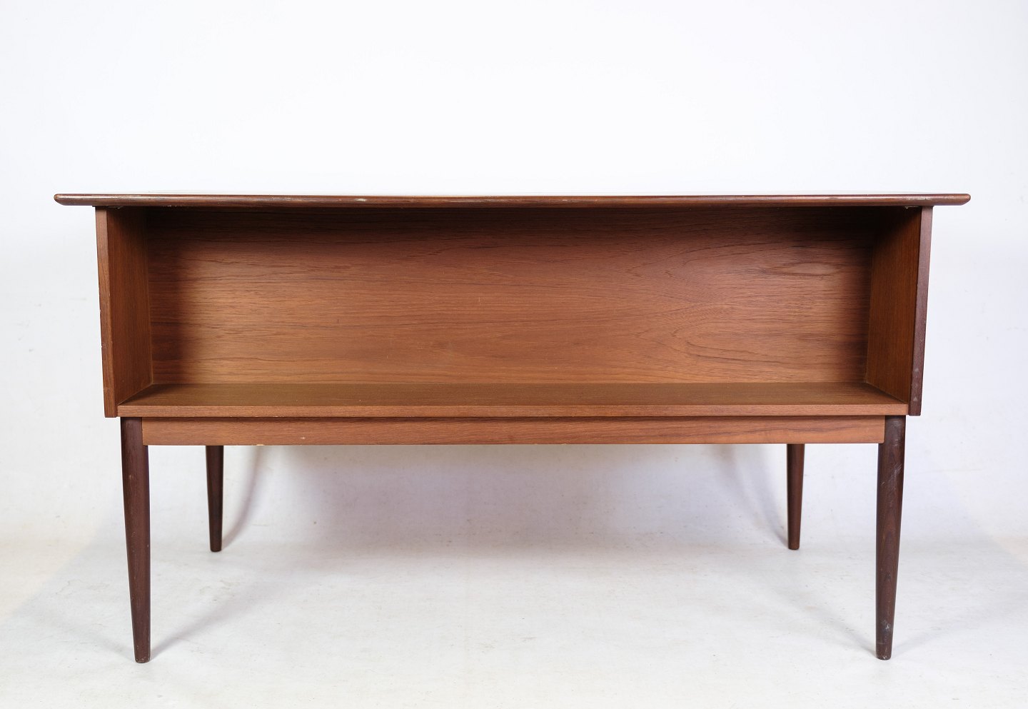 Dette skrivebord i teaktræ fra omkring 1960'erne er et smukt eksempel på dansk design æstetik og funktionalitet. Med sin elegante konstruktion og fine detaljer tilbyder det en perfekt balance mellem stil og brugbarhed.