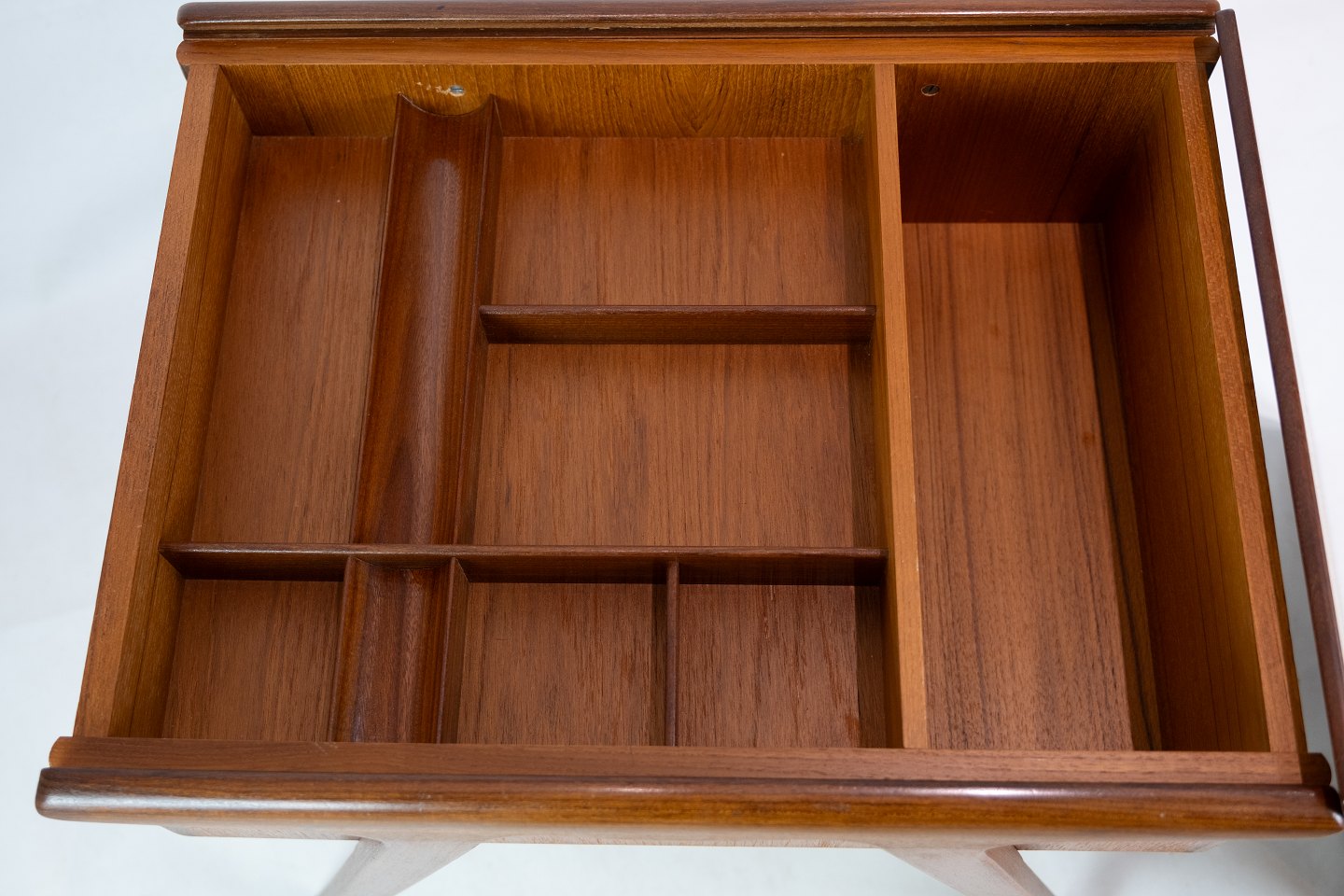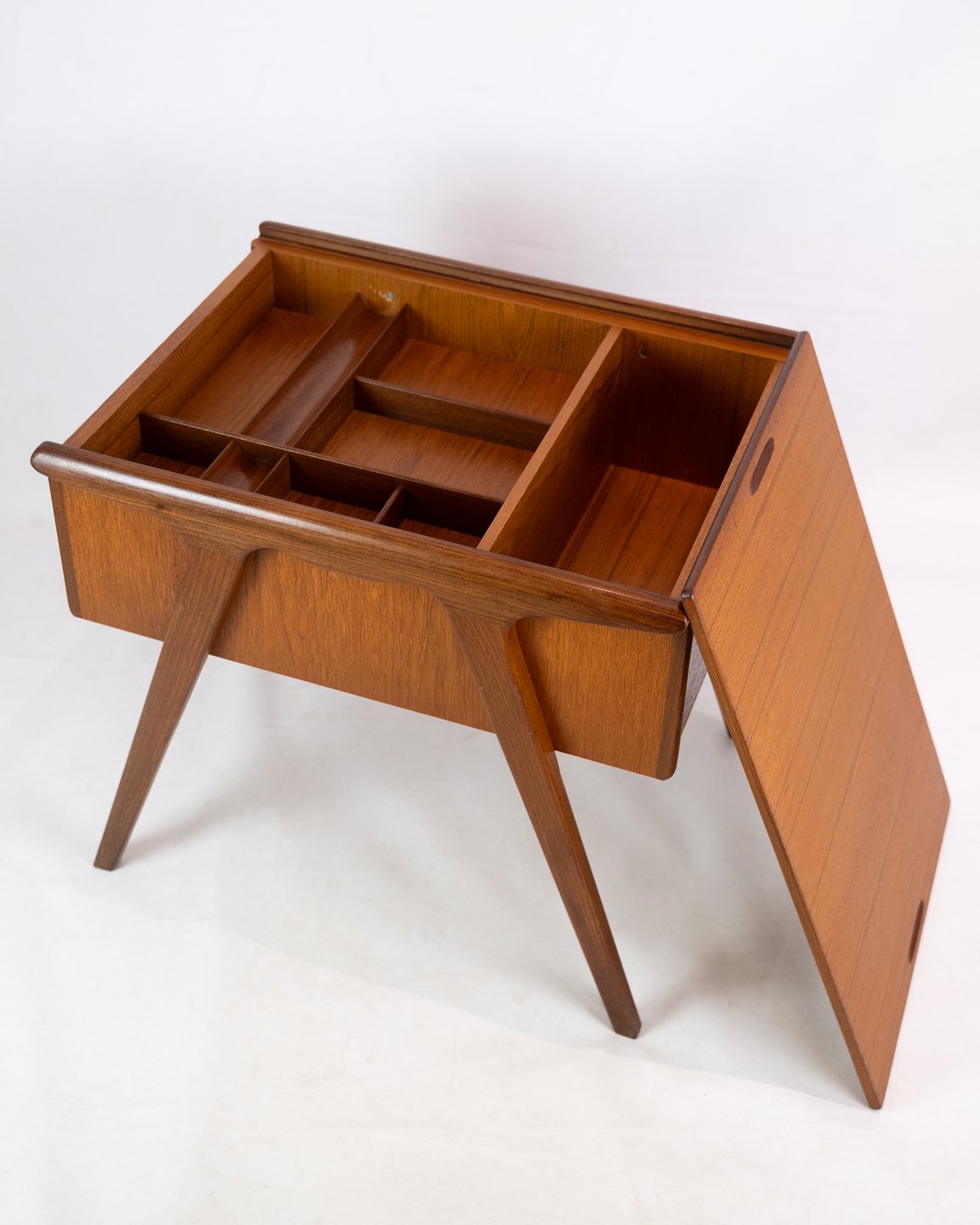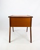 The teak tree is known for its warm color and natural beauty, which makes it a popular material in Danish furniture design in the 1960s. The sewing table will likely have a lovely glow and a distinctive pattern in the wood that adds a warm and welcoming atmosphere to any room.