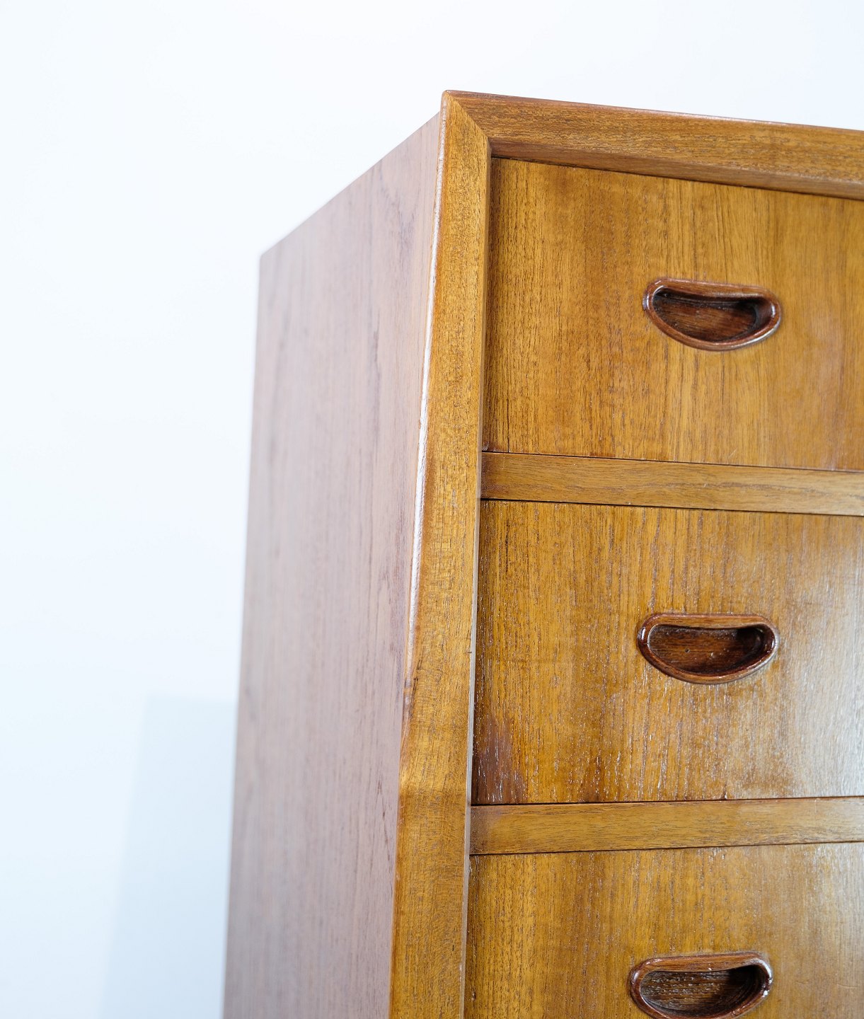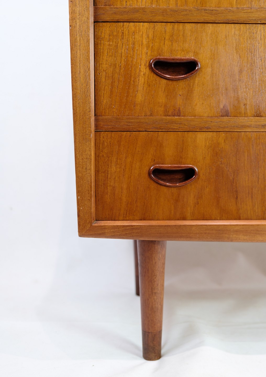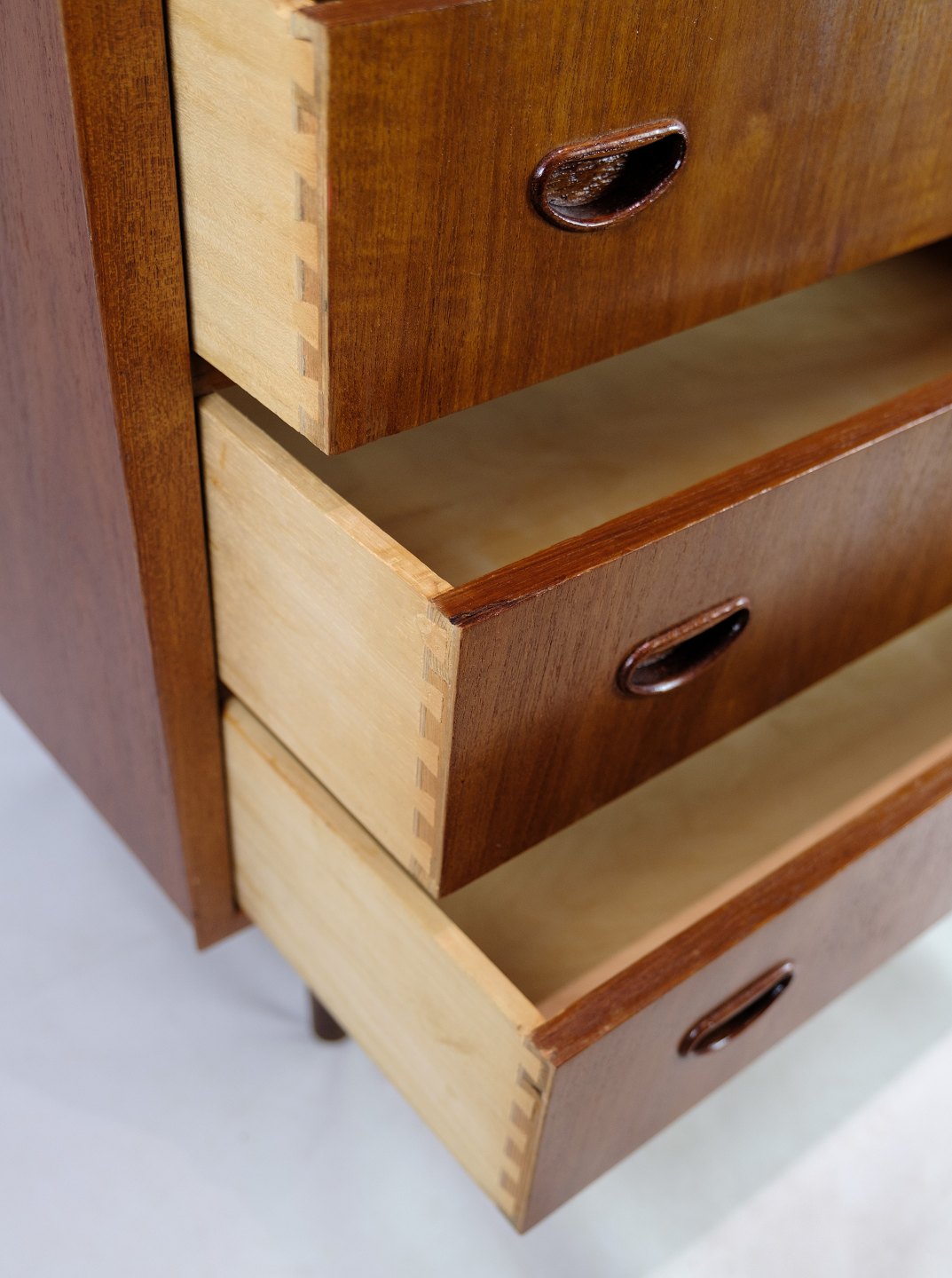 The teak wood is known for its natural beauty, warm colors and durability, which made it a preferred material for furniture design in this era. The chest of drawers will likely have simple lines and an elegant silhouette that reflects the timeless and stylish design of the 1960s.