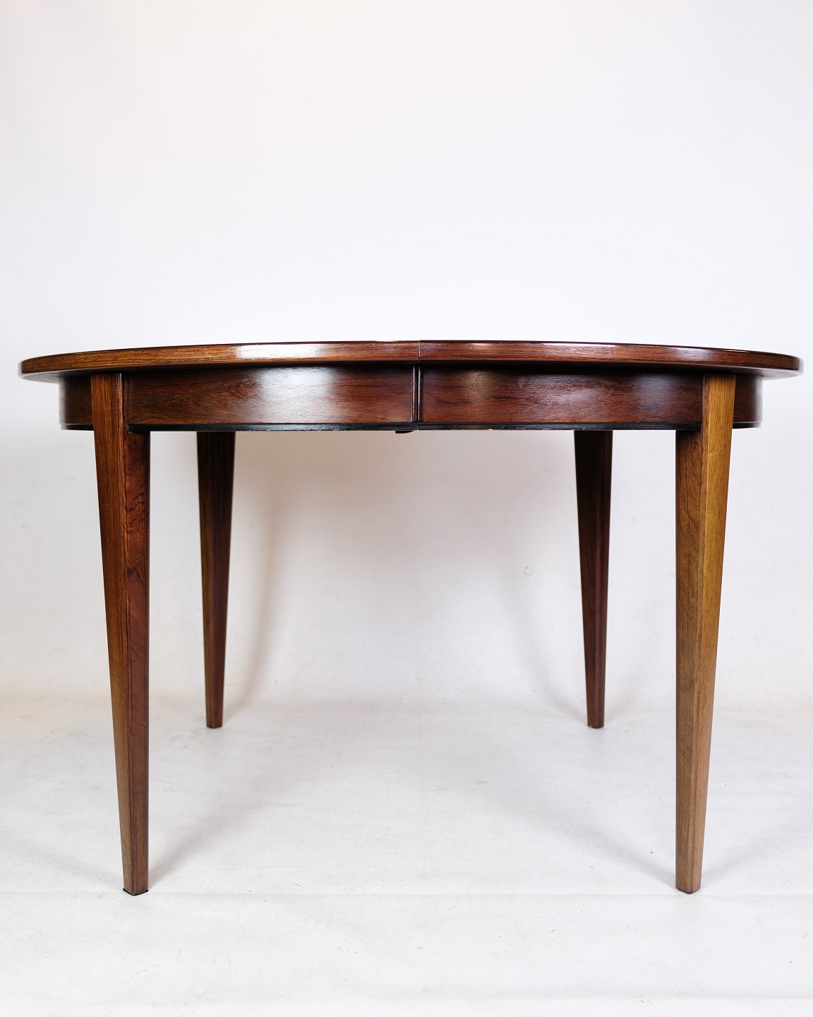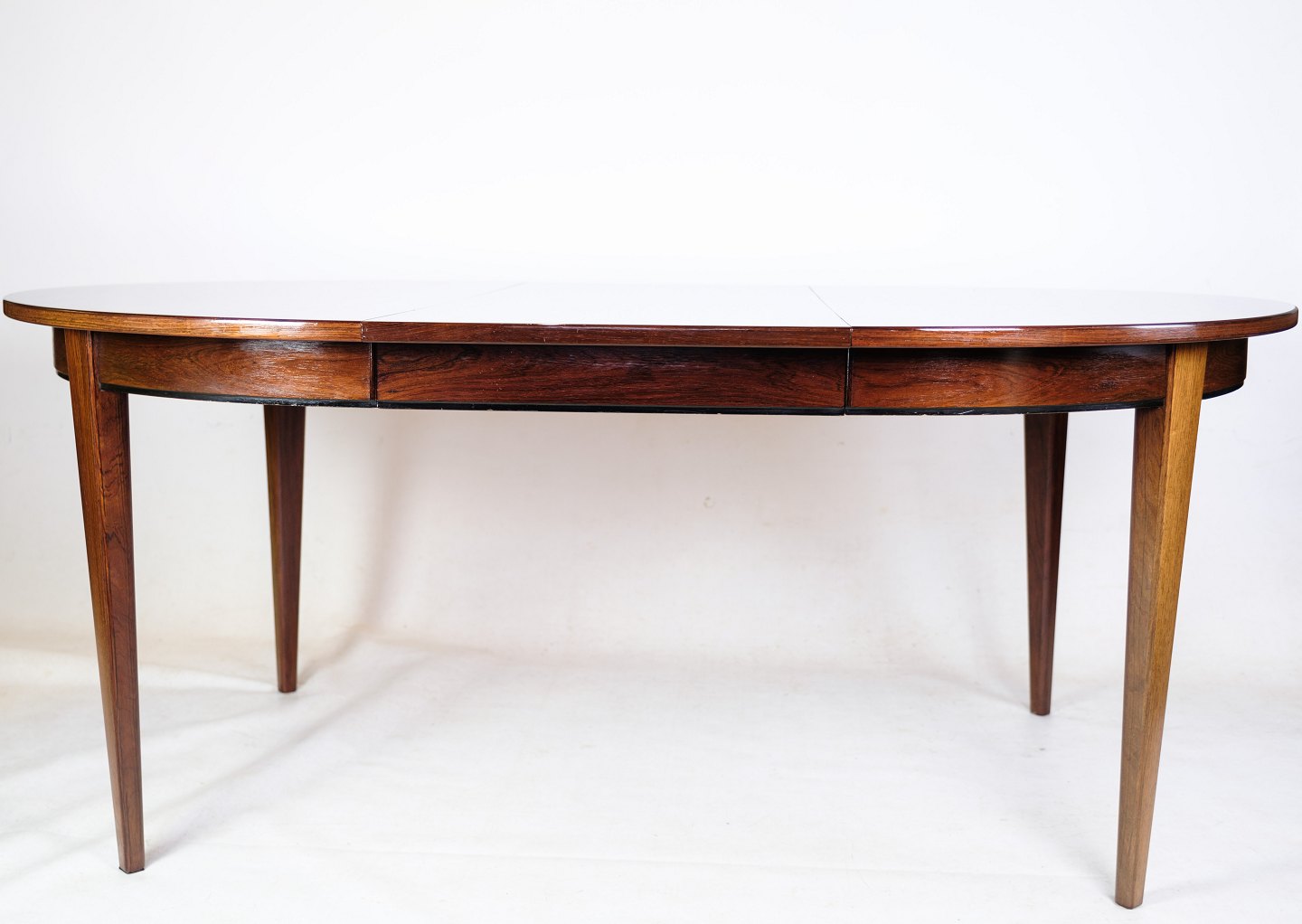 Overall, the dining table is in rosewood, designed by Oman Jun. A/S, model no. 55, from the 1960s a tribute to Danish furniture design tradition. With its rosewood construction and timeless design, it represents the aesthetics and quality so characteristic of the period and will no doubt continue to add style and elegance to modern interiors.