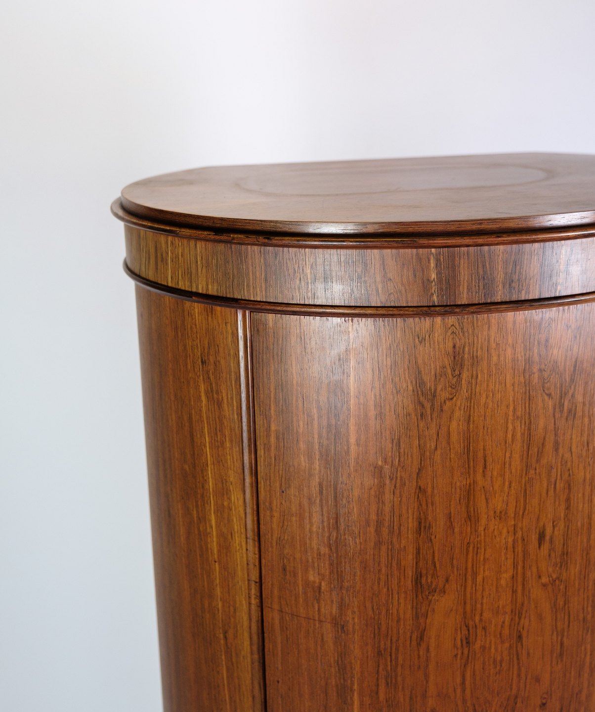 This oval-shaped rosewood pedestal cabinet, designed by Johannes Sorth for Bornholms Møbelfabrik around the 1960s, exudes a timeless elegance and beauty. Made from first-class rosewood, this cabinet is a beautiful example of Danish furniture craftsmanship from the mid-20th century.