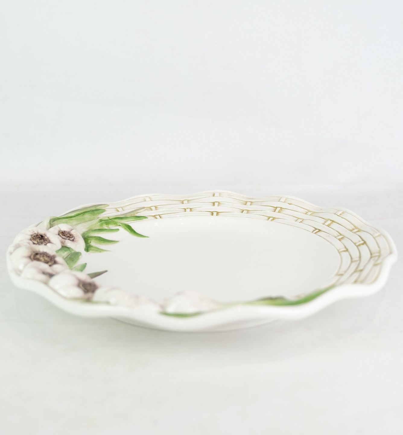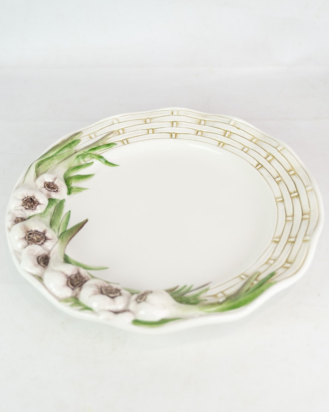 Hvide porcelæns tallerkener, dekoreret med hvidløg i Italiensk design. Står i flot stand uden skader. (Flere på lager, spørg efter antal)