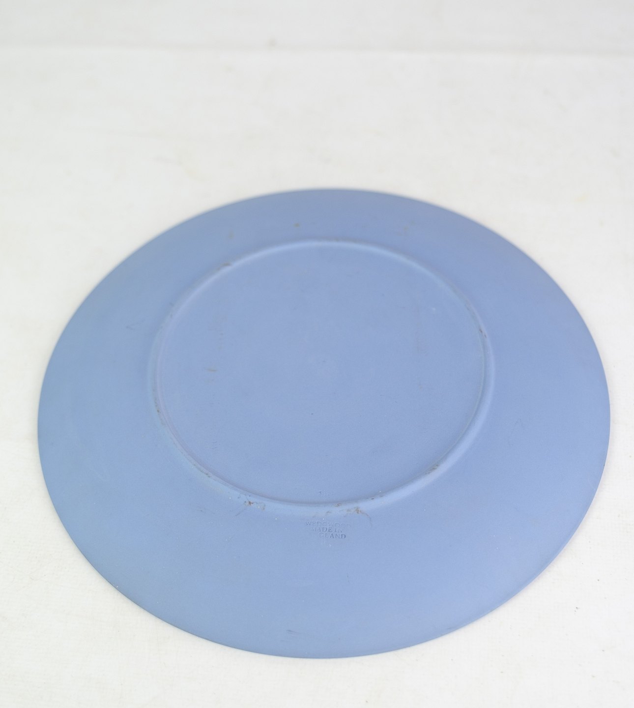 Wedgwood keramik tallerken jasperware creme farve i motivet og baggrundsfarven er lyseblå.