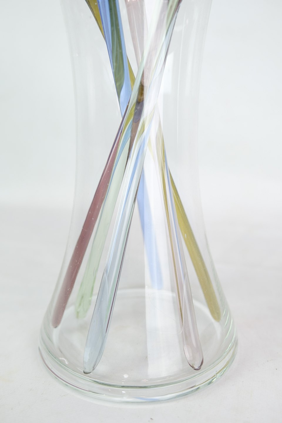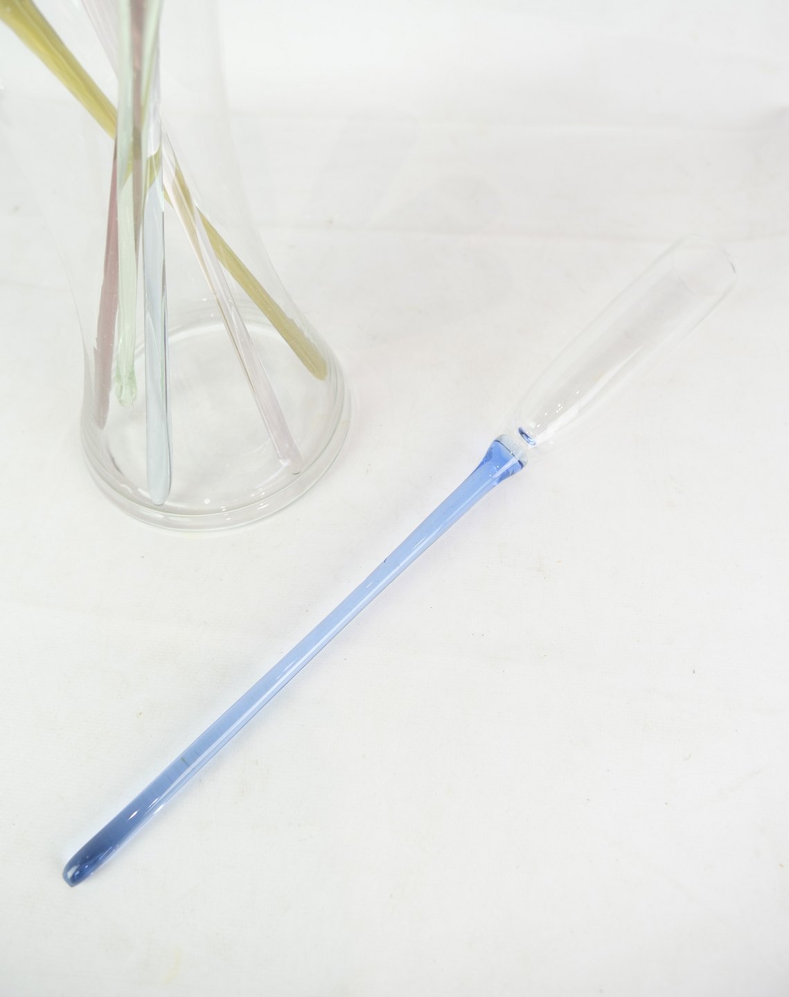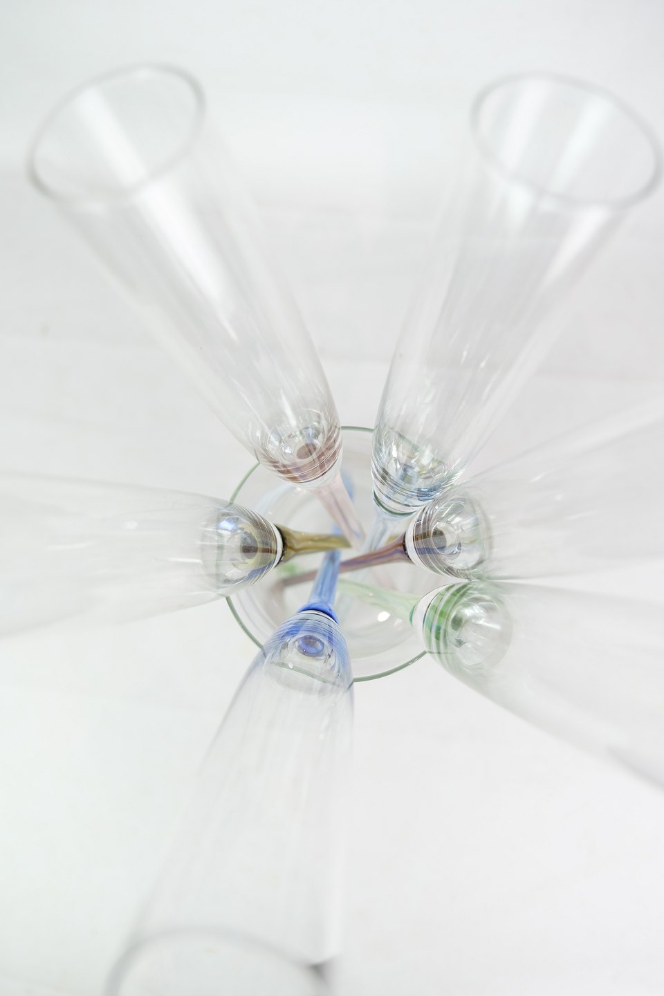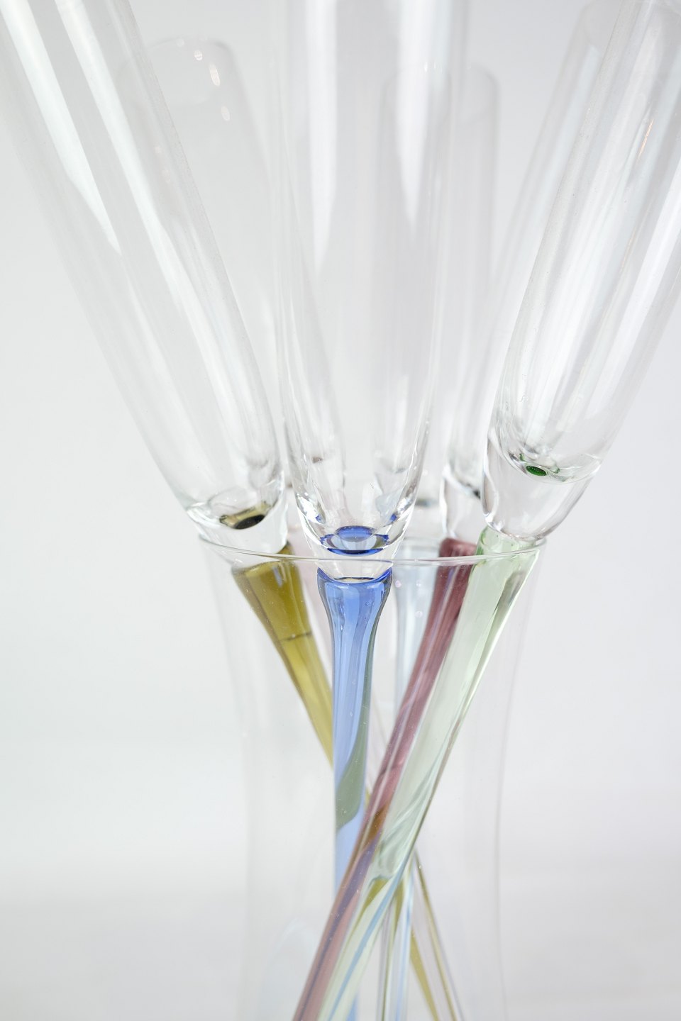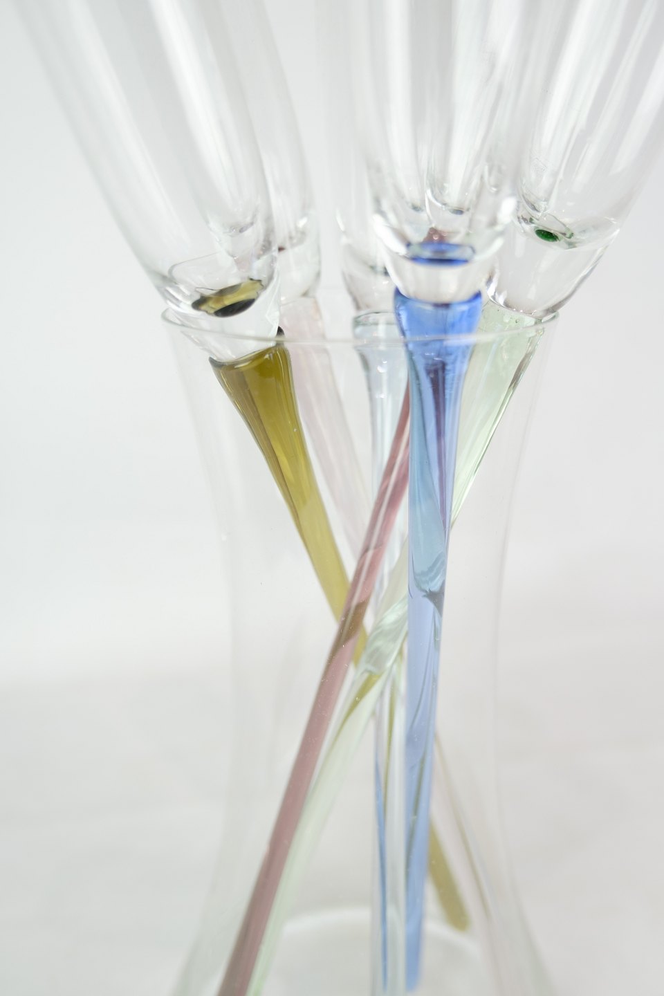 Serving glass vase with champagne glass on stem with different colors. Sold as a set.
