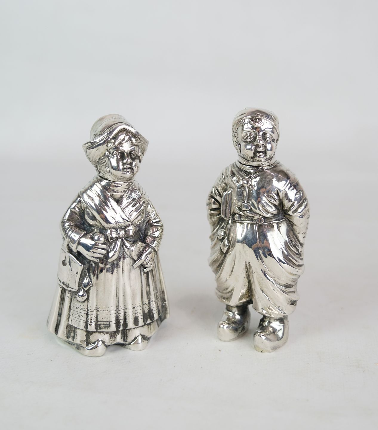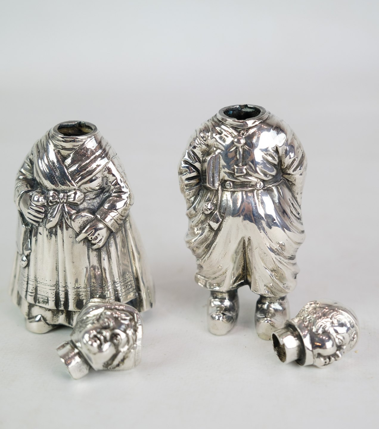 Salt and pepper shaker in silver, stamped 830, designed as a man and a woman. Weight: 325g