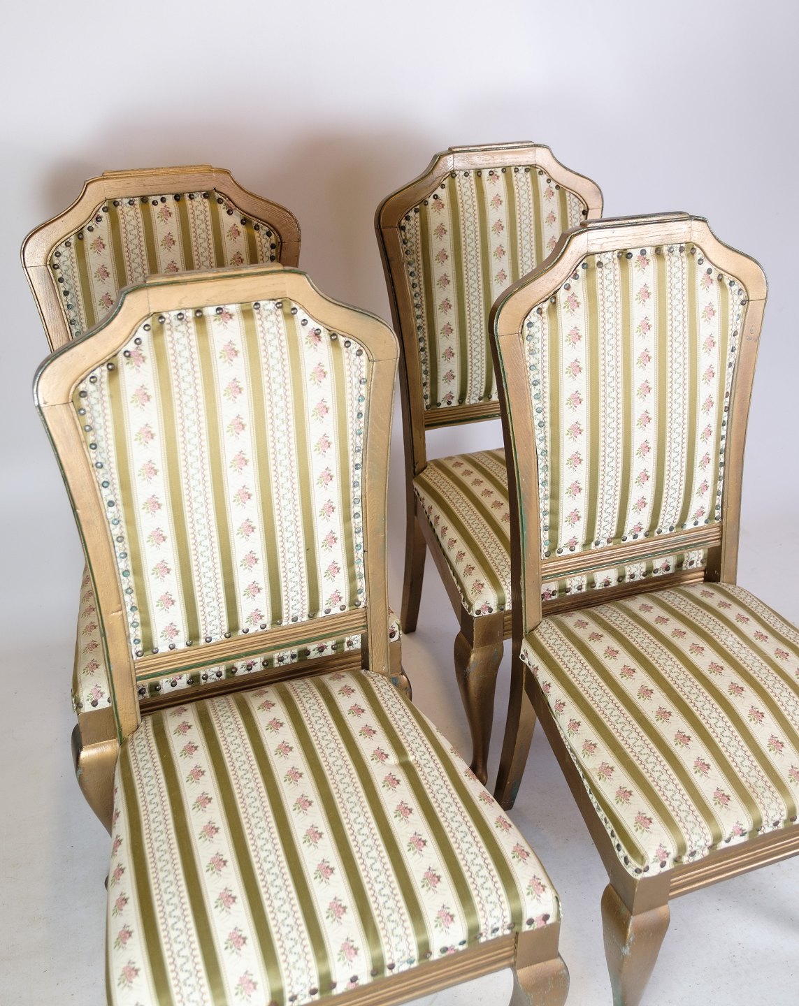 Sæt af fire antikke rococo stole i forgyldt træ med stribet stof fra omkring år 1930'erne.