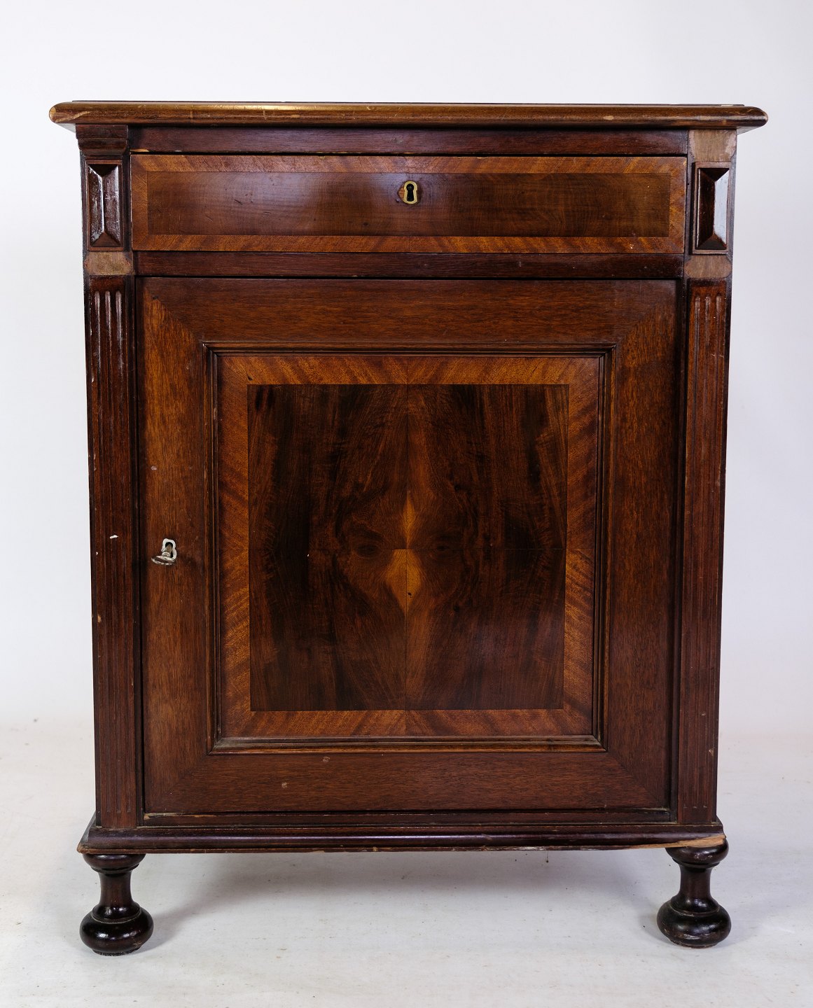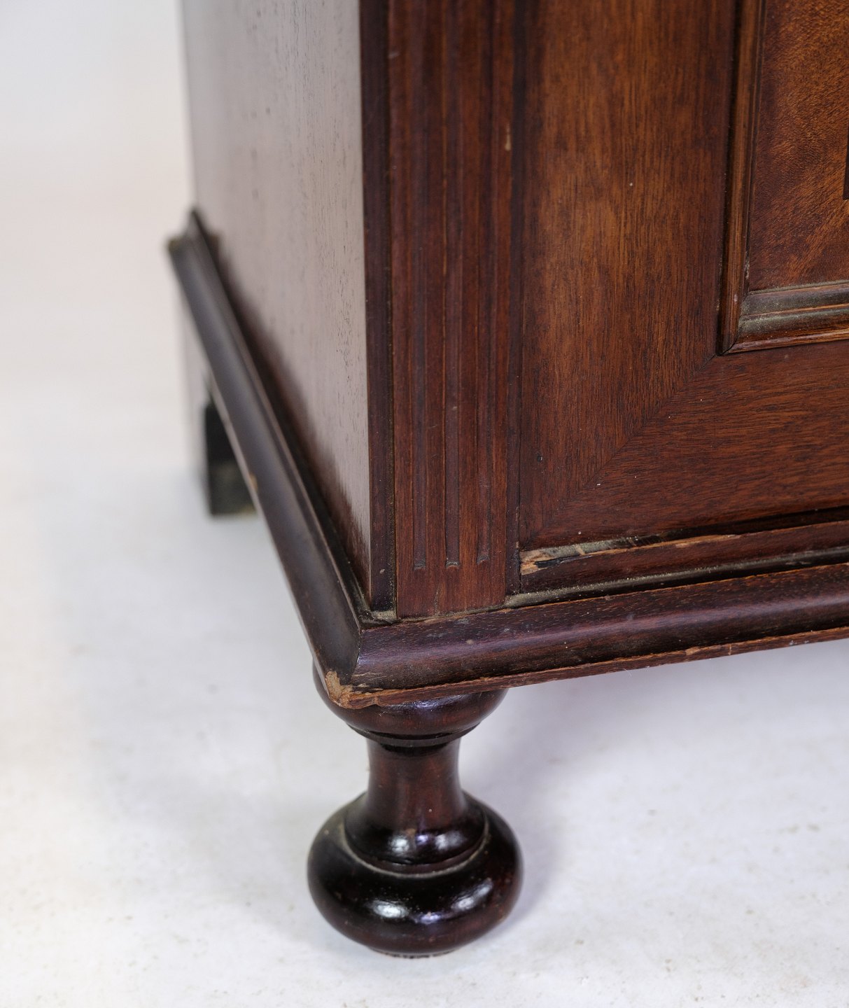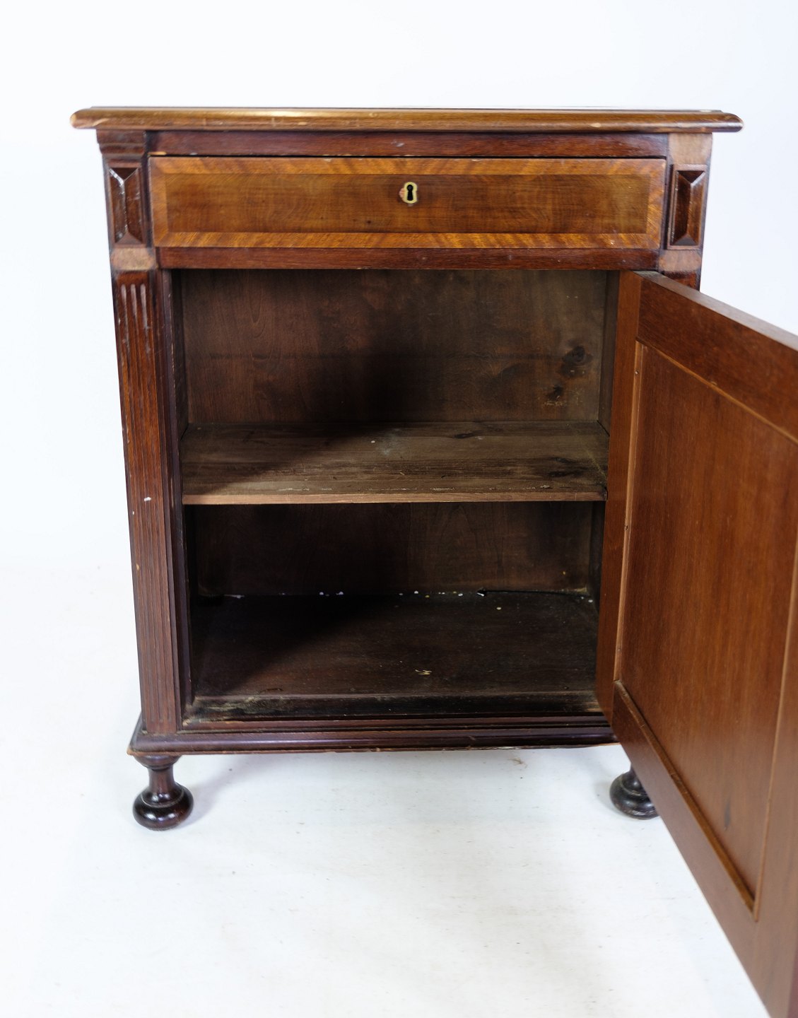 Mahogany console with inlaid walnut wood and round legs from around the 1880s.