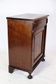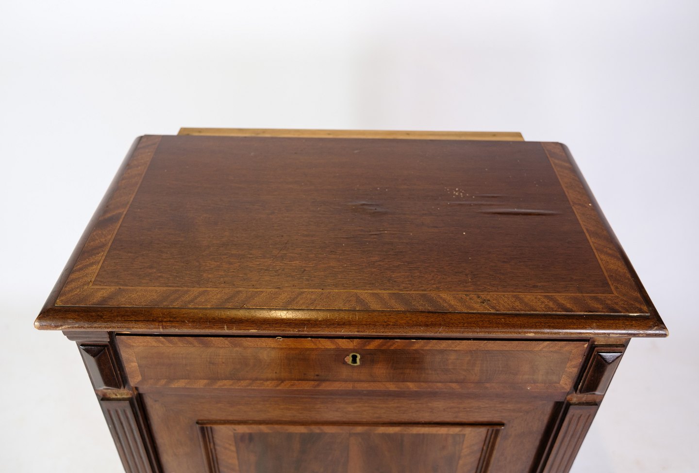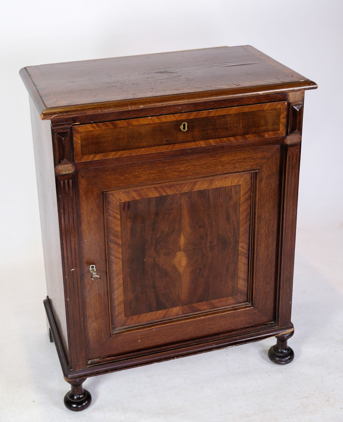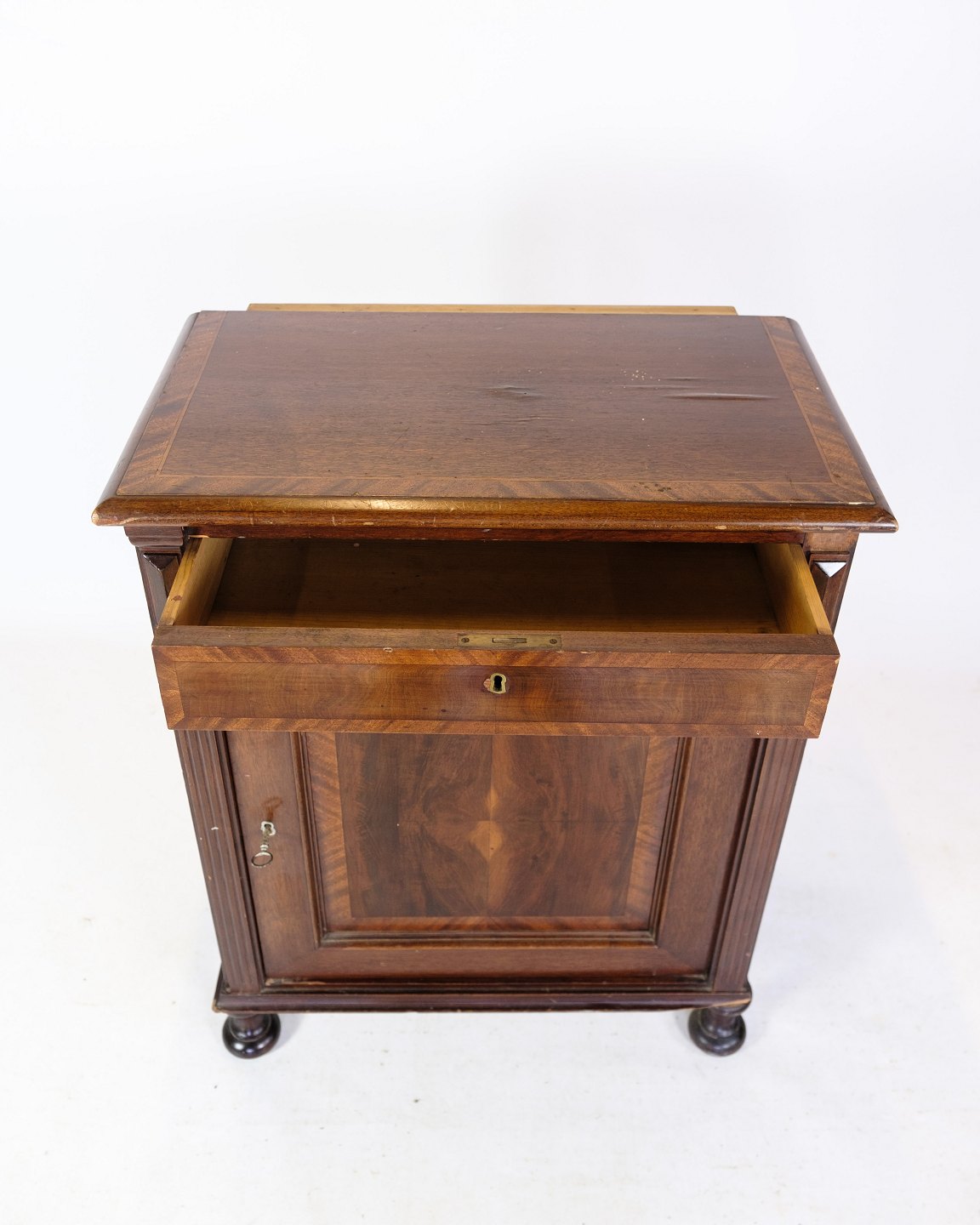 Mahogany console with inlaid walnut wood and round legs from around the 1880s.
