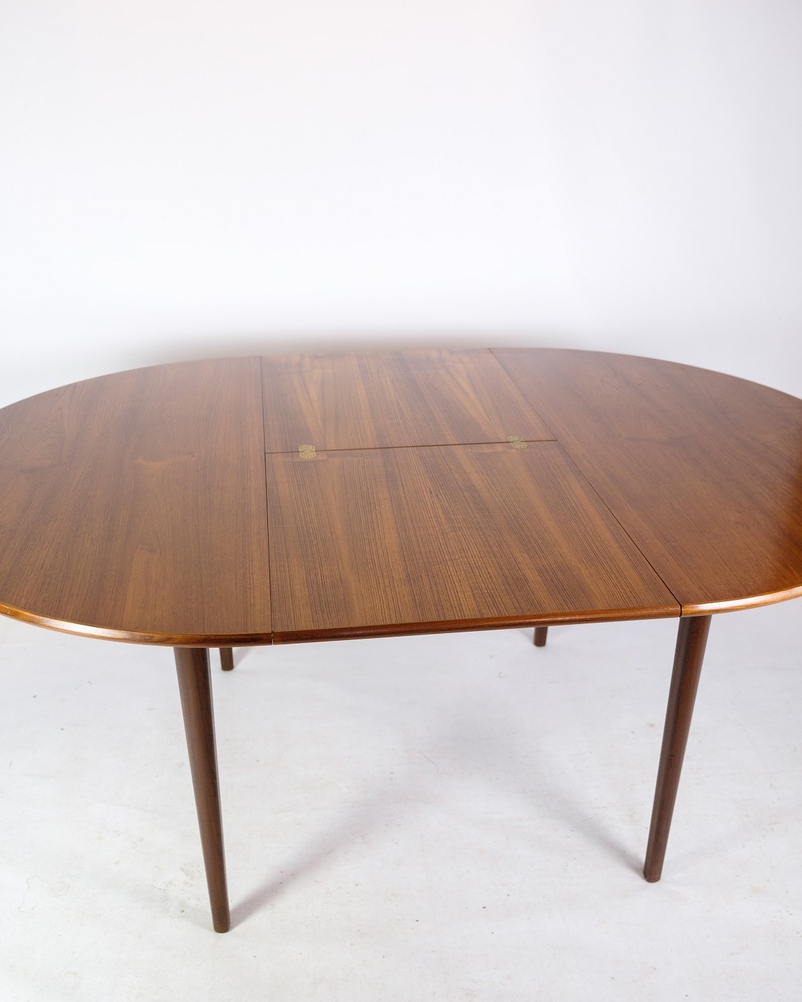 Teak dining table with built-in additional plate and round legs of Danish design from around the 1960s.