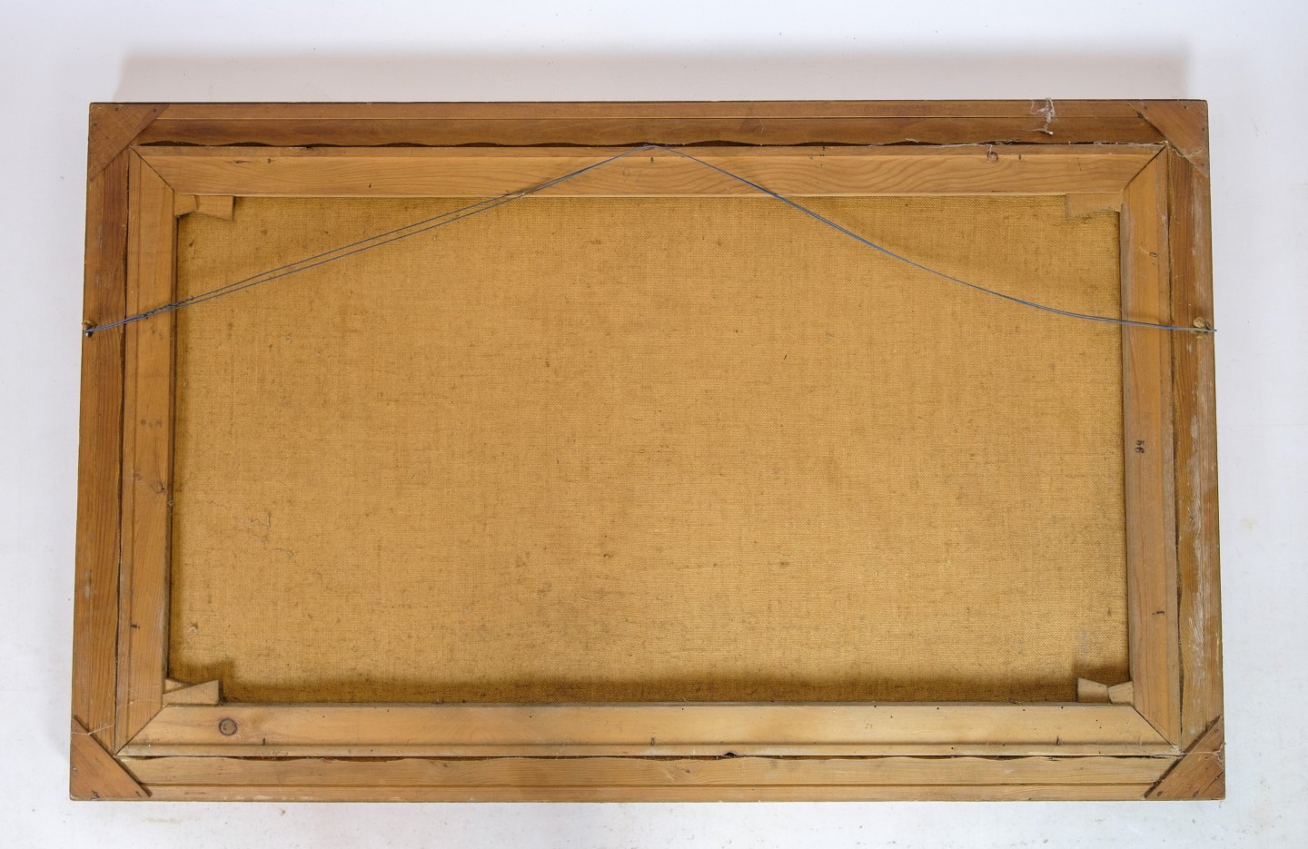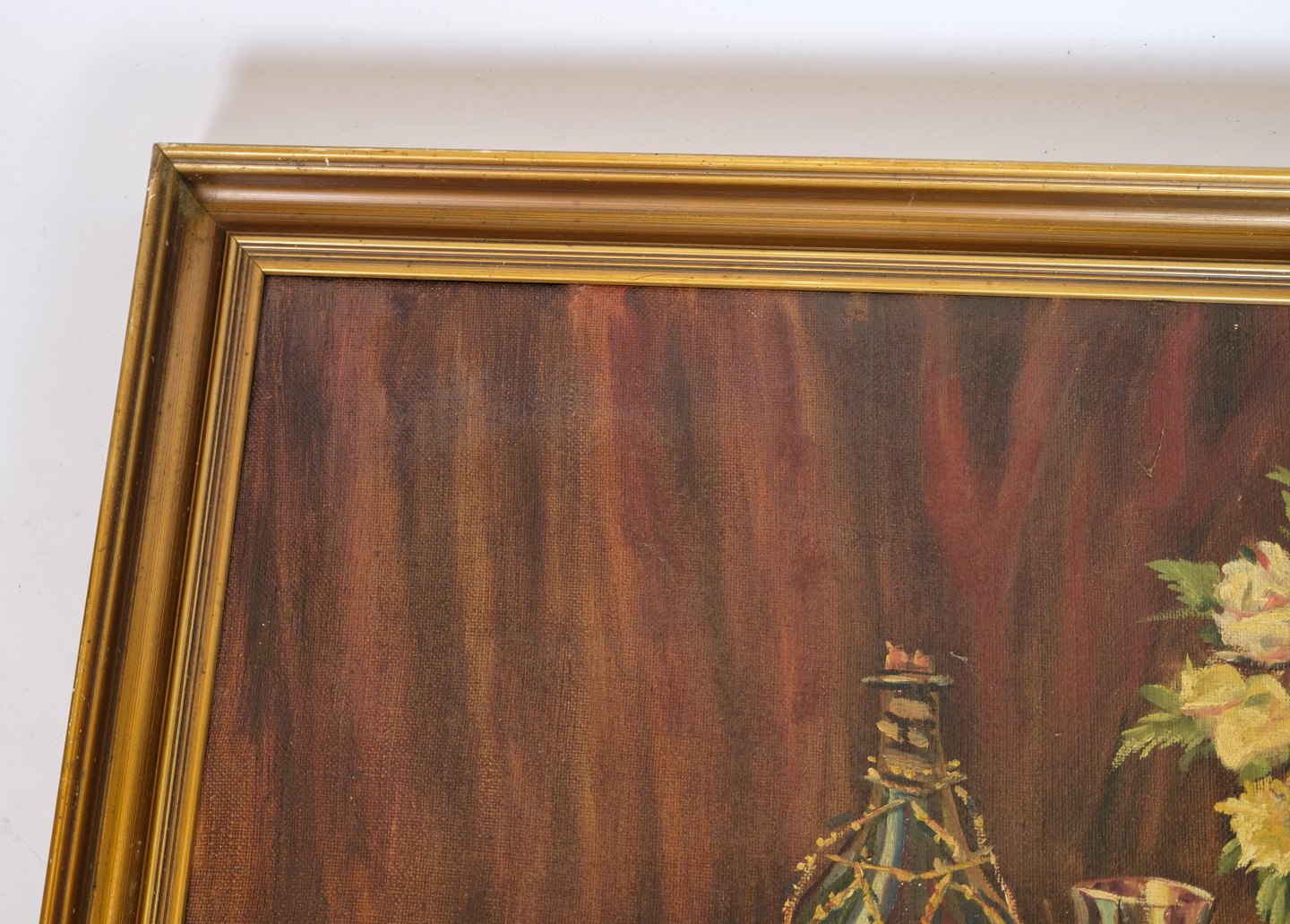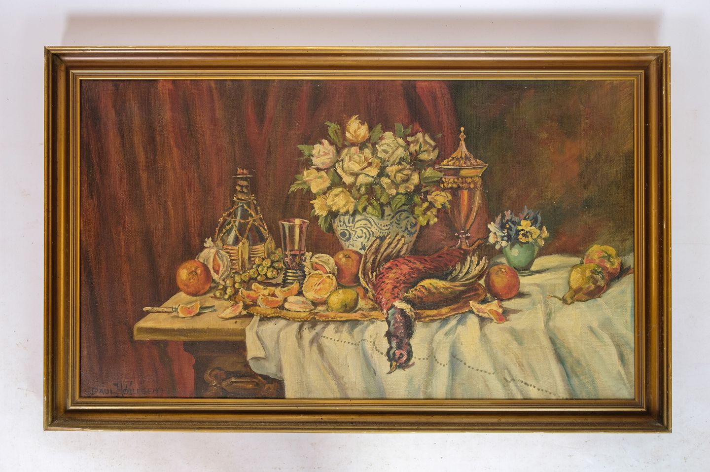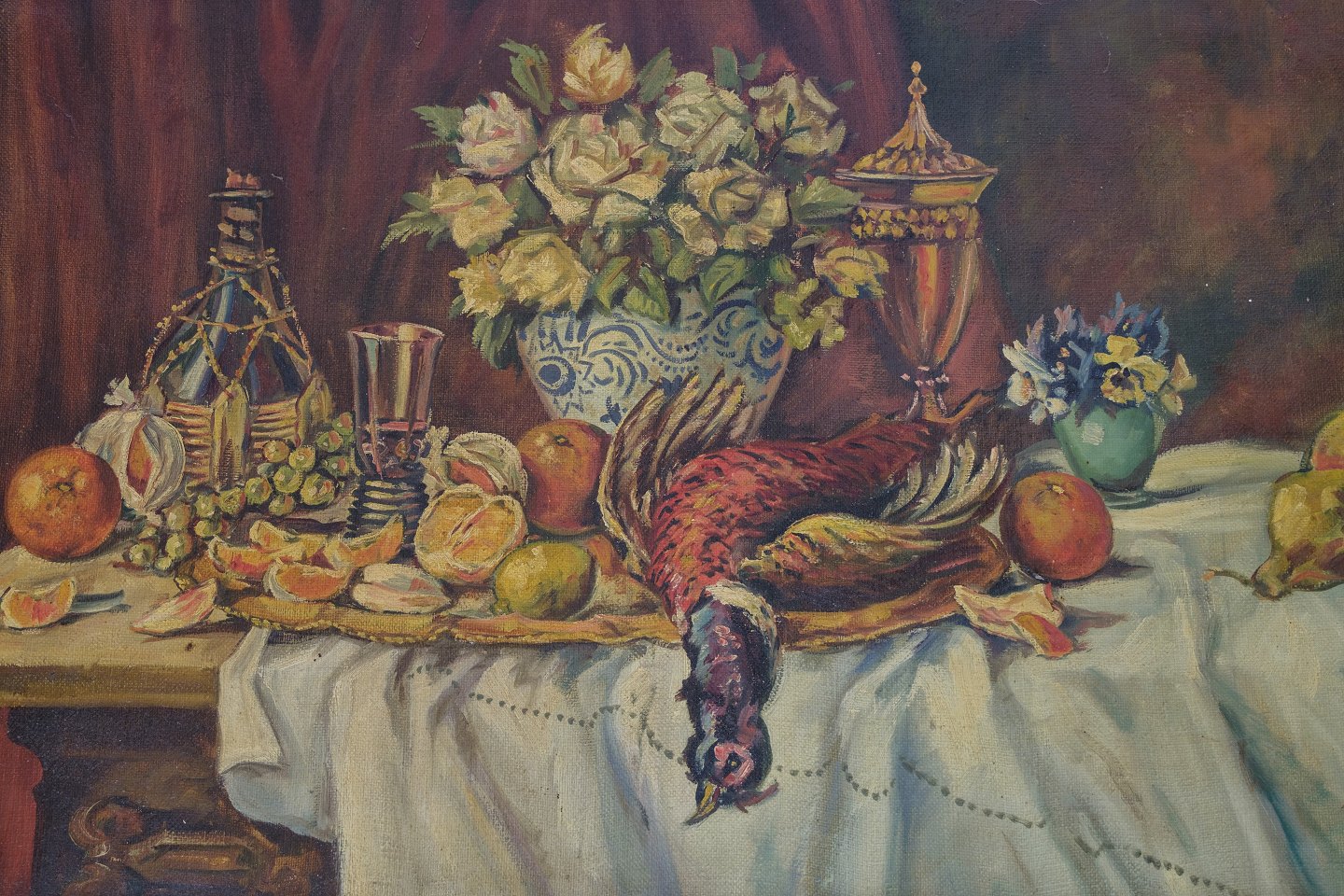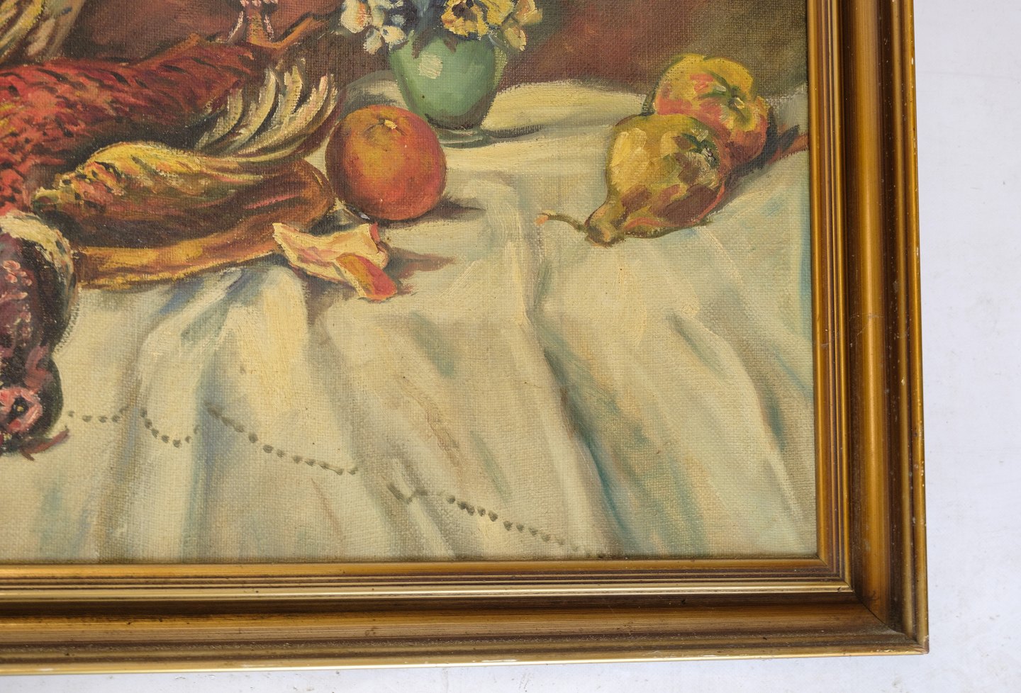 Oil painting on canvas with the motif of a table setting with fruits and a pheasant from around the 1930s.