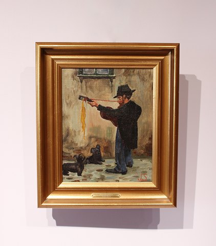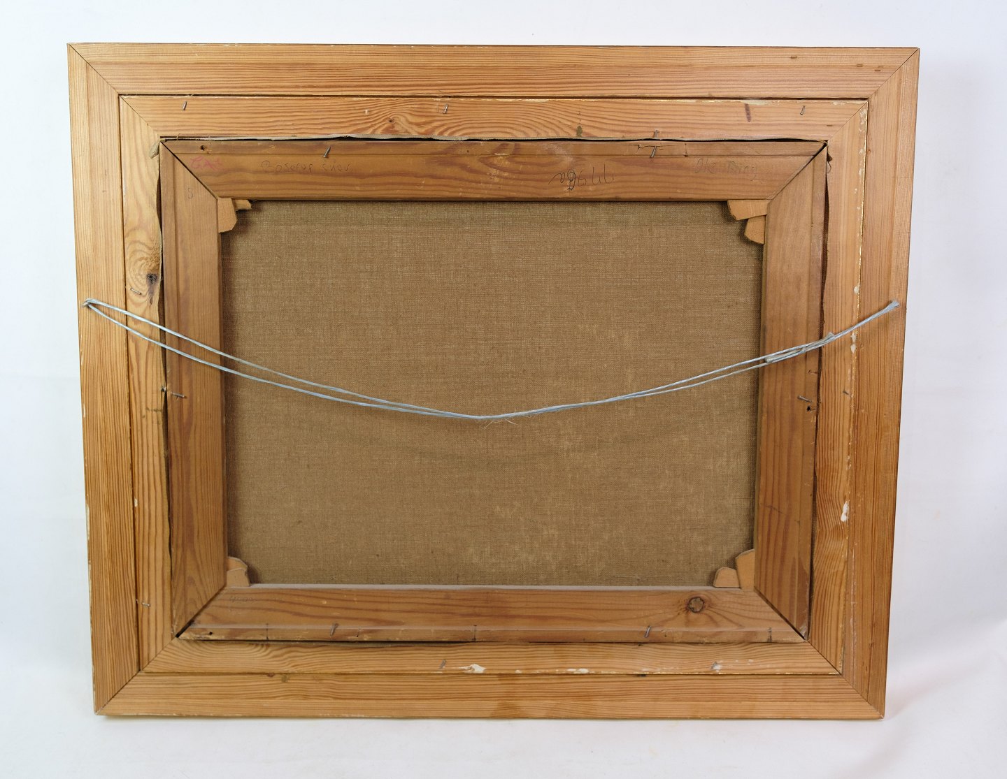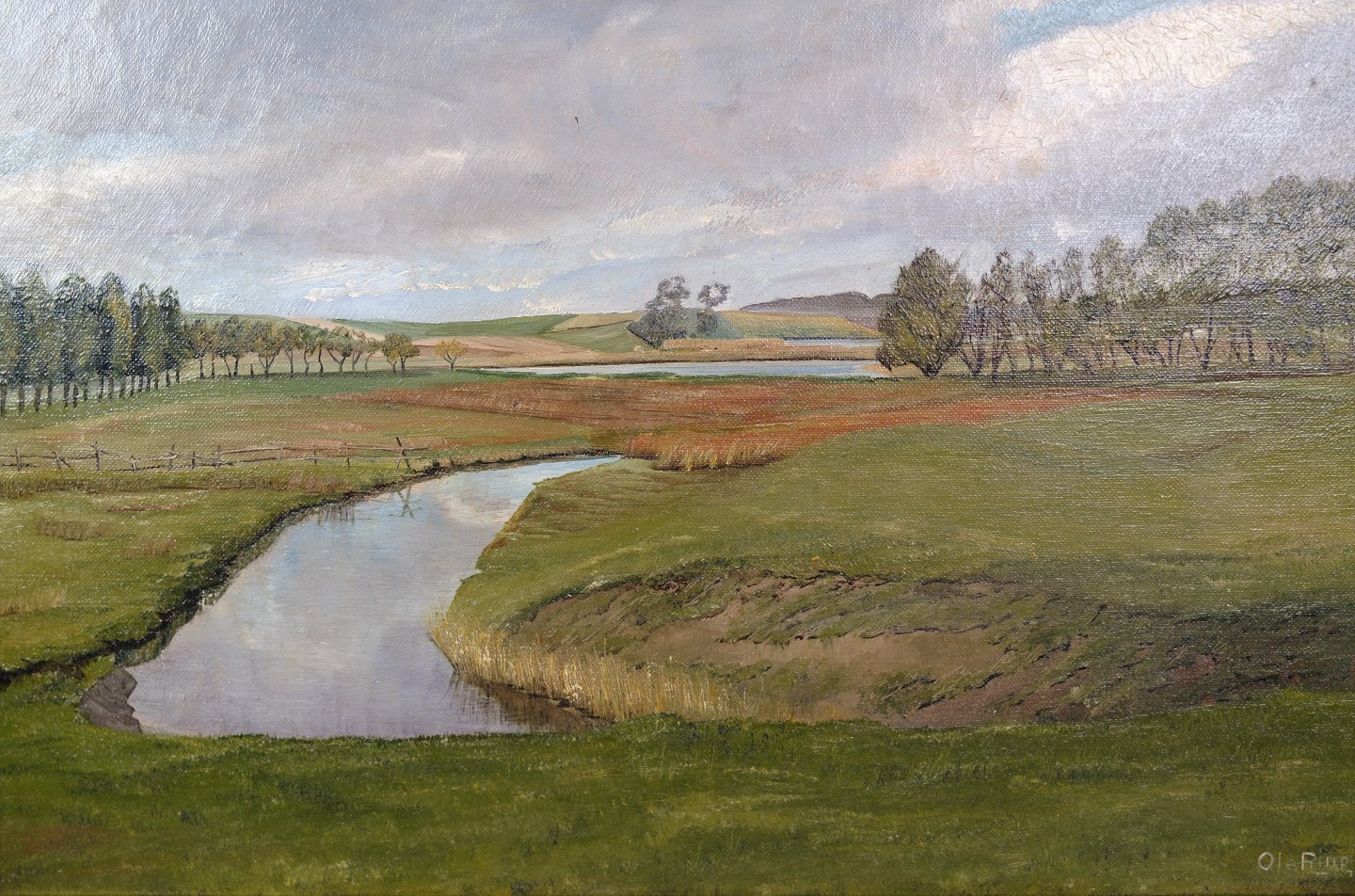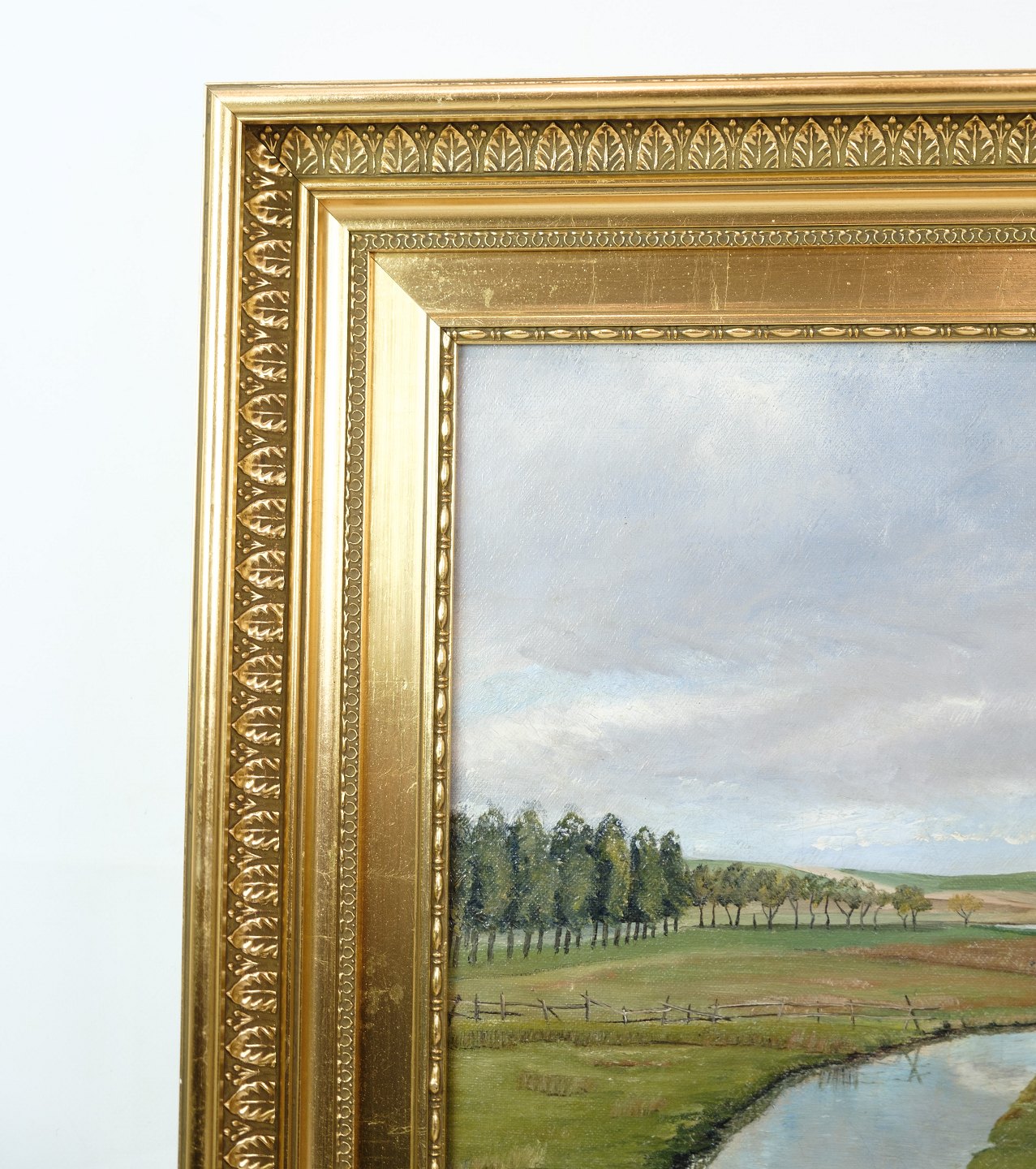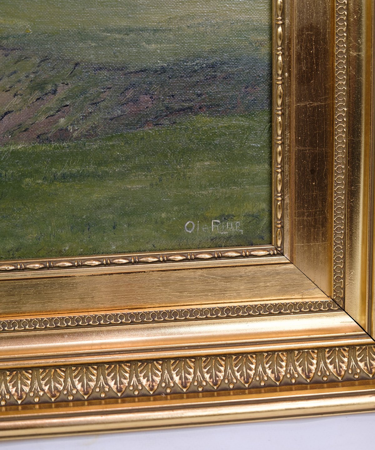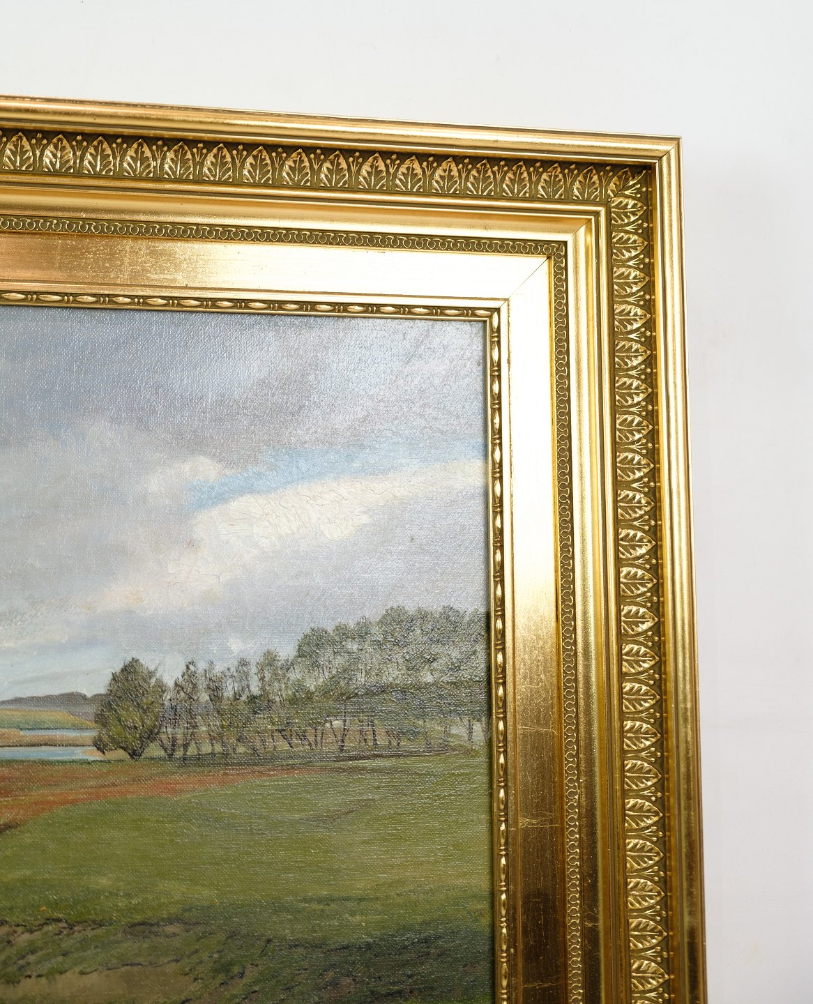 Landscape painting with gold leaf frame painted by the artist Ole Ring (b.1902-d.1972), who lived in the Roskilde, Denmark area. The picture presumably illustrates the landscape around Boserup forest, which is written on the back.