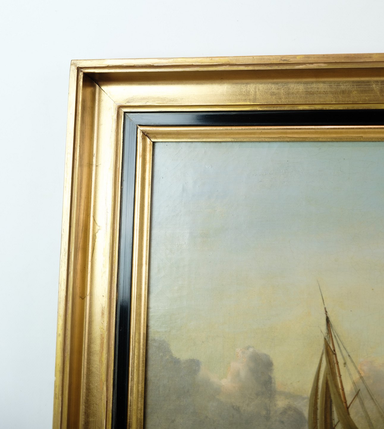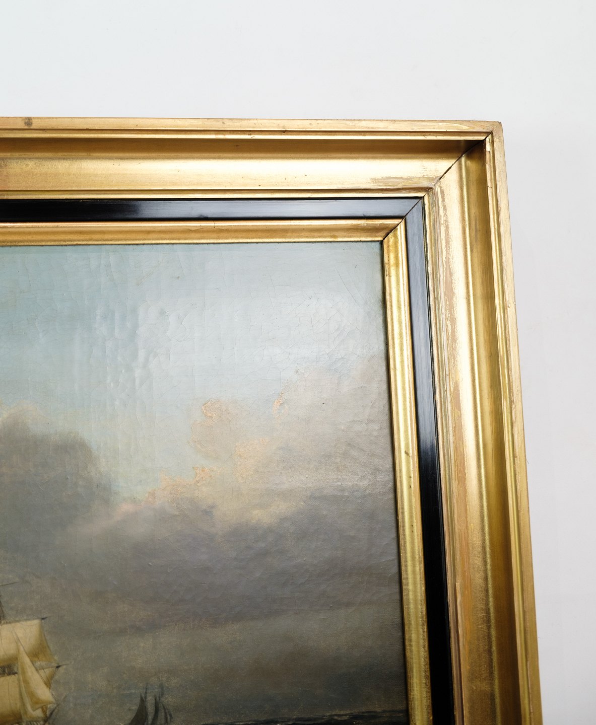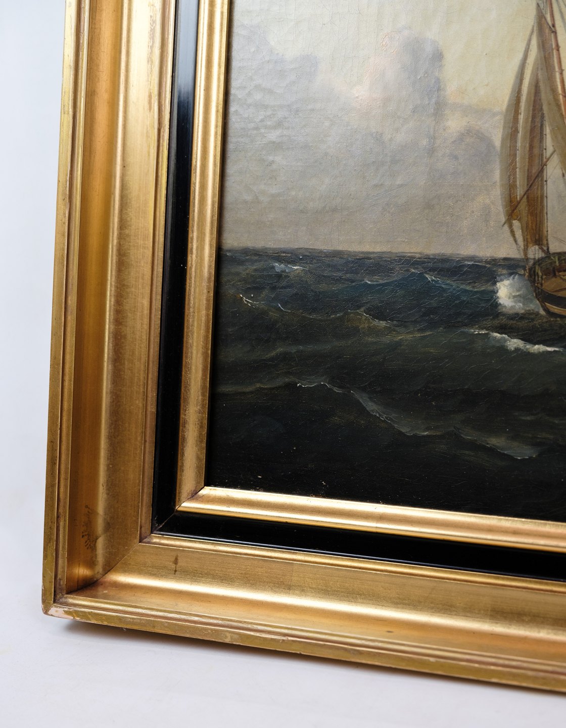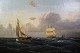 SoldOil painting with motif of sea and boats in a frame with gold leaf by Carl Olsen (1818-1878).