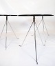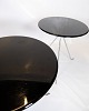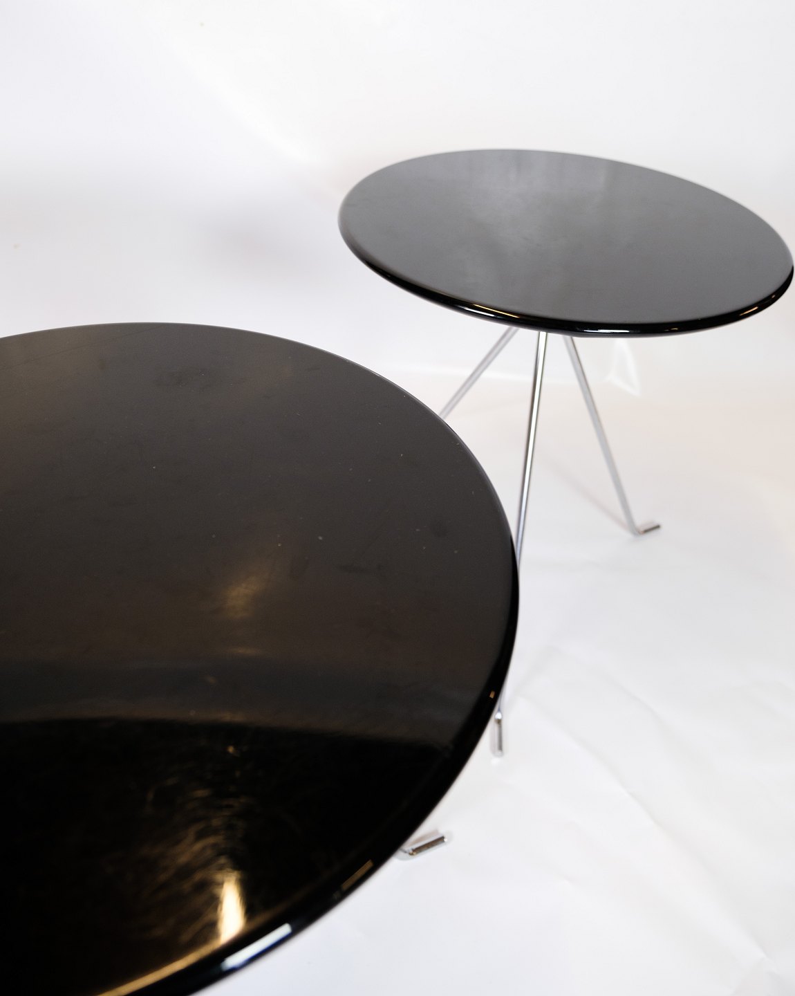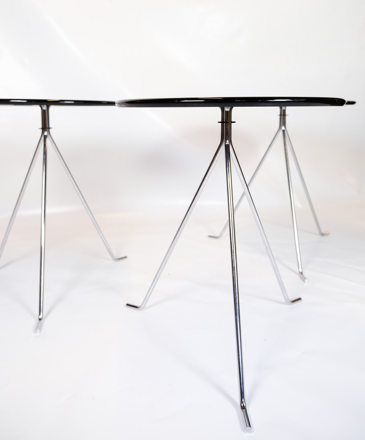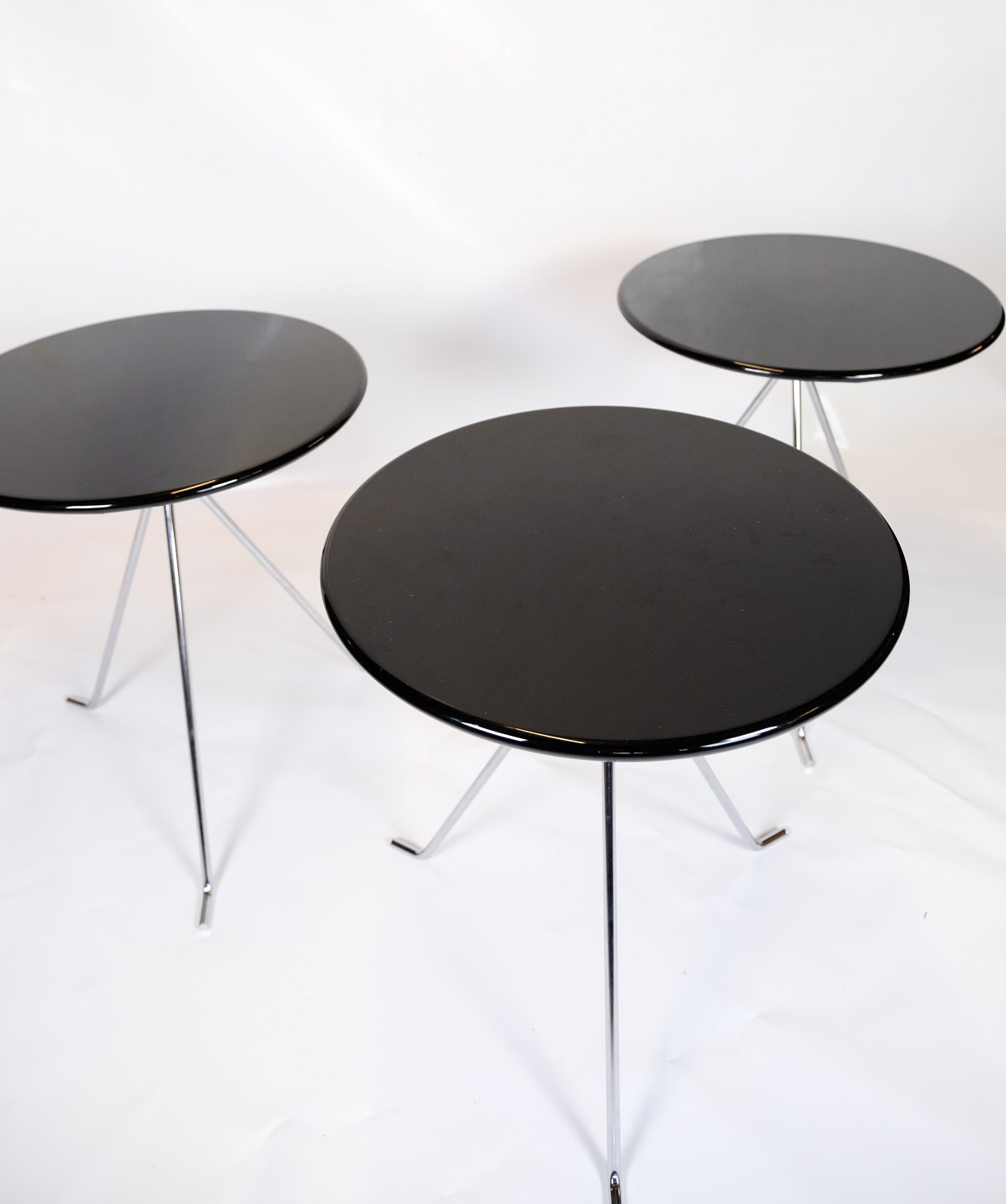 Coffee table set consisting of 3 small round tables with chrome legs with folding mechanism and black surface, originally from Denmark.