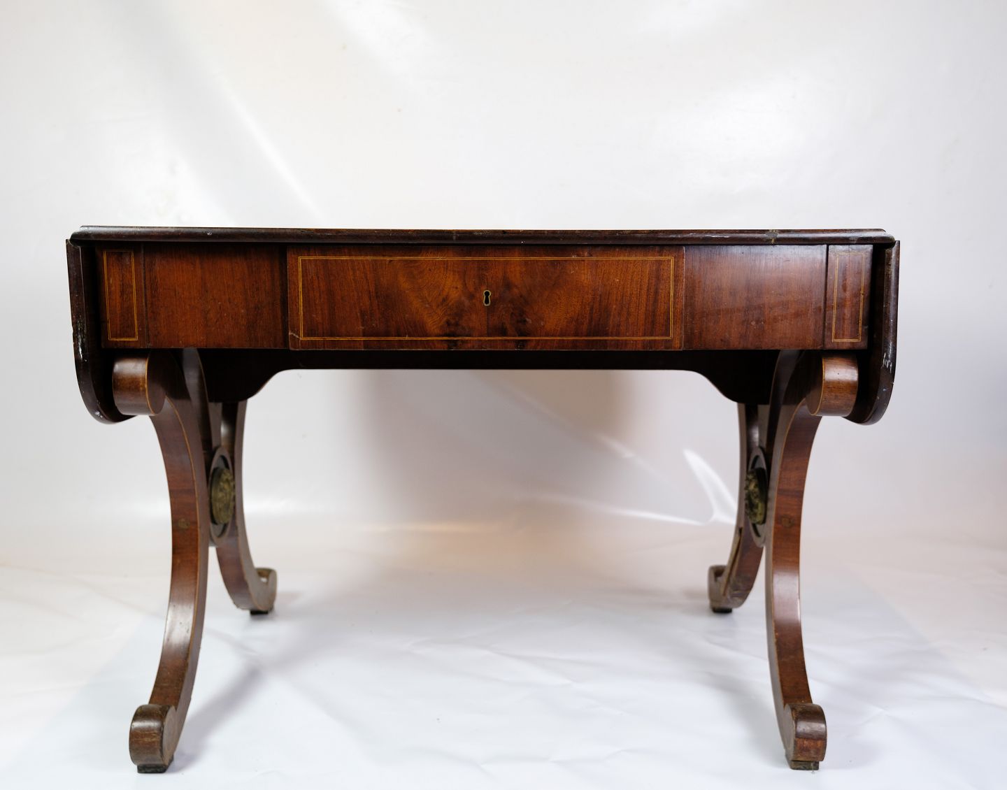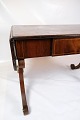 Spisebord af mahogni med klapper og messing udsmykning, samt en skuffe med nøgle fra omkring 1860'erne.