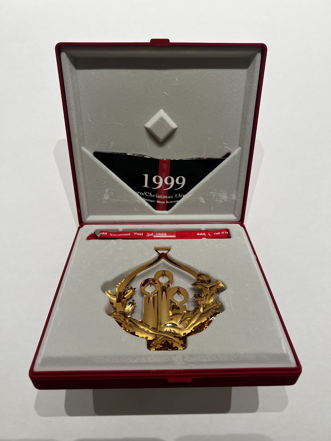 Georg Jensen's Christmas clock from 1999 is entitled "Christmas lights" and was designed by Nina Schrøder. The clock is made of gilded brass and measures 9 cm in height.