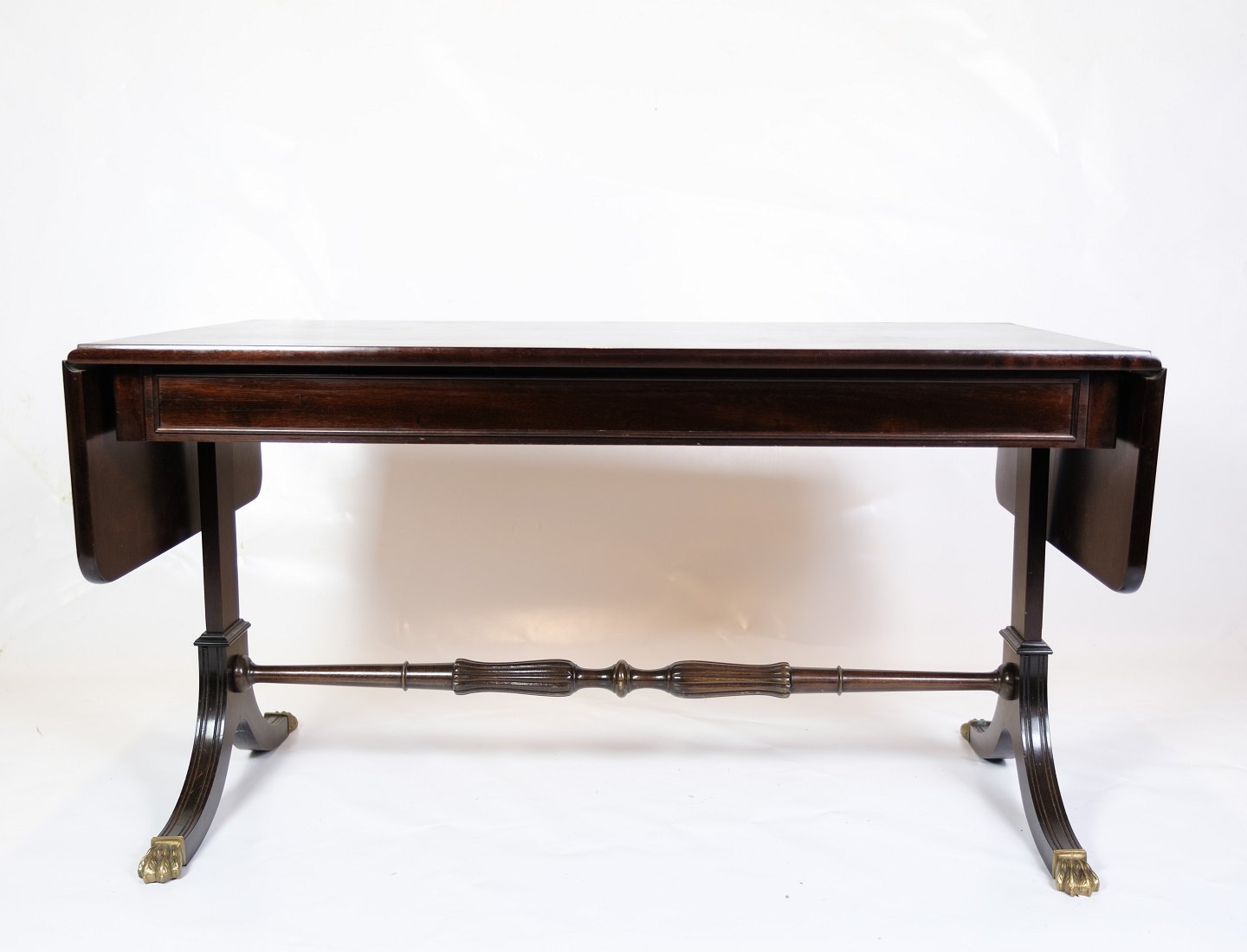 Mahogany coffee table by a Danish master carpenter decorated with lion feet of brass and wood carvings from around the 1920s.