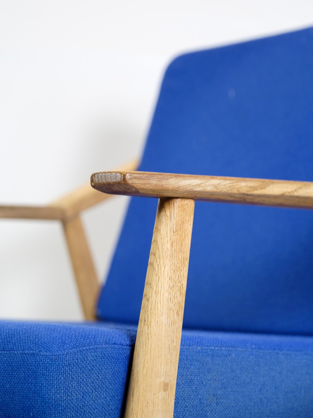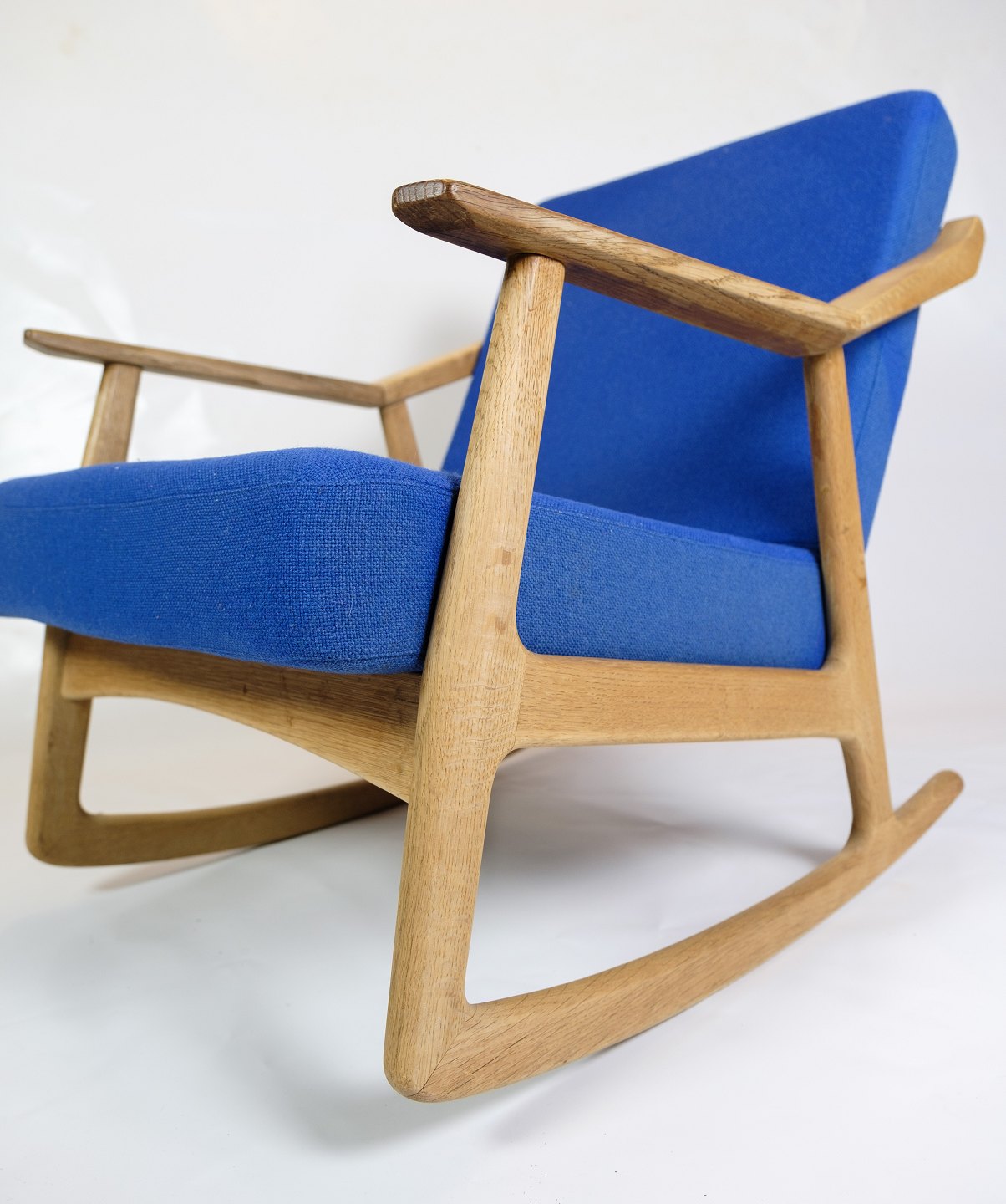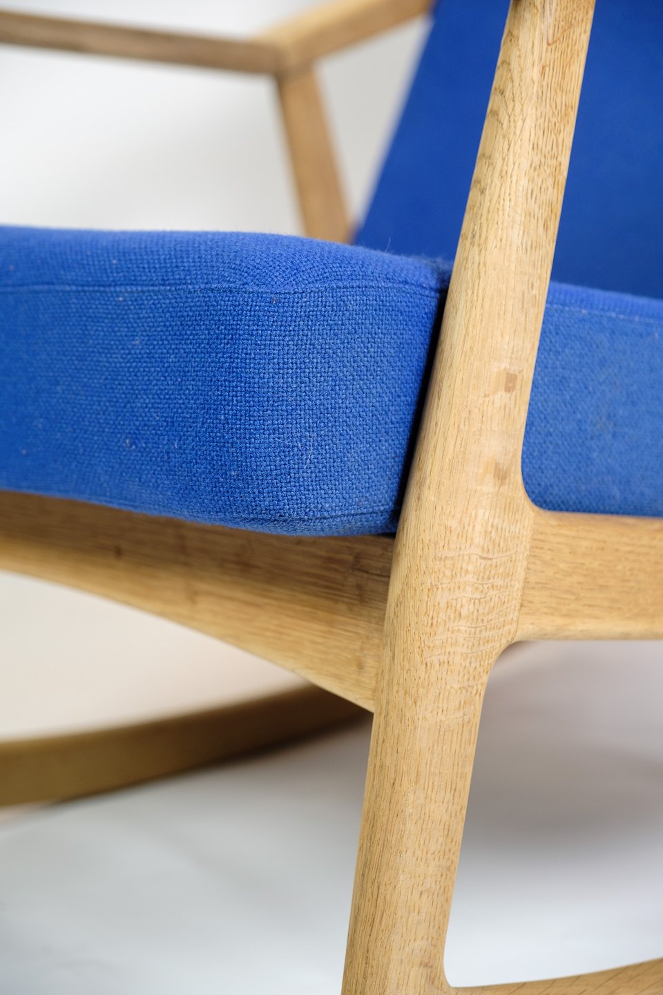 Med sit elegante og strømlinede design er gyngestolen et symbol på den skandinaviske modernismes tidløse stil. Den er konstrueret af robust egetræ, hvilket giver både styrke og en naturlig skønhed til møblet.
