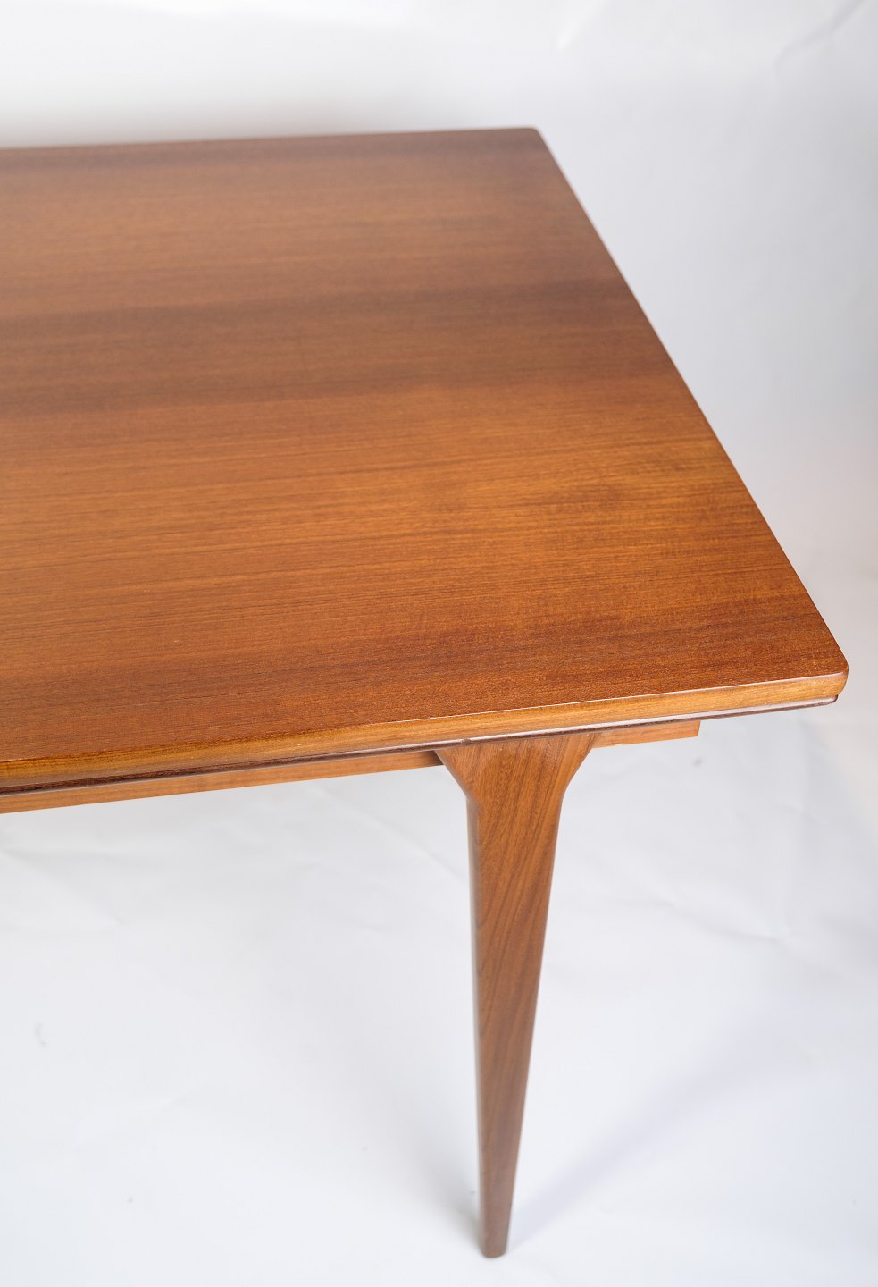 Dining table of Danish design with Dutch extension made in teak wood by Vejle Møbelfabrik from around the 1960s.