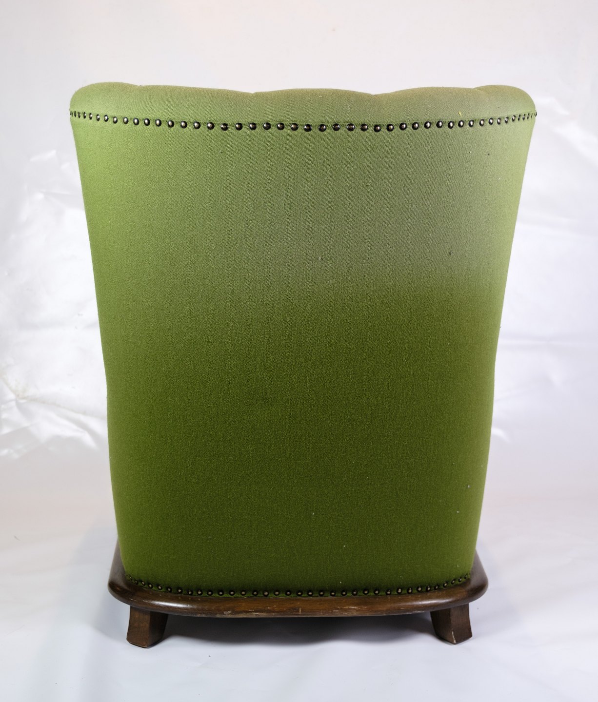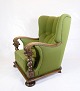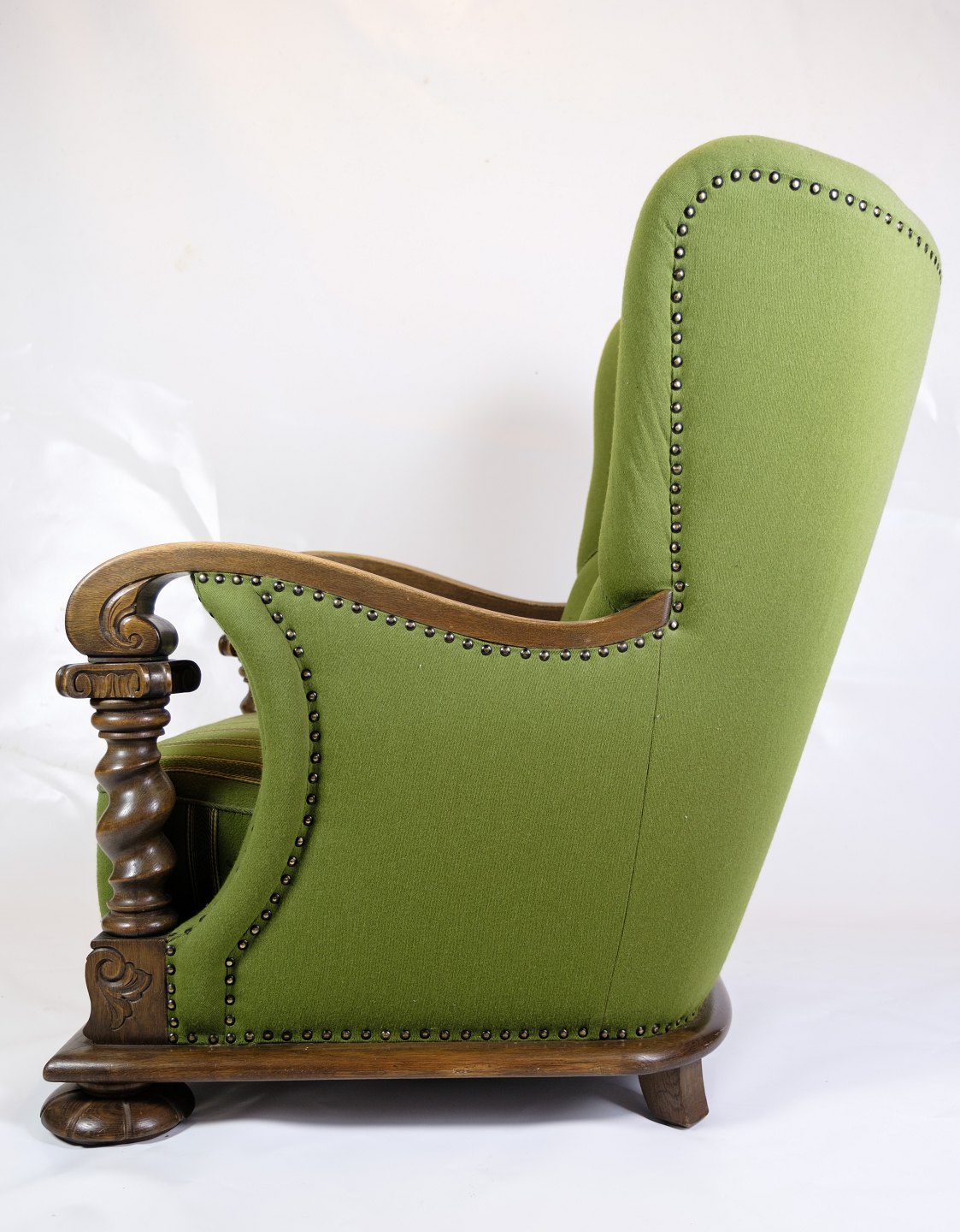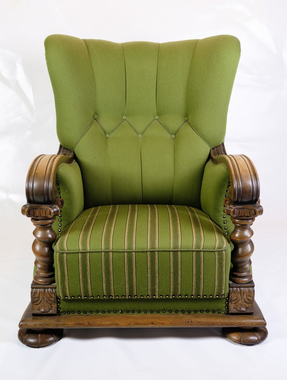 A high-backed armchair from the Renaissance period upholstered in green fabric and decorated with hand-crafted wood carvings from around the 1920s is an impressive piece of furniture craftsmanship with a timeless aesthetic.