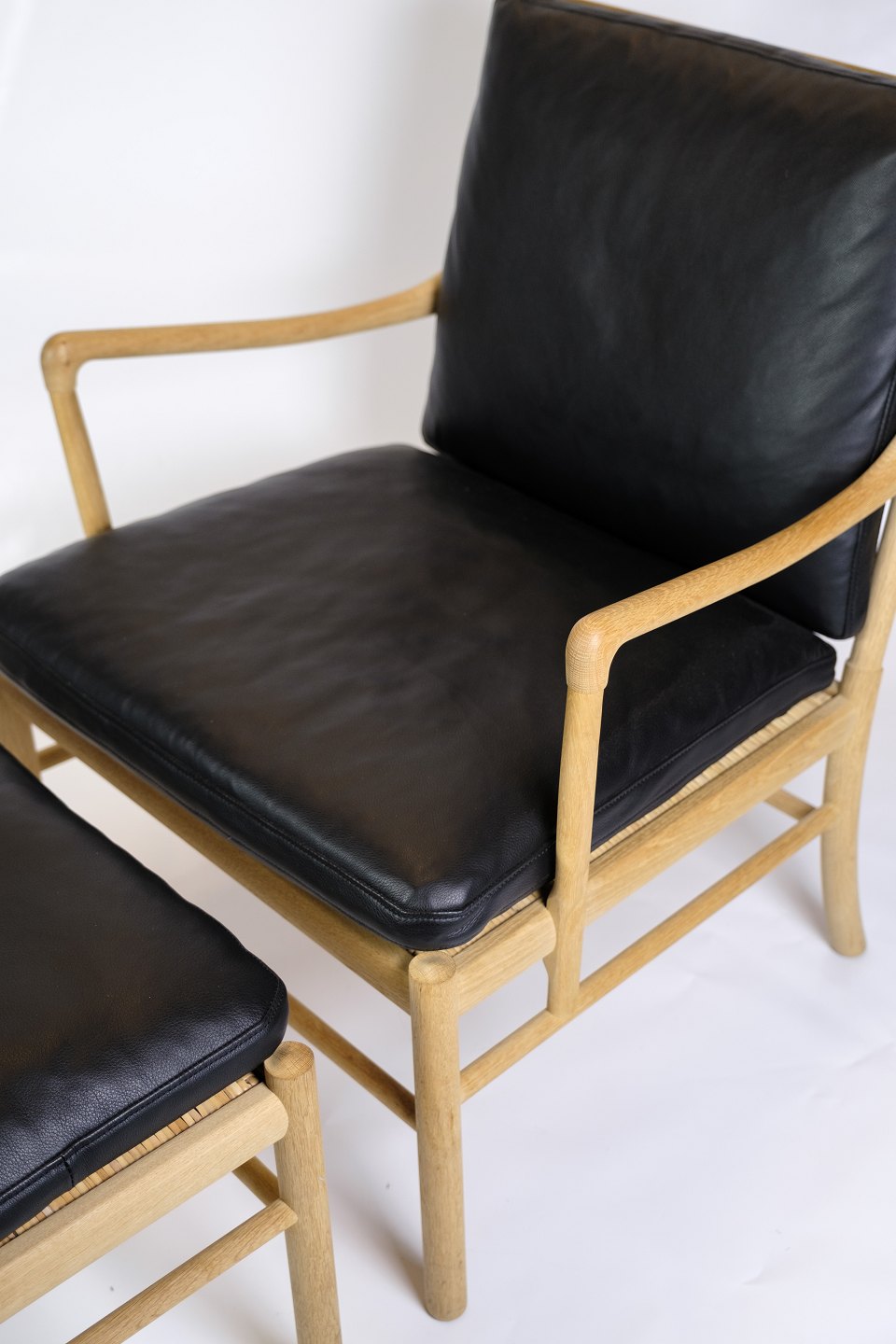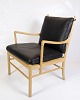 SoldAn oak armchair, model OW149, with black leather cushions designed by Ole Wanscher and manufactured by PJ Møbler in the 1960s, is a masterpiece of timeless elegance and exceptional craftsmanship.