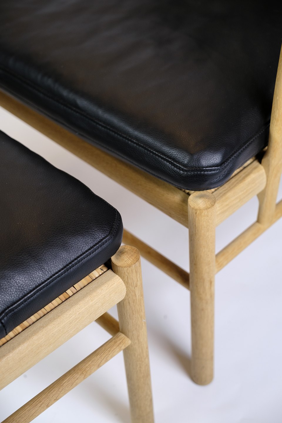 The oak's natural warmth and elegant grain structure, combined with the black leather cushion, contribute to the chairs' timeless appeal. The accompanying footstool adds extra comfort and completes the experience of luxury and well-being.